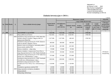 Załącznik Nr 3 do Uchwały Nr XXI/ /2013 Rady Powiatu Grudziądzkiego z dnia 30 grudnia 2013 roku w sprawie uchwalenia budżetu Powiatu Grudziądzkiego na 2014 rok Zadania inwestycyjne w 2014 r. w złotych Planowane wydatki z tego źródła finansowania Lp. Dział Rozdz. 1 2 1. 600 3 § Nazwa zadania inwestycyjnego Łączne koszty finansowe 4 5 6 TRANSPORT I ŁĄCZNOŚĆ 60014 Drogi publiczne powiatowe 6050 Przebudowa drogi powiatowej Nr 1395C Biały BórWałdowo-Ruda na odcinku o długości 980 m w miejscowości Biały Bór Przebudowa drogi powiatowej Nr 1419C ZielnowoGziki na odcinku o długości 1824 m Budowa wiaty na sól drogową i mieszankę piasku z solą na terenie siedziby PZD Budowa chodników - zakup usług Budowa chodnika w miejscowości Nowa Wieś w ciągu drogi powiatowej Nr 1352C Parski-Grudziądz Przebudowa drogi powiatowej Nr 1375C JankowiceŚwięte wraz z dokumentacją ( I etap ) Przebudowa drogi powiatowej Nr 1380C GrudziądzNicwałd wraz z dokumentacją ( I etap ) Przebudowa drogi powiatowej Nr 1368C Szembruczek-Nowe Mosty wraz z dokumentacją ( I etap ) Przebudowa ogrodzenia siedziby PZD 6060 Zakup materiałów do budowy chodników Zakup piaskarki Zakup pługa odśnieżnego rok budżetowy 2014 dochody własne kredyty (8+9+10+11) jst i pożyczki 7 8 9 środki pochodzące z innych źródeł* 10 7 621 061 7 621 061 5 624 501 1 996 560 7 621 061 7 621 061 5 624 501 1 996 560 2 437 000 2 437 000 440 440 1 996 560 400 000 400 000 400 000 601 000 601 000 601 000 95 000 95 000 95 000 350 000 350 000 350 000 575 000 575 000 575 000 1 000 000 1 000 000 1 000 000 1 120 000 1 120 000 1 120 000 60 000 100 000 80 000 25 000 60 000 100 000 80 000 25 000 60 000 100 000 80 000 25 000 Jednostka organizacyjna realizująca środki program lub wymienione koordynująca w art. 5 ust. 1 wykonanie pkt 2 i 3 u.f.p. programu 11 12 Powiatowy Zarząd Dróg 6300 Dotacja celowa na pomoc fin. udzielaną między jst z przeznaczeniem na dotację dla Gminy Grudziądz na realizację zadania pn. "Przebudowa drogi gminnej Nr 40147C Biały Bór- Mały Rudnik" 2. DZIAŁALNOŚĆ USŁUGOWA 710 71014 3 750 75020 Opracowania geodezyjne i kartograficzne 6060 Zakup trzech zestawów komputerowych Zakup serwera Zakup urządzeń peryferyjnych do komputerów Wyposażenie serwerowni Zakup mebli i wyposażenia do pomieszczeń w których gromadzony i udostepniany jest państwowy zasób geodezyjny i kartograficzny Zakup niezbędnego oprogramowania do prowadzenia zasobu geodezyjnego i kartograficznego oraz oprogramowania wspierającego prowadzenie postępowań administracyjnych ADMINISTRACJA PUBLICZNA Starostwa powiatowe Przebudowa sieci kanalizacji deszczowej przy 6050 budynku Starostwa Powiatowego 851 85195 6300 778 061 778 061 99 000 99 000 99 000 99 000 12 000 10 000 12 000 10 000 99 000 12 000 10 000 12 000 10 000 99 000 12 000 10 000 12 000 10 000 10 000 10 000 10 000 45 000 45 000 45 000 Starostwo Powiatowe 96 270 96 270 96 270 96 270 96 270 15 000 15 000 15 000 15 000 81 270 81 270 81 270 OCHRONA ZDROWIA 10 000 10 000 10 000 Pozostała działalność 10 000 10 000 10 000 Pomoc finansowa dla MiG Łasin w formie dotacji celowej 10 000 10 000 10 000 Dotacja celowa przekazana do Urzędu Marszałkowskiego na współfinansowanie projektu 6639 pn. ,,Infostrada Kujaw i Pomorza - usługi w zakresie E - Administracji i Informacji Przestrzennej" 4. 778 061 OGÓŁEM 7 826 331 7 826 331 5 829 771 1 996 560 x