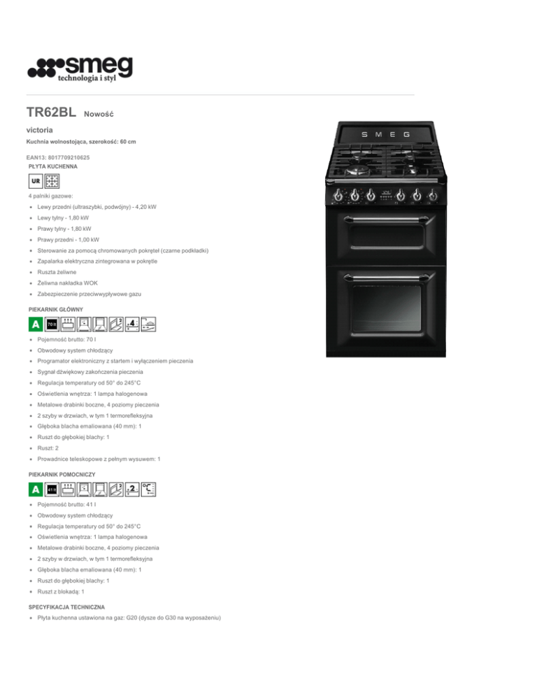 TR62BL Nowość victoria Kuchnia wolnostojąca, szerokość: 60 cm EAN13: 8017709210625 PŁYTA KUCHENNA 4 palniki gazowe: Lewy przedni (ultraszybki, podwójny) - 4,20 kW Lewy tylny - 1,80 kW Prawy tylny - 1,80 kW Prawy przedni - 1,00 kW Sterowanie za pomocą chromowanych pokręteł (czarne podkładki) Zapalarka elektryczna zintegrowana w pokrętle Ruszta żeliwne Żeliwna nakładka WOK Zabezpieczenie przeciwwypływowe gazu PIEKARNIK GŁÓWNY Pojemność brutto: 70 l Obwodowy system chłodzący Programator elektroniczny z startem i wyłączeniem pieczenia Sygnał dźwiękowy zakończenia pieczenia Regulacja temperatury od 50° do 245°C Oświetlenia wnętrza: 1 lampa halogenowa Metalowe drabinki boczne, 4 poziomy pieczenia 2 szyby w drzwiach, w tym 1 termorefleksyjna Głęboka blacha emaliowana (40 mm): 1 Ruszt do głębokiej blachy: 1 Ruszt: 2 Prowadnice teleskopowe z pełnym wysuwem: 1 PIEKARNIK POMOCNICZY Pojemność brutto: 41 l Obwodowy system chłodzący Regulacja temperatury od 50° do 245°C Oświetlenia wnętrza: 1 lampa halogenowa Metalowe drabinki boczne, 4 poziomy pieczenia 2 szyby w drzwiach, w tym 1 termorefleksyjna Głęboka blacha emaliowana (40 mm): 1 Ruszt do głębokiej blachy: 1 Ruszt z blokadą: 1 SPECYFIKACJA TECHNICZNA Płyta kuchenna ustawiona na gaz: G20 (dysze do G30 na wyposażeniu) Moc przyłączeniowa gazu: 8,80 kW Moc przyłączeniowa piekarnika: 5,50 kW Zabezpieczenie: 24 A Napięcie: 220-240 V lub 380-415 V Częstotliwość: 50/60 Hz Functions Piekarnik główny Piekarnik dodatkowy Wersje TR62P - Kremowy Smeg Polska Sp. z o.o. ul. Cybernetyki 9 02-677 Warszawa Tel. +48 22 276 14 00 TR62BL victoria 60 cm czarny rodzaj płyty kuchennej: gazowa rodzaj piekarnika: elektryczny klasa energochłonności A Piekarnik główny WENTYLATOR, GRZAŁKA PIERŚCIENIOWA: Grzałka w połączeniu z wentylatorem zapewniają równomierną temperaturę w całej komorze, na wszystkich półkach. Podczas pieczenia potraw ponad 20 minut, niepotrzebne jest stosowanie wstepnego rozgrzania piekarnika. Jest to metoda dająca oszczędność energii, kótszy czas podgrzewania. idealna do odgrzewania zimnych potraw. Piekarnik dodatkowy GRZAŁKA DOLNA: Funkcja ta jest najbardziej odpowiednia do przygotowania potraw wymagających wysokiej temepratury od spodu, bez potrzeby przypiekania lub do powolnego pieczenia. Do ciast, pizzy, potrawek, lub zapiekanek. GRZAŁKA GÓRNA I DOLNA: Włączenie tych 2 grzałek stosuje się w pieczeniu tradycyjnym, odpowiednim do przygotowanie potraw wymagających delikatnego podgrzewania, jak np. pieczenie ciasta. Piekarnik powinien zostać wstępnie nagrzany do wymaganej temperatury, a naczynie ustawione po środku. Jest to metoda , która najlepiej sprawdza się w przypadku większych, pojedynczych wypieków. GRZAŁKA GRILLA: Funkcja uzywana do szybkiego podgrzewania. Aby uzyskać najlepsze rezultaty należy małe potrawy umieścić na górnej półce, a potrawy większe - na dolnej (np. mięso, lub kiełbasę). Najlepsze efekty uzyskuje się przy zamkniętych drzwiczkach, chyba że przepis podpowiada co innego. 1/2 GRZAŁKA GRILLA: Funkcja uzywana do szybkiego podgrzewania małych potraw. Tylko środkowa część grzałki jest aktywna. Smeg Polska Sp. z o.o. ul. Cybernetyki 9 02-677 Warszawa Tel. +48 22 276 14 00 TR62BL victoria 60 cm czarny rodzaj płyty kuchennej: gazowa rodzaj piekarnika: elektryczny klasa energochłonności A Smeg Polska Sp. z o.o. ul. Cybernetyki 9 02-677 Warszawa Tel. +48 22 276 14 00