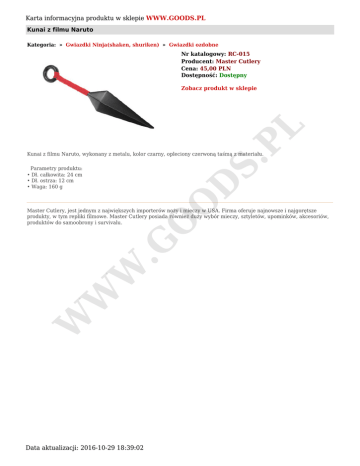 Karta informacyjna produktu w sklepie WWW.GOODS.PL Kunai z filmu Naruto Kategoria: » Gwiazdki Ninja(shaken, shuriken) » Gwiazdki ozdobne Nr katalogowy: RC-015 Producent: Master Cutlery Cena: 45,00 PLN Dostępność: Dostępny S. PL Zobacz produkt w sklepie Kunai z filmu Naruto, wykonany z metalu, kolor czarny, opleciony czerwoną taśmą z materiału. O D Parametry produktu: • Dł. całkowita: 24 cm • Dł. ostrza: 12 cm • Waga: 160 g W W W .G O Master Cutlery, jest jednym z największych importerów noży i mieczy w USA. Firma oferuje najnowsze i najgorętsze produkty, w tym repliki filmowe. Master Cutlery posiada również duży wybór mieczy, sztyletów, upominków, akcesoriów, produktów do samoobrony i survivalu. Data aktualizacji: 2016-10-29 18:39:02