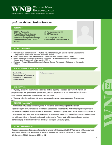 prof. zw. dr hab. Janina Sawicka KONTAKT SGGW w Warszawie Wydział Nauk Ekonomicznych Katedra Polityki Europejskiej, Finansów Publicznych i Marketingu Zakład Polityki Agrarnej i Prawa Rolnego ul. Nowoursynowska 166 02-787 Warszawa Tel: + 48 (22)59 34 082 E-mail: [email protected] WYKSZTAŁCENIE • Profesor nauk ekonomicznych - Wydział Nauk Ekonomicznych, Szkoła Główna Gospodarstwa Wiejskiego w Warszawie, kierunek ekonomia, 2007 r. • Doktor habilitowany nauk ekonomicznych - Wydział Nauk Ekonomicznych, 1994 r. • Doktor nauk ekonomicznych w zakresie ekonomia - Wydział Ekonomiczno_Społeczny, Wyższa Szkoła Nauk Społecznych w Warszawie, 1975 r. • Magister - Wydział Ekonomiki Produkcji, Szkoła Główna Planowania i Statystyki w Warszawie, 1968 r. MIEJSCE PRACY, STANOWISKA Szkoła Główna Gospodarstwa Wiejskiego w Warszawie, Wydział Nauk Ekonomicznych Profesor zwyczajny DYDAKTYKA Wykłady, ćwiczenia i seminaria z zakresu polityki agrarnej i dziedzin pokrewnych, takich jak: polityka rozwoju wsi, gospodarka żywnościowa, polityka gospodarcza w UE, polityka równości szans i inne, zarówno na studiach stacjonarnych jak i zaocznych. • Wykłady w języku angielskim dla studentów zagranicznych w ramach programu Erasmus oraz MEO. OBSZAR NAUKOWY Badania nad aktywizacją zawodową kobiet w rolnictwie, ekonomiką gospodarstw rolnych i pozarolniczych form prowadzenia działalności gospodarczej przez kobiety. Problematyka przedsiębiorczości na obszarach wiejskich rozwijana także w powiązaniu z tematem dotyczącym roli kobiet wiejskich w procesach rozwojowych wsi i rolnictwa. Pozostałe kierunki prowadzonych badań dotyczą bądź to przemian strukturalnych na wsi i w rolnictwie w okresie transformacji systemowej w Polsce, bądź polityki gospodarczej państwa odnoszącej się do przemian w okresie przed i po akcesji do Unii Europejskiej. WYKAZ PUBLIKACJI Rozprawa doktorska: „Społeczno-ekonomiczne funkcje Kół Gospodyń Wiejskich” Warszawa 1975, maszynopis Rozprawa habilitacyjna: Przemiany w sytuacji gospodarstw rolnych kierowanych przez kobiety. Wydawnictwo SGGW, Warszawa 1993, s. 112 1 Książka „profesorska”: Rola kobiet w aktywizacji i wielofunkcyjnym rozwoju obszarów wiejskich. SGGW Warszawa, wyd. SGGW Warszawa 2005; s. 190. 1. Oryginalne opublikowane prace twórcze: (wybrane z ostatnich lat) 1. Rynek pracy na obszarach wiejskich Mazowsza - perspektywa gender. Praca zbiorowa pod red. naukową J. Sawickiej Wyd. SGGW. Warszawa 2013 2. Aktywność zawodowa kobiet wiejskich - perspektywa unijnej polityki równości szans. Zeszyty Naukowe Szkoły Głównej Gospdarstwa Wiejskiego w Warszawie. Polityki Europejskie, Finanse i Marketing. 2012, nr 8 (57), s. 402-410 3. Dylematy polityki równości szans kobiet i mężczyzn (polityki gender) w sferze społecznogospodarczej. Problemy aktywności zawodowej osób z niepełnosprawnością zamieszkałych na obszarach wiejskich / red. Jarosław Żbikowski, Dominik Dąbrowski, Marek Kuźmicki. - Biała Podlaska: Wydawnictwo PSW im. Papieża Jana Pawła II, 2012. - s. 351-365 4. Determinanty konkurencyjności polskiego sektora rolno-żywnościowego - rola popytu turystycznego. Acta Scientiarum Polonorum. Oeconomia 2010, nr 9 (4), s. 445-456 5. Rozwój obszarów wiejskich w świetle reform Wspólnej Polityki Rolnej i polityki spójności Unii Europejskiej. Czynniki rozwoju obszarów wiejskich w gospodarce opartej na wiedzy / pod red. nauk. Wiesława Musiała. -Kraków : Wydawnictwo Uniwersytetu Rolniczego, 2010. - S. 79-90 6. Wpływ kryzysu gospodarczego na przyszłość Polski w strefie euro. Zeszyty Naukowe Szkoły Głównej Gospodarstwa Wiejskiego, wyd. SGGW, Polityki Europejskie, Finanse i Marketing. 2010, nr 4 (53), s. 341-350 7. Internet jako instrument wspierania rozwoju przedsiębiorczości na obszarach wiejskich - teoria i praktyka. Acta Scientiarum Polonorum. Oeconomia 2010, nr 9 (1), s. 97-104 8. Rola kobiet w aktywizacji i wielofunkcyjnym rozwoju obszarów wiejskich. SGGW Warszawa, wyd. SGGW Warszawa 2005; s. 190 9. Polska w Unii Europejskiej - wybrane polityki sektorowe. Wydawnictwo SGGW, Warszawa 2004, s. 312. 10. Założenie i prowadzenie małego przedsiębiorstwa. Wydawnictwo SGGW Warszawa 2000, s. 125 11.Aktywizacja zawodowa kobiet wiejskich ze szczególnym uwzględnieniem drobnej przedsiębiorczości. Tom I i Tom II. Wyd. Fundacja Rozwój SGGW. Warszawa 1998, s. 418 12. Kobieta wiejska w Polsce - Rodzina, praca, gospodarstwo. Wyd. JADRAN Warszawa 1995, redakcja naukowa książki 13. Przemiany w sytuacji gospodarstw rolnych kierowanych przez kobiety. Rozprawa habilitacyjna. Wydawnictwo SGGW, Warszawa 1993, s. 112 2. Podręczniki, skrypty, materiały dydaktyczny: (przygotować wg. wzoru) 1. Polityka regionalna Unii Europejskiej. Unia Europejska : organizacja, funkcjonowanie, korzyści/red. Małgorzata Duczkowska-Piasecka. - Warszawa : Almamer Wyższa Szkoła Ekonomiczna, 2009. 2. Sytuacja kobiet wiejskich na tynku pracy. Tom I i II. Wyd. Wieś Jutra, Warszawa 2008 3. Polska w Unii Europejskiej. Wybrane polityki sektorowe. Wyd. SGGW, Warszawa 2004 3. Inne publikacje: 1. Harmonizacja planowania strategicznego rozwoju z planowaniem budżetowym. Budżet zadaniowy jako nowoczesne narzędzie zarządzania gospodarką narodową / pod red. Agnieszki Siedleckiej. - Biała Podlaska 2 Wydawnictwo Państwowej Szkoły Wyższej im. Papieża Jana Pawła II, 2011. - S. 51-63 2. Sytuacja kobiet wiejskich na rynku pracy i w rolnictwie. Raport: Kongres Kobiet Polskich 2009: kobiety dla Polski, Polska dla kobiet: 20 lat transformacji 1989-2009 - Warszawa, 2009. - s. 24-34 3. Przedsiębiorczość kobiet wiejskich w Polsce i w południowej Dakocie - badania porównawcze. Acta Scientiarum Polonorum. Oeconomia 2007, nr 6 (4), s. 63-70 4. Społeczno-ekonomiczne uwarunkowania rozwoju przedsiębiorczości kobiet wiejskich w Polsce Krajowy System Monitorowania Równego Traktowania Kobiet i Mężczyzn : raporty eksperckie. T. 2. - Warszawa : 