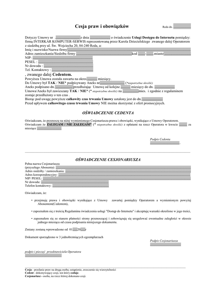 Cesja praw i obowiązków Reda dn. ......................... Dotyczy Umowy nr ............................ z dnia ....................... o świadczenie Usługi Dostępu do Internetu pomiędzy: firmą INTERKAR KOMPUTER-SERWIS reprezentowaną przez Karola Dziecielskiego zwanego dalej Operatorem z siedzibą przy ul. Św. Wojciecha 20, 84-240 Reda, a: Imię i nazwisko/Nazwa firmy ........................................................................................................................................... Adres zamieszkania/Siedziba firmy ...............................................................kod ........-.........miasto .............................. NIP: .................................................................... PESEL : .............................................................. Nr dowodu : ........................................................ Tel. Kontaktowy : ............................................... , zwanego dalej Cedentem. PowyŜsza Umowa została zawarta na okres ........... miesięcy. Do Umowy był TAK / NIE* podpisywany Aneks nr............................ (*niepotrzebne skreślić) Aneks podpisano dn. ................... przedłuŜając Umowę od kolejne ........... miesięcy do dn. ....................... Umowa/Aneks był zawieszany TAK / NIE* (* niepotrzebne skreślić) na ..................mies. i zgodnie z regulaminem zostaje przedłuŜony o ten czas . Biorąc pod uwagę powyŜsze całkowity czas trwania Umowy ustalony jest do dn. ....................... Przed upływem całkowitego czasu trwania Umowy NIE moŜna skorzystać z ofert promocyjnych. OŚWIADCZENIE CEDENTA Oświadczam, Ŝe przenoszę na niŜej wymienionego Cesjonariusza prawa i obowiązki, wynikające z Umowy Operatorem. Oświadczam Ŝe ZALEGAM / NIE ZALEGAM* (* niepotrzebne skreślić) z opłatami na rzecz Operatora w kwocie .......... za miesiące ............................... Podpis Cedenta ....................................... _____________________________________________________________________________________________________________________ OŚWIADCZENIE CESJONARIUSZA Pełna nazwa Cesjonariusza (przyszłego Abonenta): .......................................................................................................................................................................... Adres siedziby / zamieszkania: .............................................................................................................................................................. Adres korespondencyjny: ...................................................................................................................................................................... NIP/ PESEL: .......................................................................................................................................................................................... Nr dowodu: ..................................................................................... Telefon kontaktowy: ....................................................................... Oświadczam, Ŝe: • przejmuję prawa i obowiązki wynikające z Umowy Abonentem(Cedentem), zawartej pomiędzy Operatorem a wymienionym powyŜej • zapoznałem się z treścią Regulaminu świadczenia usługi "Dostęp do Internetu" i akceptuję warunki określone w jego treści, • zapoznałem się ze stanem płatności strony przenoszącej i zobowiązuję się uregulować ewentualne zaległości w okresie jednego miesiąca od czasu podpisania niniejszego dokumentu. Zmiany zostaną wprowadzone od 01......20......r Dokument sporządzono w 3 jednobrzmiących egzemplarzach Podpis Cesjonariusza ....................................... podpis i pieczęć przedstawiciela Operatora .............................................. _____________________________________________________________________________________________________ Cesja - przelanie praw na drugą osobę; ustąpienie, zrzeczenie się wierzytelności Cedent - dokonywający cesji, ten który ceduje. Cesjonariusz - osoba, na rzecz której dokonano cesji.