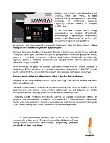 Każdego roku w dniu 31 maja obchodzony jest Światowy Dzień Bez Tytoniu, to część programu Europy wolnej od dymu tytoniowego przyjętego na Konferencji Światowej Organizacji Zdrowia (WHO) w Madrycie w 1988 roku. W tym dniu WHO pragnie zwrócić uwagę społeczeństwa na kwestię zdrowotnych, ekonomicznych i społecznych konsekwencji palenia tytoniu, koncentrując się każdego roku na wybranym aspekcie tego problemu. W bieżącym roku hasło przewodnie obchodów Światowego Dnia Bez Tytoniu brzmi: ,,Stop nielegalnemu obrotowi wyrobami tytoniowymi” . Ramowa Konwencja Światowej Organizacji Zdrowia o Ograniczeniu Użycia Tytoniu definiuje "nielegalny obrót" jako ,,wszelkie praktyki lub postępowanie zabronione przepisami prawa, związane z produkcją, przewozem, odbiorem, posiadaniem, dystrybucją, sprzedażą lub kupnem, łącznie z wszelkimi praktykami lub postępowaniem, których zamiarem jest ułatwienie takiego działania” WHO informuje, że jeden na dziesięć papierosów wypalanych na świecie pochodzi z nielegalnego źródła. W Polsce na podstawie przeprowadzonego w latach 2009-2010 badania GATS wynika iż 8,5 % osób codziennie palących pali papierosy pochodzące z przemytu. Przemyt papierosów jest zjawiskiem, które w bardzo dużym stopniu: -Wpływa na ekonomię dotkniętych nim krajów, powodując znaczne uszczuplenia należności celnych i podatkowych, -Nielegalnie sprzedawane papierosy ze względu na niższą cenę zachęcają młodych ludzi do podejmowania prób palenia (cena wyrobów tytoniowych nie jest jedynym, ale bardzo istotnym elementem decydującym o rozpowszechnieniu palenia tytoniu), -Nielegalny handel wyrobami tytoniowymi wpływa na większą konsumpcję tytoniu, co związane jest bezpośrednio z większą zachorowalnością. Wyeliminowanie nielegalnego handlu tańszymi papierosami ma szanse spowodowania ograniczenia lub zaniechanie palenia a tym samym zmniejszenia liczby zachorowań na choroby odtytoniowe. W dymie tytoniowym zawartych jest ponad 4 000 związków chemicznych, w tym ponad 40 znanych czynników rakotwórczych oraz szereg środków toksycznych. Nie istnieje bezpieczny poziomu narażenia na dym tytoniowy. Palenie tytoniu niesie za sobą poważne skutki zdrowotne. Palacze są szczególnie narażeni min na: - Nowotwory: płuc, krtani, przełyku, gardła, pęcherz, szyjki macicy, nerek, jamy ustnej, trzustki, żołądka - Choroby układu krążenia- chorobę niedokrwienną serca, zawał mięśnia sercowego, miażdżycę zarostową kończyn dolnych, nadciśnienie tętnicze, tętniaka aorty - Choroby układu oddechowego: płuc (np. rozedma płuc, zapalenie oskrzeli, płuc, przewlekła obturacyjna choroba płuc) Palenie tytoniu nie tylko naraża na utratę zdrowia, ale i pogarsza wygląd skóry. Wcześniej występują zmarszczki, opóźnia się gojenie ran. Palenie zaostrza stan wielu schorzeń skóry (np. trądzik oraz łuszczycę), dermatolodzy mówią o „tytoniowej twarzy”. Palenie papierosów jest powodem przebarwień zębów, żółtych palców, nieświeżego oddechu. Światowa Organizacja Zdrowia szacuje, że w XX wieku z powodu palenia tytoniu zmarło 100 mln ludzi. Obecnie każdego roku liczba zgonów odtytoniowych na świecie przekracza 5 milionów. Należy pamiętać iż bierne palenie jest tak samo szkodliwe jak palenie czynne. W strumieniu bocznym stwierdzono aż 35 razy więcej dwutlenku węgla i 4 razy więcej nikotyny niż w dymie wdychany przez aktywnych palaczy! Palenie tytoniu przez kobiety ciężarne niekorzystnie wpływa na przebieg ciąży i stan zdrowia dziecka. Wśród kobiet palących stwierdzono zwiększone ryzyko wystąpienia powikłań jak np.: poronienie samoistne, przedwczesne pęknięcie pęcherza płodowego, przedwczesne odklejanie łożyska oraz łożysko przodujące. Dzieci palących matek mają niższą masę urodzeniową. Liczne badania epidemiologiczne wskazują palenie papierosów podczas ciąży zwiększa ryzyko wystąpienia zespołu nagłej śmierci łóżeczkowej dziecka. Rzucając palenie absolutnie niczego się nie traci, można tylko zyskać. Nagrodą jest lepsza kondycja fizyczna, rzadsze infekcje dróg oddechowych, brak porannego kaszlu. Oddala się od perspektywa wielu chorób, które są następstwem palenia tytoniu. Najważniejsza jest motywacja. Trzeba uświadomić sobie, że chociaż nie jest to łatwa możliwy jest sukces. Nie wolno zrażać się chwilowym niepowodzeniem, nie wolno rezygnować i poddawać się. Warto skorzystać z pomocy specjalistów. TELEFONICZNA PORADNIA POMOCY PALĄCYM 801 108 108 Źródło: -Raport z ogólnopolskiego badania ankietowego nt. postaw wobec palenia tytoniu (GIS 2013) -Medycyna praktyczna –Konsensus dotyczący rozpoznawania i leczenia zespołu uzależnienia od tytoniu, wydanie specjalne 7/2006 -Ramowa Konwencja Światowej Organizacji Zdrowia o Ograniczeniu Użycia Tytoniu (2003) -http://www2.mz.gov.pl/wwwmz/index?mr=m9&ms=&ml=pl&mi=91&mx=0&ma=18876 -http://www.mf.gov.pl/documents/764034/2288248/Przemyt+wyrob%C3%B3w+tytoniowych.pdf -http://www.kodekswalkizrakiem.pl/swiatowy-dzien-bez-tytoniu-2015-zatrzymac-nielegalny-handelwyrobami-tytoniowymi/ Opracowanie: M. Droździk Dział Zdrowia Publicznego i Promocji Zdrowia tel: 12 25 49 503 [email protected]