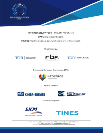 KONGRES KOLEJOWY 2015 – PROJEKT PROGRAMU DATA: 28 października 2015 MIEJSCE: Międzynarodowe Centrum Kongresowe w Katowicach Organizatorzy: Gospodarz Kongresu Kolejowego 2015: Partner Srebrny: Partnerzy brązowi: ADRES FIRMY Zespół Doradców Gospodarczych TOR Sp. z o.o., Plac Bankowy 2, 00-095 Warszawa TEL. +48 22 323 77 44 E-MAIL [email protected] INTERNET www.kongreskolejowy.pl www.rynek-kolejowy.pl www.tor-konferencje.pl Patronat honorowy: ADRES FIRMY Zespół Doradców Gospodarczych TOR Sp. z o.o., Plac Bankowy 2, 00-095 Warszawa TEL. +48 22 323 77 44 E-MAIL [email protected] INTERNET www.kongreskolejowy.pl www.rynek-kolejowy.pl www.tor-konferencje.pl Partnerzy merytoryczni: Partnerzy medialni: Partner PR: ADRES FIRMY Zespół Doradców Gospodarczych TOR Sp. z o.o., Plac Bankowy 2, 00-095 Warszawa TEL. +48 22 323 77 44 E-MAIL [email protected] INTERNET www.kongreskolejowy.pl www.rynek-kolejowy.pl www.tor-konferencje.pl RADA PROGRAMOWA Tadeusz Syryjczyk, Partner, Zespół Doradców Gospodarczych TOR Leszek Baj, Dziennikarz, Gazeta Wyborcza Jacek Bieczek, Prezes Zarządu, CTL Logistics Radosław Czapski, Koordynator Projektów Transportowych i Infrastrukturalnych, Bank Światowy Łukasz Malinowski, Dyrektor ds. wydawniczych, Redaktor naczelny miesięcznika "Rynek Kolejowy" Krystyna Pękała, Prezes Zarządu, Szybka Kolej Miejska Sp. z o.o. Piotr Rachwalski, Prezes Zarządu, Koleje Dolnośląskie S.A. dr Marcin Radwan-Röhrenschef, Radwan-Röhreschef Spółka komandytowa Paweł Szaciłło, p.o. Dyrektor, Centrum Unijnych Projektów Transportowych Marita Szustak, Wiceprezes Zarządu, Railway Business Forum Tomasz Szuba, Prezes Zarządu, „Inicjatywa dla Infrastruktury” prof. UE dr hab. Robert Tomanek, Prorektor ds. organizacji, Finansów i Rozwoju, Uniwersytet Ekonomiczny w Katowicach Andrzej Wasilewski, Prezes Zarządu, Łódzka Kolej Aglomeracyjna Sp. z o.o. Włodzimierz Wilkanowicz, Prezes Zarządu, Koleje Wielkopolskie Sp. z o.o. RAMY PROGRAMU: 27.10.2015: UROCZYSTY BANKIET I WRĘCZENIE NAGRÓD W KONKURSIE PRZYJACIEL KOLEI 28.10.15: KONGRES KOLEJOWY 2015 PROGRAM RAMOWY KONGRESU KOLEJOWEGO 2015 od 8:30 REJESTRACJA I POWITALNA KAWA 9:15 UROCZYSTE POWITANIE UCZESTNIKÓW CZĘŚĆ 1: POLSKA KOLEJ W ROKU 2020 – JAKIE CELE CHCEMY OSIĄGNĄĆ 9:30 WYSTĄPIENIE WPROWADZAJĄCE ADRES FIRMY Zespół Doradców Gospodarczych TOR Sp. z o.o., Plac Bankowy 2, 00-095 Warszawa TEL. +48 22 323 77 44 E-MAIL [email protected] INTERNET www.kongreskolejowy.pl www.rynek-kolejowy.pl www.tor-konferencje.pl RAILWAY BUSINESS FORUM: PREZENTACJA BIAŁEJ KSIĘGI KOLEJOWEJ 2015 9:50 Adrian Furgalski, Przewodniczący Forum Kolejowego – Railway Business Forum DEBATA: POLSKI RYNEK KOLEJOWY U PROGU NOWEJ PERSPEKTYWY BUDŻETOWEJ UE jakie czynniki stymulują rozwój rynku a jakie go ograniczają jak będzie wyglądał polski rynek kolejowy na zakończenie nowej perspektywy budżetowej UE? Uczestnicy: Przedstawiciel Ministerstwa Infrastruktury i Rozwoju* 10:10 Janusz Piechociński, Wicepremier, Minister Gospodarki Jakub Karnowski, Prezes Zarządu, PKP S.A.* Przedstawiciel PKP PLK* Marcin Krupa, Prezydent Katowic* Stanisław Dąbrowa, Wicemarszałek Województwa Śląskiego Adrian Furgalski, Przewodniczący Forum Kolejowego – Railway Business Forum 11:20 PRZERWA KAWOWA 11:20 – 11:40 BRIEFING PRASOWY CZĘŚĆ 2: POLSKI I EUROPEJSKI RYNEK KOLEJOWYCH PRZEWOZÓW TOWAROWYCH WYSTĄPIENIE WPROWADZAJĄCE: Racjonalna polityka kształtowania stawek 11:40 dostępu do Infrastruktury a model funkcjonalno-operacyjny PKP PLK Tadeusz Syryjczyk, Partner, Zespół Doradców Gospodarczych TOR ADRES FIRMY Zespół Doradców Gospodarczych TOR Sp. z o.o., Plac Bankowy 2, 00-095 Warszawa TEL. +48 22 323 77 44 E-MAIL [email protected] INTERNET www.kongreskolejowy.pl www.rynek-kolejowy.pl www.tor-konferencje.pl 12:00 WYSTĄPIENIE WPROWADZAJĄCE DO DEBATY: DEBATA: Rozwój rynku kolejowych przewozów towarowych jako czynnik pobudzający inwestycje w nowej perspektywie finansowej Fuzje, akwizycje, konsolidacja – czy to naturalny scenariusz dla środkowoeuropejskiego rynku kolejowych przewozów towarowych Od przewoźnika kolejowego do operatora logistycznego – jak skutecznie przeprowadzić taką transformację Polski rynek wagonów towarowych 12:20 Uczestnicy: Adam Purwin , Prezes Zarządu, PKP Cargo* Jacek Bieczek, Prezes Zarządu, CTL Logistics* Henryk Gruca, Prezes Zarządu, Lotos Kolej* Konstantin Skorik, Prezes Zarządu Freightliner PL* Przedstawiciel Ministerstwa Infrastruktury i Rozwoju Tadeusz Syryjczyk, Partner, Zespół Doradców Gospodarczych TOR Jerzy Polaczek, Poseł na Sejm RP* 13:20 LUNCH + NETWORKING CZĘŚĆ 3: INTEGRACJA POLSKIEGO RYNKU DALEKOBIEŻNYCH ,REGIONALNYCH I AGLOMERACYJNYCH PRZEWOZÓW PASAŻERSKICH WYSTĄPIENIE: Przewozy Regionalne, największy pasażerski przewoźnik kolejowy w Polsce w nowej odsłonie 14:20 Aleksandra Magaczewska, Prezes Zarządu, Agencja Rozwoju Przemysłu S.A.* 14:40 DYSKUSJA WPROWADZAJĄCA: Jak optymalnie wykorzystać zasoby i ADRES FIRMY Zespół Doradców Gospodarczych TOR Sp. z o.o., Plac Bankowy 2, 00-095 Warszawa TEL. +48 22 323 77 44 E-MAIL [email protected] INTERNET www.kongreskolejowy.pl www.rynek-kolejowy.pl www.tor-konferencje.pl potencjał Przewozów Regionalnych? Uczestnicy: Aleksandra Magaczewska, Prezes Zarządu, Agencja Rozwoju Przemysłu S.A.* Tomasz Pasikowski, Prezes Zarządu, Przewozy Regionalne* Cezary Przybylski, Marszałek Województwa Dolnośląskiego* DABATA: Statystyki pasażerskich przewozów kolejowych – co mówią o kliencie, co mówią o rynku Uczestnicy: Jacek Leonkiewicz, Prezes Zarządu, PKP Intercity* 15:20 Tomasz Pasikowski, Prezes Zarządu, Przewozy Regionalne* Prezes Zarządu, Koleje Śląskie* Piotr Bezulski, Dyrektor Zarządzający, Polski Bus* Prof. UE dr hab. Robert Tomanek, Prorektor ds. Organizacji, Finansów i Rozwoju, Uniwersytet Ekonomiczny w Katowicach Przedstawiciel sektora lotniczego 16:10 Przerwa kawowa CZĘŚĆ 4: DEBATY RÓWNOLEGŁ