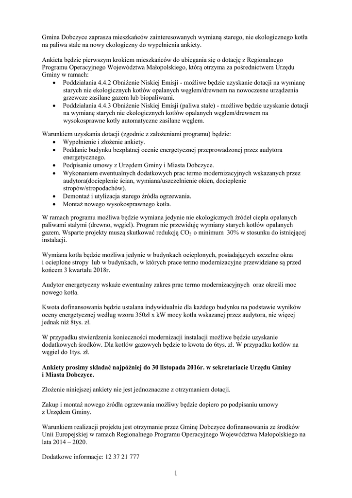 Gmina Dobczyce zaprasza mieszkańców zainteresowanych wymianą starego, nie ekologicznego kotła na paliwa stałe na nowy ekologiczny do wypełnienia ankiety. Ankieta będzie pierwszym krokiem mieszkańców do ubiegania się o dotację z Regionalnego Programu Operacyjnego Województwa Małopolskiego, którą otrzyma za pośrednictwem Urzędu Gminy w ramach: Poddziałania 4.4.2 Obniżenie Niskiej Emisji - możliwe będzie uzyskanie dotacji na wymianę starych nie ekologicznych kotłów opalanych węglem/drewnem na nowoczesne urządzenia grzewcze zasilane gazem lub biopaliwami. Poddziałania 4.4.3 Obniżenie Niskiej Emisji (paliwa stałe) - możliwe będzie uzyskanie dotacji na wymianę starych nie ekologicznych kotłów opalanych węglem/drewnem na wysokosprawne kotły automatyczne zasilane węglem. Warunkiem uzyskania dotacji (zgodnie z założeniami programu) będzie: Wypełnienie i złożenie ankiety. Poddanie budynku bezpłatnej ocenie energetycznej przeprowadzonej przez audytora energetycznego. Podpisanie umowy z Urzędem Gminy i Miasta Dobczyce. Wykonaniem ewentualnych dodatkowych prac termo modernizacyjnych wskazanych przez audytora(docieplenie ścian, wymiana/uszczelnienie okien, docieplenie stropów/stropodachów). Demontaż i utylizacja starego źródła ogrzewania. Montaż nowego wysokosprawnego kotła. W ramach programu możliwa będzie wymiana jedynie nie ekologicznych źródeł ciepła opalanych paliwami stałymi (drewno, węgiel). Program nie przewiduję wymiany starych kotłów opalanych gazem. Wsparte projekty muszą skutkować redukcją CO2 o minimum 30% w stosunku do istniejącej instalacji. Wymiana kotła będzie możliwa jedynie w budynkach ocieplonych, posiadających szczelne okna i ocieplone stropy lub w budynkach, w których prace termo modernizacyjne przewidziane są przed końcem 3 kwartału 2018r. Audytor energetyczny wskaże ewentualny zakres prac termo modernizacyjnych oraz określi moc nowego kotła. Kwota dofinansowania będzie ustalana indywidualnie dla każdego budynku na podstawie wyników oceny energetycznej według wzoru 350zł x kW mocy kotła wskazanej przez audytora, nie więcej jednak niż 8tys. zł. W przypadku stwierdzenia konieczności modernizacji instalacji możliwe będzie uzyskanie dodatkowych środków. Dla kotłów gazowych będzie to kwota do 6tys. zł. W przypadku kotłów na węgiel do 1tys. zł. Ankiety prosimy składać najpóźniej do 30 listopada 2016r. w sekretariacie Urzędu Gminy i Miasta Dobczyce. Złożenie niniejszej ankiety nie jest jednoznaczne z otrzymaniem dotacji. Zakup i montaż nowego źródła ogrzewania możliwy będzie dopiero po podpisaniu umowy z Urzędem Gminy. Warunkiem realizacji projektu jest otrzymanie przez Gminę Dobczyce dofinansowania ze środków Unii Europejskiej w ramach Regionalnego Programu Operacyjnego Województwa Małopolskiego na lata 2014 – 2020. Dodatkowe informacje: 12 37 21 777 1 ANKIETA Dla mieszkańców Gminy Dobczyce zainteresowanych uzyskaniem dotacji na wymianę starych źródeł ciepła opalanych paliwami stałymi. I. DANE WNIOSKODAWCY 1. Nazwisko, imię ………………………………………………….…………………………………………. 2. Telefon/mail ………………………………………………….…………………………………………….. 3. Adres zamieszkania: a. Miejscowość ………….……………………….…..…… Kod pocztowy ….……..……………………… b. Ulica………………..…………………………………… Nr domu/Nr lokalu….….……………………… 4. Adres do korespondencji a. Miejscowość ………….……………………….…..…… Kod pocztowy ….……..…………………….…. b. Ulica………………..…………………………………… Nr domu/Nr lokalu….….……………………… II. LOKALIZACJA ZADANIA planowanego do wykonania 1. Miejscowość ……….………………………………………… Kod pocztowy .……..….…………….……. 2. Obr ….………………... Nr działki …………………… 3. Ulica ………………..………………………………………… Nr domu/Nr lokalu……….……………...… 4. Tytuł prawny do nieruchomości własność współwłasność użytkowanie wieczyste inne (jakie) ……………………………………………………………………………………………... III.PODSTAWOWE INFORMACJE O BUDYNKU, w którym planowana jest wymiana kotła 1. Rodzaj budynku Wolnostojący Bliźniak Szeregowiec Całoroczny Sezonowy 2. Powierzchnia lokalu faktycznie ogrzewana likwidowanymi piecami/kotłowniami na paliwa stałe ………..…………….m2 3. Moc likwidowanych piecy / kotłowni ………………..…………kW 4. Liczba pieców na paliwo stałe planowanych do trwałej likwidacji ………………..…………szt 5. Data produkcji likwidowanych piecy ……………………… 6. Ilość paliwa stałego/węgla zużyta w sezonie grzewczym 2015/2016 …….………………… ton 7. Ocieplenie ścian: Tak Nie 8. Ocieplenie dachu/stropodachu: Tak Nie 9. Okna: Pcv Drewno Inne (jakie) …………………………………………………………………………………….…… 10. Stan okien: Dobry Dostateczny Zły 2 11. Przygotowanie ciepłej wody poprzez: Kocioł/piec Piecyk gazowy Bojler elektryczny Kolektory słoneczne Inne (jakie) ………………………………………………………………………..………………. IV.CHARAKTERYSTYKA ZADANIA 1. Moc planowanego do zainstalowania źródła ogrzewania ………………..……………………kW 2. Rodzaj planowanego do zainstalowania ogrzewania: Ogrzewanie gazowe Ogrzewanie paliwami stałymi (węgiel) w piecach wysokiej sprawności Ogrzewanie biomasą (pellet) w piecach wysokiej sprawności Inne (jakie) …………………………………………………………………