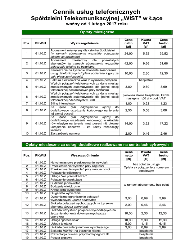 Cennik usług telefonicznych Spółdzielni Telekomunikacyjnej „WIST” w Łące ważny od 1 lutego 2017 roku Opłaty miesięczne Poz. PKWiU 1 61.10.Z 2 61.10.Z 3 61.10.Z 4 61.10.Z 5 61.10.Z 6 61.10.Z 7 61.10.Z 8 61.10.Z 9 61.10.Z 10 61.10.Z Wyszczególnienie Abonament miesięczny dla członka Spółdzielni (w ramach abonamentu wszystkie połączenia lokalne są bezpłatne) Abonament miesięczny dla pozostałych abonentów (w ramach abonamentu wszystkie połączenia lokalne są bezpłatne) Zawieszenia na życzenie abonenta świadczenia usług telefonicznych (opłata pobierana z góry za cały okres zawieszenia) Faktura elektroniczna wraz z wykazem połączeń Wydruk połączeń telefonicznych za dany miesiąc zrealizowanych automatycznie dla jednej stacji telefonicznej dostarczonych przy rachunku Wydruk połączeń telefonicznych za dany miesiąc zrealizowanych automatycznie dla jednej stacji telefonicznej odebranych w BOK Biling internetowy Za łącze (lub odgałęzienie łącza) do dodatkowego urządzenia końcowego na terenie tej samej posesji Za łącze (lub odgałęzienie łącza) do dodatkowego urządzenia końcowego w układzie równoległym na terenie innej posesji niż główne urządzenie końcowe – za każdy rozpoczęty kilometr Zastrzeżenie numeru Cena netto [zł] Kwota VAT [zł] Cena brutto [zł] 24,00 5,52 29,52 42,00 9,66 51,66 10,00 2,30 12,30 bezpłatnie 3,00 0,69 3,69 pierwsza strona bezpłatnie, każda następna 1,00 zł + pod. VAT 1,00 0,23 1,23 2,50 0,58 3,08 14,00 3,22 17,22 2,00 0,46 2,46 Opłaty miesięczne za usługi dodatkowe realizowane na centralach cyfrowych Poz. PKWiU 1 2 3 4 5 6 7 8 9 10 61.10.Z 61.10.Z 61.10.Z 61.10.Z 61.10.Z 61.10.Z 61.10.Z 61.10.Z 61.10.Z 61.10.Z 11 61.10.Z 12 61.10.Z 13 61.10.Z 14 15 16 17 18 19 61.10.Z 61.10.Z 61.10.Z 61.10.Z 61.10.Z 61.10.Z Wyszczególnienie Natychmiastowe przekierowanie wywołań Przekierowanie wywołań przy zajętości Przekierowanie wywołań przy nieobecności Połączenie trójstronne Usługa "nie przeszkadzać" Połączenie oczekujące Budzenie jednokrotne Budzenie wielokrotne Krótka lista wybierania Długa lista wybierania Dynamiczne ograniczenie połączeń wychodzących (przez abonenta) Blokada połączeń wychodzących na życzenie abonenta (przez operatora) Blokada wszystkich połączeń wychodzących na życzenie abonenta dokonywanych przez operatora Usługa "gorąca linia" Usługa teletaxa Blokada prezentacji numeru wywołującego Blokada 700/701 na życzenie klienta Prezentacja numeru przychodzącego CLIP Poczta głosowa Cena netto [zł] Kwota VAT [zł] Cena brutto [zł] bez opłat za usługę Opłata za połączenie z numerem docelowym w ramach abonamentu bez opłat 3,00 0,69 3,69 2,00 0,46 2,46 10,00 2,30 12,30 10,00 5,00 3,00 2,30 1,15 0,69 bezpłatnie bezpłatnie bezpłatnie 12,30 6,15 3,69 Opłaty jednorazowe Poz. PKWiU 1 61.10.Z 2 61.10.Z 3 61.10.Z 4 61.10.Z 5 61.10.Z 6 61.10.Z 7 61.10.Z 8 61.10.Z 9 61.10.Z 10 61.10.Z 11 61.10.Z 12 61.10.Z 13 61.10.Z 14 15 61.10.Z 61.10.Z 16 61.10.Z Wyszczególnienie Przyłączenie abonenta do sieci Spółdzielni Podłączenie drugiej linii w tym samym domu, mieszkaniu Przeniesienie stacji telefonicznej do budynku zlokalizowanego na terenie innej posesji tej samej sieci miejscowej Przeniesienie stacji telefonicznej do budynku zlokalizowanego na terenie innej posesji innej sieci miejscowej Przeniesienie numeru S.T. „WIST” do sieci innego operatora Dokonanie zmian w ewidencji abonenckiej Zmiana numeru stacji telefonicznej na życzenie abonenta Wykonanie punktu końcowego (gniazdo) Wykonanie instalacji do dodatkowego urządzenia końcowego za każde urządzenie Wykonanie zmian w instalacji abonenckiej lub naprawa instalacji uszkodzonej z winy abonenta Wykonanie zmian w instalacji łącza telefonicznego do centrali abonenckiej za każde łącze: a) w obrębie budynku b) poza budynkiem Sprawdzenie instalacji wykonanej przez abonenta: - za każde łącze stacji telefonicznej - za każde urządzenie końcowe wewnętrznie przyłączone do centrali abonenckiej Ponowne włączenie do sieci stacji telefonicznej wyłączonej z powodu nieuregulowania rachunków telefonicznych lub nieprzestrzegania innych postanowień regulaminu Przepisanie abonenta Przepisanie abonenta (członek rodziny) Nadawanie informacji słownej o zmianie numeru urządzenia końcowego - na życzenie abonenta (maks. czas trwania 1 rok) Cena netto [zł] Kwota VAT [zł] Cena brutto [zł] 50,00 11,50 61,50 10,00 2,30 12,30 30,00 6,90 36,90 50,00 11,50 61,50 bezpłatnie bezpłatnie 15,00 3,45 18,45 10,00 2,30 12,30 20,00 4,60 24,60 20,00 4,60 24,60 40,00 9,20 49,20 wg rzeczywistych kosztów 10,00 2,30 12,30 20,00 4,60 24,60 20,00 10,00 4,60 2,30 24,60 12,30 400,00 92,00 492,00 Opłaty za połączenia telefoniczne w ruchu automatycznym Poz. PKWiU Rodzaj połączenia 1 2 3 1 61.10.Z Połączenia lokalne 2 61.10.Z Połączenia strefowe 3 4 61.10.Z 61.10.Z Połączenia strefowe Pogotowie: 997, 998, 999, 991, 992, 993, 994, 112 Dzień tygodnia Godziny Zalicz. w sek. Cena netto [zł] Kwota VAT [zł] Cena brutto [zł] 4 5 6 7 8 9 poniedziałekpiątek, sobota, niedziela, święta poniedziałekpiątek, sobota, niedziela, święta poniedziałekpiątek, sobota, niedziela, święta poniedziałekpiątek, sobota, niedziela, święta całą dobę 8-22 darmowe 180 0,29 0,07 0,36 za każde rozpoczęte 3 min. 22-8 360 0,29 0,07 0,36 za każde rozpoczęte 6 min. darmowe całą dobę Opłata za minutę połączenia poniedziałekpiątek, sobota, niedziela, święta poniedziałekpiątek, sobota, 6 61.10.Z Połączenia do sieci komórkowych niedziela, święta * po pierwszej minucie połączenia zaliczanie sekundowe 5 61.10.Z Połączenia międzymiastowe całą dobę 60/1* 0,23 0,05 0,28 całą dobę 60/1* 0,23 0,05 0,28 Opłaty za połączenia telefoniczne międzynarodowe w ruchu automatycznym Poz. PKWiU 1 61.10.Z 2 61.10.Z 3 61.10.Z 4 61.10.Z 5 61.10.Z 6 61.10.Z 7 61.10.Z Rodzaj połączenia, taryfa, kraj Połączenia mi