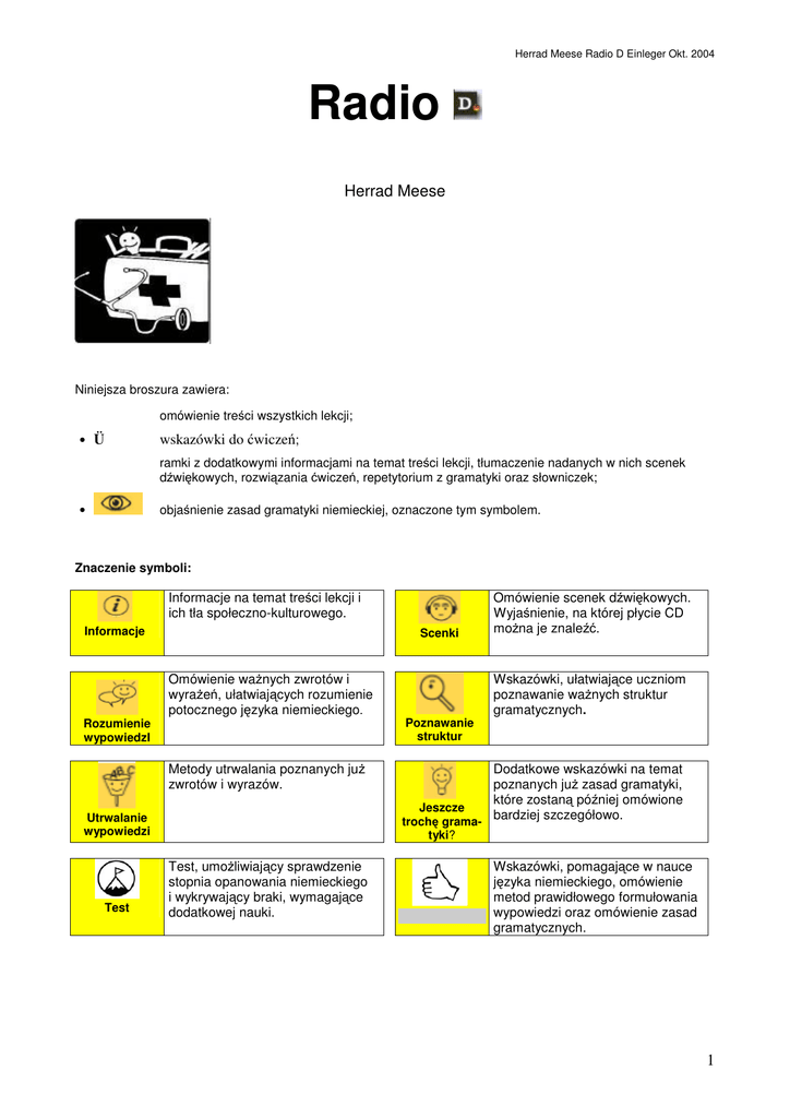 Herrad Meese Radio D Einleger Okt. 2004 Radio Herrad Meese Niniejsza broszura zawiera: omówienie treści wszystkich lekcji; • Ü wskazówki do ćwiczeń; ramki z dodatkowymi informacjami na temat treści lekcji, tłumaczenie nadanych w nich scenek dźwiękowych, rozwiązania ćwiczeń, repetytorium z gramatyki oraz słowniczek; objaśnienie zasad gramatyki niemieckiej, oznaczone tym symbolem. • Znaczenie symboli: Informacje na temat treści lekcji i ich tła społeczno-kulturowego. Informacje Rozumienie wypowiedzI Scenki Omówienie waŜnych zwrotów i wyraŜeń, ułatwiających rozumienie potocznego języka niemieckiego. Metody utrwalania poznanych juŜ zwrotów i wyrazów. Utrwalanie wypowiedzi Test Poznawanie struktur Omówienie scenek dźwiękowych. Wyjaśnienie, na której płycie CD moŜna je znaleźć. Wskazówki, ułatwiające uczniom poznawanie waŜnych struktur gramatycznych. Dodatkowe wskazówki na temat poznanych juŜ zasad gramatyki, które zostaną później omówione Jeszcze bardziej szczegółowo. trochę gramatyki? Test, umoŜliwiający sprawdzenie stopnia opanowania niemieckiego i wykrywający braki, wymagające dodatkowej nauki. Wskazówki, pomagające w nauce języka niemieckiego, omówienie metod prawidłowego formułowania wypowiedzi oraz omówienie zasad gramatycznych. 1 Herrad Meese Radio D Einleger Okt. 2004 S. 5 Omówienie lekcji 1 Informacje Na co naleŜy zwrócić uwagę? • Na wszystkie dźwięki i odgłosy. Gdzie rozgrywa się ta scenka? Co robią osoby biorące w niej udział? • Na ton wypowiedzi. Jaki jest nastrój scenki? • Wyobraź sobie przebieg akcji. • Uwzględnij tło, na którym rozgrywa się akcja scenki. S. 7 Ćw. 6 Oddziel wyrazy kreską (|). Zanotuj ułoŜone z nich zdania. S. 7 Ćw. 7 Wstaw właściwe wyrazy do poniŜszych zdań. S. 8 Ćw. 8 Jak moŜna najlepiej zapamiętać te wyrazy? Uporządkuj je. S. 8 Ćw. 9 Z podanych niŜej wyrazów zbuduj zdania i zanotuj je. S. 9 OMÓWIENIE LEKCJI 2 Scenki 1 2 Scenka 1: Pewien młody człowiek (Filip) jedzie dokądś samochodem. 1 3 Szene 2: Filip dostaje coś do picia. 1 4 Szene 3: Filip siedzi w ogrodzie i złości się. Teksty scenek na stronie 134. • • • • • • Rozumienie wypowiedzi Powitania: Hallo. Tag. Willkommen. Pytania dodatkowe: Was ist? Alles okay? Wyjaśnienia: Es gibt ... (Kaffee). Der Kaffee ist gut. Podziękowania: Okay, danke. WyraŜanie zachwytu: Schön hier. Ist das schön! Einfach super hier! Natur pur! WyraŜanie złości: Schluss jetzt! Aufhören! Utrwalanie wypowiedzi • Wskazówki: Najłatwiej jest zapamiętywać słowa w kontekście innych słów. Uczcąc się słówek, zwracaj uwagę na ich kontekst. Wypracuj własną metodę, ułatwiającą zapamiętywanie słów i wyraŜeń. Informacje Na co naleŜy zwrócić uwagę? • Na wyrazy „międzynarodowe“: Moment, Kaffee, ... • Na nazwy własne: Hanne Frisch, Philipp, Paula • Na nazwy miast: Berlin • Na rodzaj wypowiedzi, np. „wiadomości“ Scenki 1 5 Scenka 1: Filipa złości hałas i włącza radio 1 6 Scenka 2: Telefon do Filipa 1 7 Scenka 3: Wyrazy „międzynarodowe” Teksty scenek na stronie 134. • • Rozumienie wypowiedzi Witamy kogoś: Guten Tag. Dopytujemy się: Wer? Was? Prosimy o cierpliwość: Einen Moment bitte. Ich komme sofort. Ustalamy toŜsamość: Paula von Radio D. Przepraszamy kogoś za coś: Sorry. • Rozpoznajemy litery: alfabet • Utrwalanie wypowiedzi Wskazówki: Wyobraź sobie tę sytuację. • • • ĆWICZENIA DO LEKCJI 1 S. 6 Ćw. 1 Wysłuchaj tych trzech scenek: Co wydarzyło się w lekcji 1? Uporządkuj rysunki w kolejności odpowiadającej biegowi akcji. ĆWICZENIA DO LEKCJI 2 S. 6 Ćw. 2 Który tekst pasuje do danego rysunku? S. 10, Ćw. 1 Posłuchaj scenki 1. Jak reaguje Filip? Zaznacz jego reakcję. S. 7 Ćw. 3 Zaznacz wyraz nie pasujący do pozostałych. S. 10, Ćw. 2 Posłuchaj scenki 2. Kto co w niej mówi? Zaznacz to. S. 7 Ćw. 4 Uporządkuj wyrazy. S. 10, Ćw. 3 Zwróć uwagę na wyrazy międzynarodowe. 1. Zaznacz w kolumnie „Niemiecki“ akcent wyrazowy. 2. Zapisz te wyrazy po polsku w tabeli 3. Czy znasz inne wyrazy S. 7 Ćw. 5 Odgadnij zaszyfrowane wyrazy i wynotuj je. 2 Herrad Meese Radio D Einleger Okt. 2004 międzynarodowe, występujące w języku niemieckim? Co one znaczą? Odmiana czasownika „sein” w 1. i 3. osobie D 1 6, S. 172 S. 11, Ćw. 4 Jak przedstawiamy się podczas rozmowy telefonicznej? S. 11, Ćw. 5 Podaj wyraz o przeciwstawnym znaczeniu. S. 11, Ćw. 6 Które słowo tu pasuje? S. 11, Ćw. 7 Podkreśl litery wg. podanego wzoru. S. 12, Ćw. 8 Dopasuj wyrazy do podanych niŜej liter lub głosek. S. 12, Ćw. 9 Zaznacz wyrazy międzynarodowe i zapisze je. S. 12, Ćw. 10 Odgadnij zaszyfrowane wyrazy i zapisz je. S. 12, Ćw. 11 Uzupełnij brakujące wyrazy. S. 13, Ćw. 12 Kto co mówi? S. 14 OMÓWIENIE LEKCJI 3 Informacje Na co naleŜy zwrócić uwagę? • Na wyrazy międzynarodowe: Redakteurin, Professor • Na odgłosy i dźwięki towarzyszące akcji (np. na dźwięki kojarzące się z pogodą) • Utrwalanie wypowiedzi Wskazówki: Zwracaj zawsze uwagę na dźwięki i odgłosy. Pozwolą Ci one lepiej zrozumieć sytuację i łatwiej zapamiętać wyrazy. ĆWICZENIA DO LEKCJI 3 S. 15, Ćw. 1 Jak nazywa się ta stacja radiowa? S. 15, Ćw. 2 Zespół radia D. Posłuchaj tej scenki i uporządkuj ją. Kto co w niej mówi? Zanotuj A, B, C, D. S. 15, Ćw. 3 Zaznacz krzyŜykiem, czyją matką jest pani Hanne Frisch. S. 16, Ćw. 4 Posłuchaj tych zdań. Uporządkuj występujące w nich słowa i zbuduj z nich nowe zdania. Zapisz je. S. 16, Ćw. 5 Przeczytaj te zdania na głos. Rozdziel je od siebie kreską (|). S. 16, Ćw. 6 Zaznacz krzyŜykiem. 1. Które słowo nie pasuje do pozostałych? 2. Które zdanie jest niepoprawne? S. 16, Ćw. 7 Wstaw podane wyrazy we właściwe miejsce w zdaniu. S. 16, Ćw. 8 Zaznacz akcent wyrazowy. Scenki 1 8 Nazwa radiostacji 1 9 Zespół radia D 1 10 Niektórzy członkowie zespołu przedstawiają się nam 1 11 W