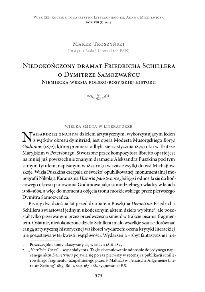 Wiek XIX . Rocznik Towarzystwa Literackiego im. Adama Mickiewicza rok VIii (L) 2015 Marek Troszyński (Insty tut Badań Literackich PAN) Niedokończony dramat Friedricha Schillera o Dymitrze Samozwańcu Niemiecka wersja polsko-rosyjskiej historii wielka smuta w literaturze ajbardziej znanym dziełem artystycznym, wykorzystującym jeden z wątków okresu dymitriad, jest opera Modesta Musorgskiego Borys Godunow (1872), której premiera odbyła się 27 stycznia 1874 roku w Teatrze Maryjskim w Petersburgu. Stworzone przez kompozytora libretto oparte jest na mniej już powszechnie znanym dramacie Aleksandra Puszkina pod tym samym tytułem, napisanym w 1825 roku w czasie zsyłki do wsi Michajłowskoje. Wizja Puszkina czerpała ze świeżo1 opublikowanej, monumentalnej monografii Nikołaja Karamzina Historia państwa rosyjskiego i odnosiła się do końcowego okresu panowania Godunowa jako samodzielnego władcy w latach 1598–1605, a więc do momentu objęcia tronu moskiewskiego przez pierwszego Dymitra Samozwańca. Pisany dwadzieścia lat przed dramatem Puszkina Demetrius Friedricha Schillera zwiastował jednym ukończonym aktem dzieło wybitne2, ale pozostał tylko przerwanym przez przedwczesną śmierć w trakcie pisania fragmentem. Ostatnie, niedokończone dzieło Schillera miało wszelkie szanse dorównać rangą artystyczną historycznej ważkości wydarzeń; ocena krytyki literackiej nie pozostawia w tej kwestii wątpliwości. Wydarzenia – zbyt fantastyczne i nie- N 1 Poszczególne tomy ukazywały się w latach 1816–1829. 2 „Herrliche Torso” – wspaniały tors. Takie sformułowanie odnośnie do jedynego napisanego aktu Demetriusa pojawia się po raz pierwszy w recenzji z publikacji schillerowskiego fragmentu (uzupełnionego przez F. Maltiza) w „Jenaische Allgemeine Literatur-Zeitung” 1819, Bd. 1, szp. 167–168, sygnowanej F.S. 575 • Marek Troszyński • prawdopodobne są materiałem trudnym do przedstawienia przekonującego obrazu wydarzeń w formie artystycznej, wymagają pomysłowości i talentu. Zarówno w polskiej, rosyjskiej, jak i światowej3 literaturze jest spora liczba dzieł wykorzystujących ten awanturniczy wątek wspólnej, polsko-rosyjskiej historii – jednak prócz dzieła Puszkina i jego derywatu – opery Musorgskiego, nie zainspirował on dzieła naprawdę wielkiego formatu. czasy zamętu Wydarzenia wielkiej smuty , czyli okresu zamętu po śmierci Iwana Groźnego (1530–1584, car od 1547 roku), są trudne – wręcz niemożliwe do ułożenia w jedną, spójną narrację. Liczne zakłócenia uniemożliwiają konsekwentne odtworzenie faktów i czynią z tego wycinka historii wiązkę poszlak, z których najbardziej prawdopodobne nie muszą być wcale najbardziej zbliżone do prawdy. Fakty otacza mgła pogłosek, zmyśleń, przeinaczeń, przemieszanych z „faktami medialnymi” wyprodukowanymi przez sprawną machinę dezinformacyjną zwalczających się stronnictw, posługujących się, jakbyśmy dziś powiedzieli, „służbami specjalnymi”. Uniemożliwiają one skuteczne dotarcie do prawdy, stanowiąc pole dociekań dla historyków, do dziś niemogących zgodzić się nie tylko na jedną interpretację, ale nawet co do samych faktów. W takim mateczniku lęgły się legendy i baśnie. Mitotwórczą siłę tajemnicy wykorzystywała też literatura5. Historyk literatury, który zamierza zająć się dziełem literackim dotyczącym tego okresu, nie ma do dyspozycji gotowego schematu w postaci kroniki wydarzeń. Lektura opracowań obejmujących ten okres jest spotkaniem z różnymi konstruktami wydarzeń, z których żaden nie usiłuje nawet dać gwarancji prawdziwości ani nawet poczucia logicznej spójności następujących po sobie faktów. To, co od pokoleń do dzisiaj stanowi wyzwanie dla historyków 4 3 4 5 Największym refleksem wykazał się Lope de Vega, pisząc w 1606 roku El gran duque de Moscovia y Emperador perseguido; powstałe w 1635 roku Życie jest snem Pedra Calderóna de la Barca także zawiera aluzyjne odwołania do tej historii. Смутное время (smutnoje wriemia) – 1598–1613/1618; w polskiej literaturze przyjęło się to określenie, chociaż mylące jest odwołanie do znaczenia podobnie brzmiącego polskiego smutku, podczas gdy rosyjskie cмутa (smuta) oznacza ‘niepokój, chaos’. O znaczeniu i pochodzeniu nazwy zob. J. Suska, „Moskiewskie sny”, czyli o interwencji polskiej w Rosji okresu Wielkiej Smuty [online], Klub Przyjaciół Historii „Wydawnictwo” Remigiusz Mikołajczyk [dostęp: 2015-11-29]: <http://www.wydawnictworemi.pl/ wpis/178/index.html>. Dziejom stereotypu Polki – Maryny Mniszchówny poświęcona jest praca V. Mochalovej, Образ Марины Мнишек в историографии и литературе, w: Studia polonica II: К 70-летию Виктора Александровича Хорева, Москва 2002. Temat Maryny i Dymitra wszedł do literatury niemal równolegle z dziejącą się historią. 576 • Niedokończony dramat Friedricha Schillera o Dymitrze … • – wykracza daleko poza kompetencje historyka literatury6. Podejmując, siłą rzeczy amatorskie, studia wokół tematu, oparte na lekturach opracowań raczej popularnych, nie miałem na celu wyrobienia sobie choćby subiektywnego przekonania do jakiegoś konkretnego scenariusza wydarzeń. Wręcz przeciwnie – była to raczej wyprawa na połów wszelkich możliwych rozbieżności, pojawiających się na każdym etapie historii7. Ustalenie faktografii na postawie zachowanych dokumentów stanowi problem nie do przezwyciężenia nie tylko z tego powodu, że zdarzenia zostały przykryte wieloma warstwami sprzecznych informacji. Na bieżąco nieustannie w tle pracowała maszyna propagandowa wytwarzająca fałszywki, prowokująca wydarzenia, kształtująca opinię publiczną. Zakulisowi animatorzy wydarzeń, których splot doprowadził w konsekwencji do zastąpienia Rurykowiczów kolejną dynastią – Roman