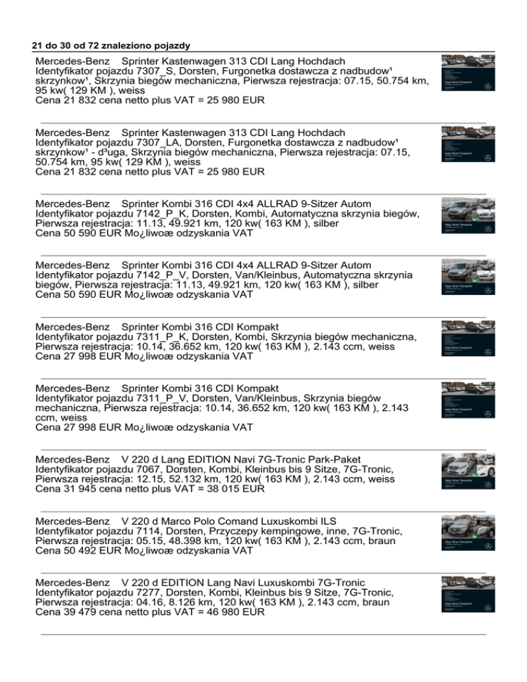 21 do 30 od 72 znaleziono pojazdy Mercedes-Benz Sprinter Kastenwagen 313 CDI Lang Hochdach Identyfikator pojazdu 7307_S, Dorsten, Furgonetka dostawcza z nadbudow¹ skrzynkow¹, Skrzynia biegów mechaniczna, Pierwsza rejestracja: 07.15, 50.754 km, 95 kw( 129 KM ), weiss Cena 21 832 cena netto plus VAT = 25 980 EUR Mercedes-Benz Sprinter Kastenwagen 313 CDI Lang Hochdach Identyfikator pojazdu 7307_LA, Dorsten, Furgonetka dostawcza z nadbudow¹ skrzynkow¹ - d³uga, Skrzynia biegów mechaniczna, Pierwsza rejestracja: 07.15, 50.754 km, 95 kw( 129 KM ), weiss Cena 21 832 cena netto plus VAT = 25 980 EUR Mercedes-Benz Sprinter Kombi 316 CDI 4x4 ALLRAD 9-Sitzer Autom Identyfikator pojazdu 7142_P_K, Dorsten, Kombi, Automatyczna skrzynia biegów, Pierwsza rejestracja: 11.13, 49.921 km, 120 kw( 163 KM ), silber Cena 50 590 EUR Mo¿liwoæ odzyskania VAT Mercedes-Benz Sprinter Kombi 316 CDI 4x4 ALLRAD 9-Sitzer Autom Identyfikator pojazdu 7142_P_V, Dorsten, Van/Kleinbus, Automatyczna skrzynia biegów, Pierwsza rejestracja: 11.13, 49.921 km, 120 kw( 163 KM ), silber Cena 50 590 EUR Mo¿liwoæ odzyskania VAT Mercedes-Benz Sprinter Kombi 316 CDI Kompakt Identyfikator pojazdu 7311_P_K, Dorsten, Kombi, Skrzynia biegów mechaniczna, Pierwsza rejestracja: 10.14, 36.652 km, 120 kw( 163 KM ), 2.143 ccm, weiss Cena 27 998 EUR Mo¿liwoæ odzyskania VAT Mercedes-Benz Sprinter Kombi 316 CDI Kompakt Identyfikator pojazdu 7311_P_V, Dorsten, Van/Kleinbus, Skrzynia biegów mechaniczna, Pierwsza rejestracja: 10.14, 36.652 km, 120 kw( 163 KM ), 2.143 ccm, weiss Cena 27 998 EUR Mo¿liwoæ odzyskania VAT Mercedes-Benz V 220 d Lang EDITION Navi 7G-Tronic Park-Paket Identyfikator pojazdu 7067, Dorsten, Kombi, Kleinbus bis 9 Sitze, 7G-Tronic, Pierwsza rejestracja: 12.15, 52.132 km, 120 kw( 163 KM ), 2.143 ccm, weiss Cena 31 945 cena netto plus VAT = 38 015 EUR Mercedes-Benz V 220 d Marco Polo Comand Luxuskombi ILS Identyfikator pojazdu 7114, Dorsten, Przyczepy kempingowe, inne, 7G-Tronic, Pierwsza rejestracja: 05.15, 48.398 km, 120 kw( 163 KM ), 2.143 ccm, braun Cena 50 492 EUR Mo¿liwoæ odzyskania VAT Mercedes-Benz V 220 d EDITION Lang Navi Luxuskombi 7G-Tronic Identyfikator pojazdu 7277, Dorsten, Kombi, Kleinbus bis 9 Sitze, 7G-Tronic, Pierwsza rejestracja: 04.16, 8.126 km, 120 kw( 163 KM ), 2.143 ccm, braun Cena 39 479 cena netto plus VAT = 46 980 EUR Mercedes-Benz V 220 d Lang EDITION Navi 7G-Tronic Park-Paket Identyfikator pojazdu 7067_P, Dorsten, Van/Kleinbus, 7G-Tronic, Pierwsza rejestracja: 12.15, 52.132 km, 120 kw( 163 KM ), 2.143 ccm, weiss Cena 38 015 EUR Mo¿liwoæ odzyskania VAT
