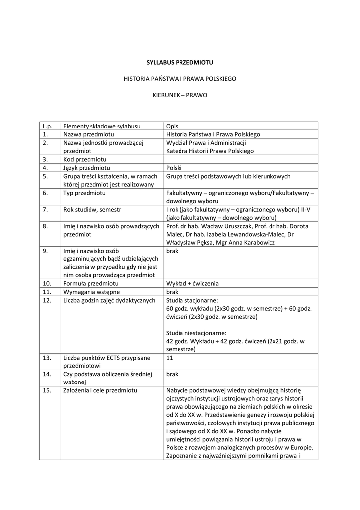 SYLLABUS PRZEDMIOTU HISTORIA PAŃSTWA I PRAWA POLSKIEGO KIERUNEK – PRAWO L.p. 1. 2. 6. Elementy składowe sylabusu Nazwa przedmiotu Nazwa jednostki prowadzącej przedmiot Kod przedmiotu Język przedmiotu Grupa treści kształcenia, w ramach której przedmiot jest realizowany Typ przedmiotu 7. Rok studiów, semestr 8. Imię i nazwisko osób prowadzących przedmiot 9. Imię i nazwisko osób egzaminujących bądź udzielających zaliczenia w przypadku gdy nie jest nim osoba prowadząca przedmiot Formuła przedmiotu Wymagania wstępne Liczba godzin zajęć dydaktycznych 3. 4. 5. 10. 11. 12. 13. 14. 15. Liczba punktów ECTS przypisane przedmiotowi Czy podstawa obliczenia średniej ważonej Założenia i cele przedmiotu Opis Historia Państwa i Prawa Polskiego Wydział Prawa i Administracji Katedra Historii Prawa Polskiego Polski Grupa treści podstawowych lub kierunkowych Fakultatywny – ograniczonego wyboru/Fakultatywny – dowolnego wyboru I rok (jako fakultatywny – ograniczonego wyboru) II-V (jako fakultatywny – dowolnego wyboru) Prof. dr hab. Wacław Uruszczak, Prof. dr hab. Dorota Malec, Dr hab. Izabela Lewandowska-Malec, Dr Władysław Pęksa, Mgr Anna Karabowicz brak Wykład + ćwiczenia brak Studia stacjonarne: 60 godz. wykładu (2x30 godz. w semestrze) + 60 godz. ćwiczeń (2x30 godz. w semestrze) Studia niestacjonarne: 42 godz. Wykładu + 42 godz. ćwiczeń (2x21 godz. w semestrze) 11 brak Nabycie podstawowej wiedzy obejmującą historię ojczystych instytucji ustrojowych oraz zarys historii prawa obowiązującego na ziemiach polskich w okresie od X do XX w. Przedstawienie genezy i rozwoju polskiej państwowości, czołowych instytucji prawa publicznego i sądowego od X do XX w. Ponadto nabycie umiejętności powiązania historii ustroju i prawa w Polsce z rozwojem analogicznych procesów w Europie. Zapoznanie z najważniejszymi pomnikami prawa i 16. Metody dydaktyczne nabycie umiejętności posługiwania się nimi zarówno jako źródłami prawa jak źródłami historycznymi. Zaznajomienie z podstawami aparatu pojęciowego prawoznawstwa w kontekście historycznym i podstawowymi instytucjami prawnymi w procesie ich ewolucji do kształtu współczesnego. Celem przedmiotu jest także funkcja propedeutyczna jako, ze wykład jest adresowany głownie do studentów pierwszych lat studiów. 1. Wykład: 2 godz. tygodniowo x 30 tygodni/studia niestacjonarne: 3 godz. co 2 tygodnie/ 2. Ćwiczenia: 2 godz. tygodniowo x 30 tygodni/studia niestacjonarne: 3 godz. co 2 tygodnie/ 3. Konsultacje fakultatywne prowadzących ćwiczenia dla chętnych /do 2 godz. tygodniowo/ 17. Forma i warunki zaliczenia przedmiotu, w tym zasady dopuszczenia do egzaminu, zaliczenia z przedmiotu, a także formy i warunki zaliczenia poszczególnych form zajęć wchodzących w zakres danego przedmiotu 18. Treści merytoryczne przedmiotu i sposób ich realizacji 4. Współpraca ze studenckim kołem naukowym /TBSP/ w prowadzeniu zajęć dodatkowych dla zainteresowanych oraz organizacja konkursu historyczno-prawnego dla wyróżniających się studentów z możliwością udziału w ogólnopolskiej edycji tego konkursu. Egzamin pisemny trwający od. 45 do 60 min. składający się z części testowej (ok. 50 pytań) oraz części wypracowania (2-3 pytań polegających na opisowym przedstawieniu zagadnienia). Uzyskanie zaliczenia ćwiczeń jest fakultatywne i nie jest warunkiem przystąpienia do egzaminu. Zaliczenie ćwiczeń wraz z oceną na ćwiczeniach uzyskaną jest premiowane przy ocenie egzaminu. Zaliczenie ćwiczeń na podstawie końcowej pracy zaliczeniowej o formule przypominającej egzamin oraz na podstawie oceniania ciągłego. Wykład prezentuje zarys historii podstawowych instytucji ustrojowych dawnego państwa polskiego od monarchii wczesnych Piastów do upadku Rzeczypospolitej Obojga Narodów. Ponadto omawia instytucje ustrojowe tworów państwowych istniejących na ziemiach polskich i zaliczanych do polskiej tradycji ustrojowej i historycznej (np. Księstwo Warszawskie, Wolne Miasto Kraków, Galicja doby Autonomii) oraz przedstawia obszernie konstytucyjne zasady ustroju państwowego II RP. Wykład poświęcony problematyce ustrojowej kończy krótkie omówienie okresu początków PRL. Treść wykładu skupia się na przestawieniu zasad ustroju państwowego w świetle ówczesnej doktryny prawnoustrojowe oraz praktyki politycznej. Drugi blok zagadnień obejmuje problematykę historii prawa polskiego oraz 19. Wykaz literatury podstawowej i uzupełniającej, obowiązującej do zaliczenia danego przedmiotu obowiązującego na ziemiach polskich w okresie niewoli narodowej w układzie: źródła prawa w znaczeniu źródeł tworzenia prawa oraz poznawania prawa, omówienie najważniejszych instytucji prawa prywatnego (cywilnego) i ich ewolucji, instytucji prawa karnego i ich ewolucji, procesu sądowego (karnego i cywilnego) oraz instytucje wymiaru sprawiedliwości. Wykład uzupełniają ćwiczenia realizowane przez każdego z prowadzących wg układanego przez nich z osobna i akceptowanego przez wykładowców programu, obejmującego omówienie bardziej złożonych zagadnień oraz pracę ze źródłami. (w załączeniu program szczegółowy). J. Bardach, B. Leśnodorski, M. Pietrzak Historia Ustroju i Prawa Polskiego, Warszawa 2003 (wydanie dowolne). S. Płaza Historia prawa w Polsce na tle porównawczym, t.1-3 Kraków 1994-2005 (wydanie dowolne).