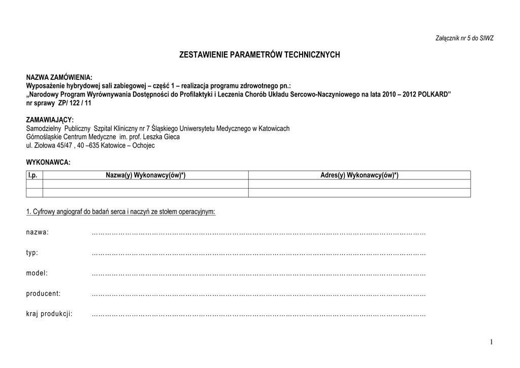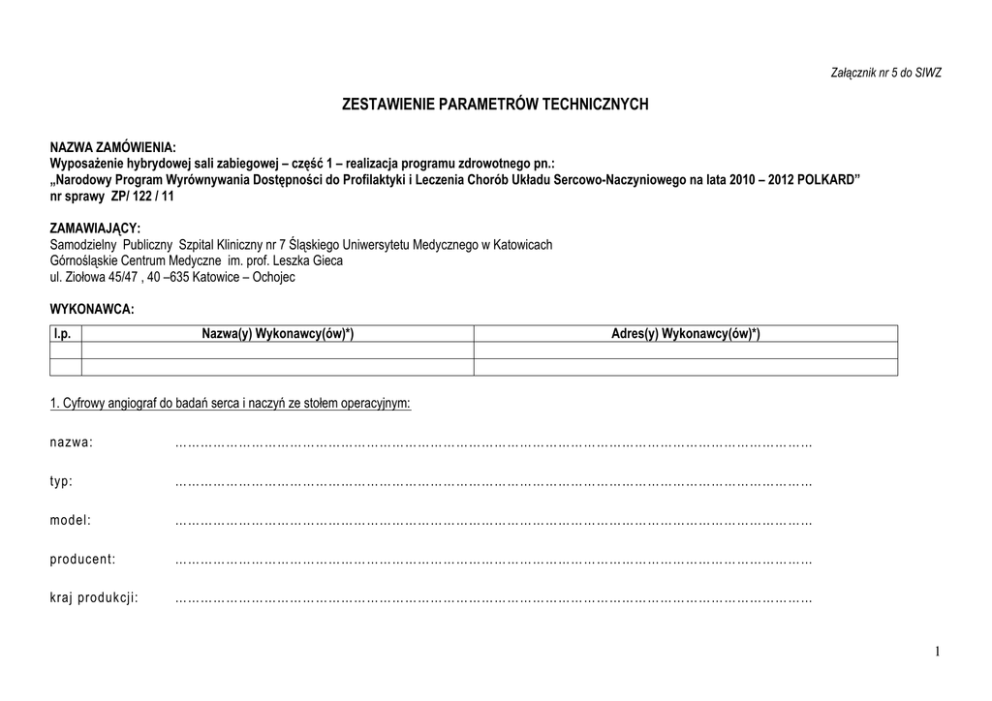 Załącznik nr 5 do SIWZ ZESTAWIENIE PARAMETRÓW TECHNICZNYCH NAZWA ZAMÓWIENIA: Wyposażenie hybrydowej sali zabiegowej – część 1 – realizacja programu zdrowotnego pn.: „Narodowy Program Wyrównywania Dostępności do Profilaktyki i Leczenia Chorób Układu Sercowo-Naczyniowego na lata 2010 – 2012 POLKARD” nr sprawy ZP/ 122 / 11 ZAMAWIAJĄCY: Samodzielny Publiczny Szpital Kliniczny nr 7 Śląskiego Uniwersytetu Medycznego w Katowicach Górnośląskie Centrum Medyczne im. prof. Leszka Gieca ul. Ziołowa 45/47 , 40 –635 Katowice – Ochojec WYKONAWCA: l.p. Nazwa(y) Wykonawcy(ów)*) Adres(y) Wykonawcy(ów)*) 1. Cyfrowy angiograf do badań serca i naczyń ze stołem operacyjnym: nazwa: …………………………………………………………………………………………………………………………………… typ: …………………………………………………………………………………………………………………………………… model: …………………………………………………………………………………………………………………………………… producent: …………………………………………………………………………………………………………………………………… kraj produkcji: …………………………………………………………………………………………………………………………………… 1 Parametry techniczne i funkcjonalne Wymagania Parametry oceniane I. Statyw 1. 2. Mocowanie statywu na suficie Położenia statywu umożliwiające wykonywanie zabiegów w całym obszarze ciała pacjenta (statyw za głową pacjenta oraz statyw z obu boków stołu pacjenta) – bez konieczności przekładania pacjenta Wykonanie badań przy statywie umieszczonym z obu stron stołu Tak, podać Tak, opisać Warunek, bez punktacji Warunek, bez punktacji Tak Warunek, bez punktacji Wartość największa – 5 pkt., pozostałe proporcjonalnie mniej Wartość największa – 5 pkt., pozostałe proporcjonalnie mniej Wartość największa – 5 pkt., pozostałe proporcjonalnie mniej 3. 4. Zakres projekcji LAO/RAO [°] w pozycji statywu za głową pacjenta Podać zakres 5. Zakres projekcji CRAN/CAUD [°] w pozycji statywu za głową pacjenta Podać zakres 6. Szybkość ruchów statywu [°/s] w płaszczyźnie LAO/RAO przy zmianie angulacji statywu (z wyłączeniem ruchów wykonywanych przy angiografii rotacyjnej) w pozycji statywu za głową pacjenta Tak, ≥ 18°/s 7. Szybkość ruchów statywu [°/s] w płaszczyźnie CRAN/CAUD przy zmianie angulacji statywu w pozycji statywu za głową pacjenta Tak, ≥ 18°/s 8. Szybkość ruchów statywu [°/s] przy wykonywaniu angiografii rotacyjnej w pozycji statywu za głową pacjenta Tak, ≥ 55°/s 9. Szybkość ruchów statywu [°/s] przy wykonywaniu angiografii rotacyjnej w pozycji statywu z boku stołu Podać 10. Pamięć pozycji statywu – co najmniej 10 pozycji 11. System zabezpieczenia przed kolizją współpracujący z chirurgicznym stołem pacjenta wyposażonym w płytę pacjenta przezierną dla promieniowania RTG Silnikowe ustawianie statywu w pozycji parkingowej (z tyłu za głową pacjenta lub z boku stołu pacjenta) umożliwiającej nieograniczony dostęp do pacjenta ze wszystkich stron 12. Tak, ≥ 10 pozycji Tak, opisać Tak Parametry oferowane*) Wartość największa – 5 pkt., pozostałe proporcjonalnie mniej Wartość największa – 5 pkt., pozostałe proporcjonalnie mniej Wartość największa – 5 pkt., pozostałe proporcjonalnie mniej Warunek, bez punktacji Warunek, bez punktacji Warunek, bez punktacji 2 13. 14. Automatyczny (bez ingerencji obsługi) równoczesny obrót przysłony i detektora dla kompensacji obrotu obrazu przy zmianie położenia statywu do pozycji z boku stołu Pulpit sterowniczy ruchów statywu w sali zabiegowej II. Chirurgiczny stół pacjenta 1. 2. Mocowanie stołu na podłodze Płyta pacjenta z włókna węglowego przezierna dla promieniowania RTG Silnikowy przesuw przeziernej płyty pacjenta w kierunku wzdłużnym i poprzecznym 3. Podać Tak – 5 pkt Nie – 0 pkt Tak Warunek, bez punktacji Tak Tak Warunek, bez punktacji Warunek, bez punktacji Tak, podać zakresy Warunek, bez punktacji 4. Dopuszczalne całkowite obciążenie płyty pacjenta z włókna ≥180 kg węglowego przeziernej dla promieniowania RTG Warunek, bez punktacji 5. Płyta pacjenta wieloelementowa przezierna dla promieniowania RTG z możliwością regulacji położenia elementów Silnikowy przesuw wieloelementowej przeziernej dla promieniowania RTG płyty pacjenta w kierunku wzdłużnym Warunek, bez punktacji 6. Tak, co najmniej 5 elementów Tak, podać zakres Warunek, bez punktacji 7. Dopuszczalne całkowite obciążenie wieloelementowej ≥350 kg przeziernej dla promieniowania RTG płyty pacjenta Warunek, bez punktacji 8. Silnikowa regulacja położenia elementów płyty wieloelementowej Tak w obszarze tułowia i kończyn dolnych Możliwość silnikowego pochylania obu płyt pacjenta wokół osi Tak, co najmniej +/krótkiej (Trendelenburg/anty-Trendelenburg) 30° Warunek, bez punktacji 9. 10. Możliwość silnikowego pochylania obu płyt pacjenta wokół osi długiej 11. 12. Obrót wokół osi pionowej o min 180° łącznie Regulacja wysokości stołu [cm] silnikowo, co najmniej w zakresie 50 cm Wózek do transportu płyt pacjenta pomiędzy salą operacyjną a pomieszczeniem przygotowania pacjenta (shuttle) Akcesoria – min.: 1 materac na każdą płytę, dla płyty przeziernej: pasy do mocowania pacjenta, podkładka pod ramię przy injekcji przepuszczalna dla promieniowania RTG, podpórki pod ramiona wzdłuż stołu przepuszczalne dla promieniowania RTG, szyny na akcesoria w obrębie głowy pacjenta i w obszarze abdominalnym, statyw na płyny infuzyjne, uchwyt anestetyczny mocowany na 13. 14. Tak, podać Tak, podać Wartość największa – 5 pkt., pozostałe proporcjo