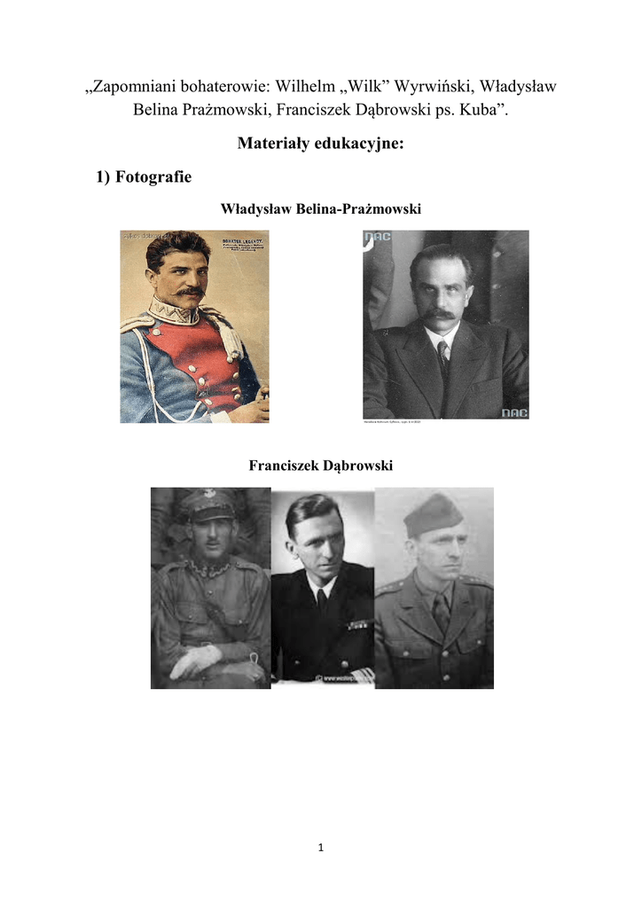 „Zapomniani bohaterowie: Wilhelm „Wilk” Wyrwiński, Władysław Belina Prażmowski, Franciszek Dąbrowski ps. Kuba”. Materiały edukacyjne: 1) Fotografie Władysław Belina-Prażmowski Franciszek Dąbrowski 1 Wilhelm „Wilk” Wyrwiński Obraz autorstwa W. „Wilka” Wyrwińskiego- pt. Łabędzie "Poszło przede wszystkim za nami to, co jest w najpiękniejsze w kulturze ludzkiej - poszła sztuka". Józef Piłsudski „Wilhelm "Wilk" Wyrwiński, (malarz, grafik, projektant zabawek, podpułkownik Wojska Polskiego.) urodzony w 1889 r. w Kętach. Po ukończeniu szkoły średniej wstąpił do Akademii Sztuk Pięknych w Krakowie i jako uczeń Unierzyckiego i Mehoffera bierze udział w wystawach sztuki w Krakowie i Warszawie. Umiłowanie sztuki stanowiło całą jego treść życiową - poświęcał się także muzyce. W r.1908 wstępuje w Krakowie do Związku Walki Czynnej i jest jednym z pierwszych członków tej organizacji. Później w Strzelcu ćwiczy rekruta i sam się sposobi do przyszłej służby wojskowej. W 1914 r. jako komendant plutonu wyrusza z Piłsudskim w pole. Potem jako komendant 4 komp. 6 baonu 1 p. bierze udział we wszystkich walkach pierwszej brygady. Odznacza się wielokrotnie, a najbardziej w ataku na Kukle. W lipcu 1916 r. odparł atak szarży 13 szwadronów jazdy nieprzyjacielskiej spokojnie a umiejętnie kierując ogniem kompanii. Za służbę wywiadowczą na Wołyniu otrzymuje szereg odznaczeń między innymi krzyż zasługi od Niemców. Dziwnym zbiegiem okoliczności wychodzi cało ze wszystkich opresji. Po dymisji pułku dostaje się na front włoski, stamtąd wraca do kraju i w pierwszych dniach niepodległości 2 Polski staje w szeregach wolnej armii polskiej. Jako kapitan 5 pułku obejmuje w listopadzie komendę nad "Piłsudczykiem" , gdzie wsławia się obroną Gródka Jagiellońskiego i mostu na Wereszycy. Aż przyszła noc krytyczna z 28 na 29 grudnia, "Piłsudczyk" ruszył na Persenkówkę. W pewnej odległości zatrzymał się pociąg pancerny celem zbadania sytuacji. Kapitan z dwoma towarzyszami wysiadł i poszedł w kierunku budki kolejowej. Z odległości 200-300 m od pociągu zobaczył grupę żołnierzy. Myśląc, że to nasi, zatrzymał ich. - Ten czyn przypłacił życiem, które drogo sprzedał, broniąc się rozpaczliwie. Znaki na ciele i rany świadczyły, że został kolbami i bagnetami dobity. Pochowany w Krakowie". Maluje akwarele, wraz z Henrykiem Uziembło, Włodzimierzem Koniecznym, Zygmuntem Rozwadowskim i Leonem Wyczółkowskim zostaje kronikarzem Legionów. Pierwsza wystawa prac odbyła się w 1916 , druga dla Wilhelma oraz Włodzimierza Koniecznego już pośmiertna w 1919 roku”. „Franciszek Dąbrowski ps. Kuba (ur. 17 kwietnia 1904 w Budapeszcie, zm. 24 kwietnia 1962 w Krakowie) – komandor porucznik Marynarki Wojennej RP, w czasie wojny obronnej Polski w 1939 zastępca komendanta, a według niektórych źródeł przez większość czasu także faktyczny dowódca obrony Wojskowej Składnicy Tranzytowej na Westerplatte. Franciszek Dąbrowski, syn szlachcica (herbu Jelita) generała Romualda Dąbrowskiego i Elżbiety (Elizabeth) z Broulików, służbę wojskową rozpoczął w listopadzie 1918 roku szkole podchorążych w Krakowie. Był dowódcą oddziału wartowniczego i zastępcą komendanta Wojskowej Składnicy Tranzytowej na Westerplatte od 12.1937 do 7.09. 1939. Składnica broniła się do 7 września 1939, kiedy to mjr Sucharski ostatecznie zdecydował poddać placówkę. Wojnę spędził w kilku obozach jenieckich, co przyczyniło się do błyskawicznie postępującej gruźlicy pomimo że z uwagi na służbę ojca w cesarskim wojsku był lepiej traktowany przez lekarzy obozowych. Po wyzwoleniu zgłosił chęć dalszej służby wojskowej. Z dniem 10 sierpnia 1945 roku został awansowany na stopień majora (kmdr ppor.) i jeszcze w tym samym miesiącu otrzymał przydział na szefa sztabu Samodzielnego Batalionu Morskiego. 3 Komendantem ośrodka wyszkolenia tych grup mianowano 1 stycznia 1947 Dąbrowskiego. W 1950 Dąbrowski został uznany za inwalidę wojennego i zwolniony z powszechnego obowiązku służby wojskowej; nie miał jednak wypracowanej emerytury wojskowej. Od tego momentu rozpoczął się najtrudniejszy okres w życiu Dąbrowskiego. Z Ustki musiał przenieść się wraz z rodziną do Krakowa. Nie miał pracy i żadnej możliwości kontynuowania niezbędnego leczenia sanatoryjnego. Po wielu staraniach o mieszkanie, otrzymał pojedynczy pokój bez sanitariatu. Aby utrzymać rodzinę podjął pracę jako kasjer w szył chałupniczo pantofle. Na początku lat 50., na fali stalinowskich czystek został usunięty z partii i pozbawiony pracy. Usuniętemu z partii i pracy oficerowi nikt nie chciał pomóc. Dopiero powiadomiony przez Arnolda Mostowicza radziecki generał Bolesław Kieniewicz, dowódca Krakowskiego Okręgu Wojskowego, spowodował, że Dąbrowskiemu umożliwiono pracę sprzedawcy gazet w kiosku, w atrakcyjnym punkcie na Plantach. Po październikowej odwilży 1956, Dąbrowskiemu wypłacono odszkodowanie i otrzymał większe mieszkanie. Aktywnie podjął działalność na rzecz utworzenia Związku Obrońców Westerplatte. Kmdr por. rez. Franciszek Dąbrowski zmarł 24 kwietnia 1962 w krakowskim Szpitalu Przeciwgruźliczym, w wieku 58 lat. Jego imię noszą w Polsce dwie szkoły: m. in. Szkoła Podstawowa nr 62 w Krakowie. Jest autorem książek: "Dziennik Bojowy załogi Westerplatte" (1945) oraz "Wspomnienia z obrony Westerplatte" (1957). Dopiero w latach 90. XX wieku została szerzej ujawniona w nowym piśmiennictwie historycznym faktyczna rola Dąbrowskiego i postawa majora Sucharskiego podczas obrony Westerplatte, wcześniej uważano w oficjalnej historiografii majora Sucharskiego za 4 dowodzącego cały czas obroną Westerplatte, do czego przyczyniła się m.in. książka Melchiora Wańkowicza (czemu oficjalnie nie zaprzeczali uczestnicy obrony)”. „Władysław Belina Prażmowski Belina polski herb