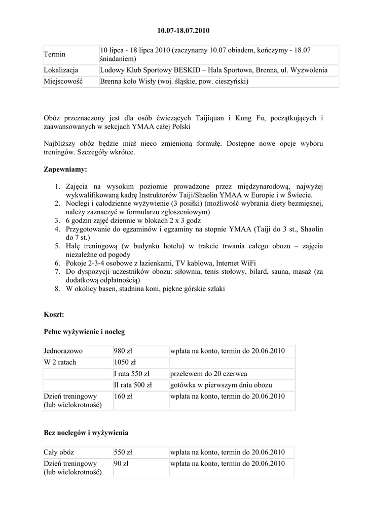 10.07-18.07.2010 Termin 10 lipca - 18 lipca 2010 (zaczynamy 10.07 obiadem, kończymy - 18.07 śniadaniem) Lokalizacja Ludowy Klub Sportowy BESKID – Hala Sportowa, Brenna, ul. Wyzwolenia Miejscowość Brenna koło Wisły (woj. śląskie, pow. cieszyński) Obóz przeznaczony jest dla osób ćwiczących Taijiquan i Kung Fu, początkujących i zaawansowanych w sekcjach YMAA całej Polski Najbliższy obóz będzie miał nieco zmienioną formułę. Dostępne nowe opcje wyboru treningów. Szczegóły wkrótce. Zapewniamy: 1. Zajęcia na wysokim poziomie prowadzone przez międzynarodową, najwyżej wykwalifikowaną kadrę Instruktorów Taiji/Shaolin YMAA w Europie i w Świecie. 2. Noclegi i całodzienne wyżywienie (3 posiłki) (możliwość wybrania diety bezmięsnej, należy zaznaczyć w formularzu zgłoszeniowym) 3. 6 godzin zajęć dziennie w blokach 2 x 3 godz 4. Przygotowanie do egzaminów i egzaminy na stopnie YMAA (Taiji do 3 st., Shaolin do 7 st.) 5. Halę treningową (w budynku hotelu) w trakcie trwania całego obozu – zajęcia niezależne od pogody 6. Pokoje 2-3-4 osobowe z łazienkami, TV kablowa, Internet WiFi 7. Do dyspozycji uczestników obozu: siłownia, tenis stołowy, bilard, sauna, masaż (za dodatkową odpłatnością) 8. W okolicy basen, stadnina koni, piękne górskie szlaki Koszt: Pełne wyżywienie i nocleg Jednorazowo 980 zł W 2 ratach 1050 zł Dzień treningowy (lub wielokrotność) wpłata na konto, termin do 20.06.2010 I rata 550 zł przelewem do 20 czerwca II rata 500 zł gotówka w pierwszym dniu obozu 160 zł wpłata na konto, termin do 20.06.2010 Bez noclegów i wyżywienia Cały obóz 550 zł wpłata na konto, termin do 20.06.2010 Dzień treningowy (lub wielokrotność) 90 zł wpłata na konto, termin do 20.06.2010 UWAGI: 1. Opcja dzień treningowy z wyżywieniem i noclegiem dostępna w miarę możliwości. Wymaga potwierdzenia. 2. Zgłoszenia i wpłaty po terminie 20.06.2010 - do kwoty obozu należy doliczyć 10% 3. Warunkiem przyjęcia zgłoszenia jest przesłanie wypełnionego formularza zgłoszeniowego i wpłata odpowiedniej kwoty. 4. W przypadku rezygnacji z obozu: o Rezygnacja po 20.06 – zwrot 90% całej kwoty o Rezygnacja po 10.07 – zwrot 50% całej kwoty 5. Na terenie ośrodka jest 67 miejsc noclegowych. Pokoje przydzielane będą wg kolejności zgłoszeń. Po wyczerpaniu możliwości noclegowych istnieje możliwość zakwaterowania w sąsiednim pensjonacie. 6. Wpłaty na konto: Wydawnictwo YMAA, ul. Makowskiego 8/114, 31-325 Kraków Bank: BRE S.A. - WBE/ Łódź Nr rach: 26 1140 2004 0000 3102 3476 8170 Program szkoleniowy obozu obejmuje: Taijiquan: 1. 2. 3. 4. 5. 6. 7. Tradycyjna 112 ruchowa forma stylu Yang Trening Qigong Taiji Pchające dłonie Taiji, trening centrowania i zakorzenienia Zastosowania form Taiji oraz technik Qin Na Trening kuli Taiji Średnie i szybkie tempo Taiji, Taiji Jin Przygotowanie do egzaminu (1-5 st. Taiji) Wymagany sprzęt: Kula Taiji np. drewniana (ew. piłka), klocki drewniane do treningu centrowania (nieobowiązkowe) Shaolin/San Shou (San Da): 1. 2. 3. 4. 5. 6. 7. 8. Nauka, rozwijanie i doskonalenie technik i sekwencji Kung Fu Formy walki, Qin Na Zastosowania technik, sekwencji, form walki, trening bojowy z partnerem Trening z bronią (kij, szabla, miecz) Podstawowy i zaawansowany sparing Trening ogolnorozwojowy, wydolnościowy, reakcja, Jin (siła walki) Przygotowanie do egzaminu (I-X st. Shaolin) Sparing - trening reakcji, sparingu (San Shou) na bazie technik Długiej Pięści. Dwie grupy: początkujący i zaawansowani. Wymagany sprzęt: Kij treningowy, pas Zaawansowani: rękawice sprzętowe i sparingowe, kask, ochraniacze na piszczele, packi i tarcze – 1 kpl. na 2 osoby, skakanka, ochraniacz na krocze. Początkujący: rękawice sprzętowe, packi i tarcze - 1 kpl. na 2 osoby, skakanka, wskazane ochraniacze na piszczele i kask. Kij podstawy Nauka i trening podstawowych technik kija dla praktyków Taiji i Shaolin. Nauka od podstaw i kontynuacja treningu z poprzednich obozów i warsztatów. Dla ćwiczących Taiji jest to nieobowiązkowa opcja. Chętnych prosimy o zaznaczenie tego w formularzu zgłoszeniowym. Wymagany sprzęt: kij treningowy Formularz zgłoszeniowy – dostępny na stronie www.ymaa.pl UWAGA: Istnieje możliwość zaopatrzenia się podczas obozu w klocki treningowe i kij. Wymaga to jednak wcześniejszego zamówienia. W tej sprawie proszę kontaktować się z: [email protected] najpóźniej tydzień przed obozem. Kadra Robert Wąs (YMAA Kraków, Polska) Instruktor Shaolin Kung Fu (10 stopień) Instruktor Taijiquan (5 stopień) Pedro Rodrigues (Lizbona, Portugalia) Instruktor Shaolin Kung Fu (10 stopień) Instruktor Taijiquan (5 stopień) Bartłomiej Grad (Kraków, Polska) Asystent Instruktora Shaolin Kung Fu (7 stopień) Instruktor Taijiquan (5 stopień) Rafał Szulkowski (Sopot, Polska) Asystent Instruktora Shaolin Kung Fu (7 stopień) Asystent Instruktora Taiji (3 stopień) Erik Elsemans (Bruksela, Belgia) 5 st. Shaolin Asystent Instruktora Taiji (3 stopień) Kontakt w sprawie obozu: email: [email protected] telefon: 12 3764860 ( w godz. 9-17)