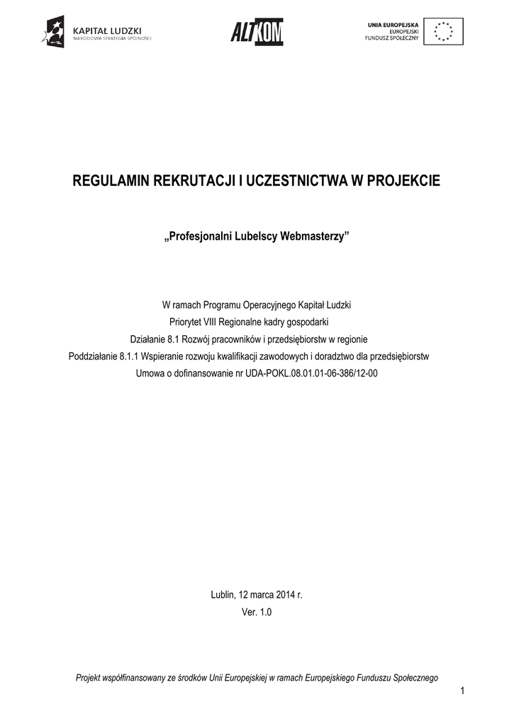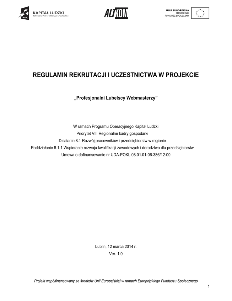 REGULAMIN REKRUTACJI I UCZESTNICTWA W PROJEKCIE „Profesjonalni Lubelscy Webmasterzy” W ramach Programu Operacyjnego Kapitał Ludzki Priorytet VIII Regionalne kadry gospodarki Działanie 8.1 Rozwój pracowników i przedsiębiorstw w regionie Poddziałanie 8.1.1 Wspieranie rozwoju kwalifikacji zawodowych i doradztwo dla przedsiębiorstw Umowa o dofinansowanie nr UDA-POKL.08.01.01-06-386/12-00 Lublin, 12 marca 2014 r. Ver. 1.0 Projekt współfinansowany ze środków Unii Europejskiej w ramach Europejskiego Funduszu Społecznego 1 §1 PRZEPISY OGÓLNE 1. Regulamin określa warunki rekrutacji i uczestnictwa Uczestników Projektu w ramach projektu „Profesjonalni Lubelscy Webmasterzy” realizowanego w ramach Programu Operacyjnego Kapitał Ludzki, Priorytet VIII Regionalne kadry gospodarki, Działanie 8.1 Rozwój pracowników i przedsiębiorstw w regionie, Poddziałanie 8.1.1 Wspieranie rozwoju kwalifikacji zawodowych i doradztwo dla przedsiębiorstw. 2. Projekt jest współfinansowany przez Unię Europejską w ramach Europejskiego Funduszu Społecznego. 3. Wszystkie decyzje podejmowane w oparciu o regulamin są zgodne z umową nr UDA-POKL.08.01.01-06-386/12-00 o dofinansowanie projektu „Profesjonalni Lubelscy Webmasterzy” z dnia 13 lutego 2013 roku, zawartą pomiędzy Altkom Akademia S.A., a Urzędem Marszałkowskim Województwa Lubelskiego w Lublinie. 4. Okres realizacji projektu: 01.03.2013 roku – 30.11.2014 roku. 5. Obszar realizacji projektu: województwo lubelskie. §2 SŁOWNIK POJĘĆ Użyte w niniejszym Regulaminie pojęcia, oznaczają: 1. Beneficjent/Wnioskodawca – Altkom Akademia S.A.; 2. Instytucja Pośrednicząca – Urząd Marszałkowski Województwa Lubelskiego; 3. Uczestnik Projektu – osoba zakwalifikowana zgodnie z zasadami określonymi w niniejszym regulaminie do udziału w Projekcie, bezpośrednio korzystająca z wdrażanych szkoleń; 4. Projekt – Projekt „Profesjonalni Lubelscy Webmasterzy” 5. PO KL – Program Operacyjny Kapitał Ludzki; 6. Biuro Projektu – 20 - 469 Lublin, ul. Budowlana 50; 7. EFS – Europejski Fundusz Społeczny. §3 CEL PROJEKTU 1. Celem głównym projektu jest wzmocnienie potencjału wiedzy 176 mikro przedsiębiorstw poprzez podniesienie kwalifikacji 216 specjalistów IT w województwie lubelskim. 2. Cel główny zostanie osiągnięty do 31 listopada 2014 r. w województwie lubelskim przez spełnienie celów szczegółowych tj.: a. wzrost kwalifikacji 216 specjalistów ICT, w tym min.20% kobiet w zakresie umiejętności tworzenia serwisów www, b. wzrost dostępu do wysokiej jakości wiedzy i kapitału ludzkiego o odpowiednich kwalifikacjach wśród 176 mikro firm. §4 GRUPA DOCELOWA 1. Grupę docelową stanowią mikro przedsiębiorstwa, prowadzące działalność w branży informatycznej, w tym osoby samozatrudnione, posiadające jednostkę organizacyjną na terenie woj. lubelskiego oraz ich pracownicy/pracownice zatrudnieni/zatrudnione na podstawie umowy o pracę, Projekt współfinansowany ze środków Unii Europejskiej w ramach Europejskiego Funduszu Społecznego 2 zamieszkali/łe lub pracujący/e na terenie woj. lubelskiego, zwani dalej uczestnikami projektu ogółem 216 osób (w tym 43 kobiety). 2. Uczestnicy projektu to informatycy, zajmujący się projektowaniem, kodowaniem, szatą graficzną publikacji, stron www, aktualizacją stron www, osoby, które nie posiadają kompetencji do świadczenia prac na najwyższym poziomie. 3. W szkoleniach nie mogą brać udziału osoby zatrudnione na umowy cywilno prawne. 4. W ramach projektu kwalifikowane będą firmy mające jednostkę organizacyjną w woj. lubelskim, w tym co najmniej 80% (czyli 120) firm nie mogło korzystać dotąd ze wsparcia w zakresie projektów szkoleniowych w ramach konkursów ogłoszonych dla Poddziałania 8.1.1 i 8.1.2 w latach 2007-2011 przez UMWL.W przypadku przedsiębiorstw korzystających dotąd ze wsparcia w zakresie projektów szkoleniowych w ramach konkursów ogłoszonych dla Poddziałań 8.1.1 i 8.1.2 w 2007-2011 przez UMWL wyłącznie podpisane umowy (papierowe wersje umów dostarczone do Ośrodka) są wliczane do grupy 20%. W momencie wykorzystania limitu 20% firny, które do tej pory już korzystały ze wsparcia będą traktowane jako firmy nie spełniające warunków uczestnictwa w projekcie. 5. Pierwszeństwo udziału w projekcie mają firmy nie korzystające dotąd ze wsparcia w ramach projektów szkoleniowych z Poddziałania 8.1.1 i 8.1.2 w konkursach ogłoszonych przez UMWL w latach 2007 -2011 (4 pkt przyznawane podczas rekrutacji) oraz firmy delegujące kobiety (3 pkt przyznawane podczas rekrutacji) §5 ZGŁOSZENIE UCZESTNICTWA 1. Wstępne zgłoszenie uczestnictwa w szkoleniach oferowanych przez Akademię odbywa się przez wypełnienie, podpisanie oraz przesłanie Karty zgłoszenia wraz z zapotrzebowaniem na szkolenia. Dokument stanowi zbiór podstawowych informacji dotyczących Przedsiębiorcy oraz szkoleń będących przedmiotem jego zainteresowania. 2. Karta Zgłoszenia powinna być dostarczona do Biura Projektu lub przesłana pocztą elektroniczną na adres [email protected]. 3. Przesłana Karta Zgłoszenia nie gwarantuje uczestnictwa w wybranym szkoleniu. 4. Na podstawie nadesłanych Kart Zgłoszenia stanowiących deklarację uczestnictwa Przedsiębiorcy w szkoleniu Akademia dokona wyboru zgłoszeń kierując się założeniami i celami projektu. 5. Akademia zastrzega sobie prawo zaproponowania innych warunków szkolenia, bądź odmowy przeprowadzenia szkolenia wskazanego w zapotrzebowaniu. 6. Informacja o kwalifikacji oraz warunkach przeprowadzania szkolenia zostanie przekazana Przedsiębiorcy pocztą elektroniczną na adres wskazany na Karcie Zgłoszenia lub, w przypadku braku powyższego, telefonicznie pod numer wskazany tamże. §6 REKRUTACJA 1. Proces rekrutacji przebiegać będzie zgodnie z zasadą równego traktowania płci odnoszącą się do równości szans, praw, korzyści. 2. Liczba osób do przeszkolenia: 216 w tym samozat
