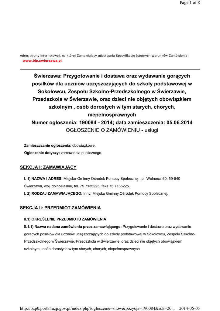 Page 1 of 8 Adres strony internetowej, na której Zamawiający udostępnia Specyfikację Istotnych Warunków Zamówienia: www.bip.swierzawa.pl Świerzawa: Przygotowanie i dostawa oraz wydawanie gorących posiłków dla uczniów uczęszczających do szkoły podstawowej w Sokołowcu, Zespołu Szkolno-Przedszkolnego w Świerzawie, Przedszkola w Świerzawie, oraz dzieci nie objętych obowiązkiem szkolnym , osób dorosłych w tym starych, chorych, niepełnosprawnych Numer ogłoszenia: 190084 - 2014; data zamieszczenia: 05.06.2014 OGŁOSZENIE O ZAMÓWIENIU - usługi Zamieszczanie ogłoszenia: obowiązkowe. Ogłoszenie dotyczy: zamówienia publicznego. SEKCJA I: ZAMAWIAJĄCY I. 1) NAZWA I ADRES: Miejsko-Gminny Ośrodek Pomocy Społecznej , pl. Wolności 60, 59-540 Świerzawa, woj. dolnośląskie, tel. 75 7135225, faks 75 7135225. I. 2) RODZAJ ZAMAWIAJĄCEGO: Inny: Miejsko Gminny Ośrodek Pomocy Społecznej. SEKCJA II: PRZEDMIOT ZAMÓWIENIA II.1) OKREŚLENIE PRZEDMIOTU ZAMÓWIENIA II.1.1) Nazwa nadana zamówieniu przez zamawiającego: Przygotowanie i dostawa oraz wydawanie gorących posiłków dla uczniów uczęszczających do szkoły podstawowej w Sokołowcu, Zespołu SzkolnoPrzedszkolnego w Świerzawie, Przedszkola w Świerzawie, oraz dzieci nie objętych obowiązkiem szkolnym , osób dorosłych w tym starych, chorych, niepełnosprawnych. http://bzp0.portal.uzp.gov.pl/index.php?ogloszenie=show&pozycja=190084&rok=20... 2014-06-05 Page 2 of 8 II.1.2) Rodzaj zamówienia: usługi. II.1.4) Określenie przedmiotu oraz wielkości lub zakresu zamówienia: Przedmiotem Zamówienia publicznego w trybie przetargu nieograniczonego jest przygotowywanie i wydawanie gorącego posiłku dla klientów oraz uczniów i dzieci młodszych wskazanych przez M -GOPS w Świerzawie w okresach od 01 lipca 2014r do 31 grudnia 2014r. W związku z realizacją programu wieloletniego Pomoc Państwa w zakresie dożywiania na terenie miasta i gminy Świerzawa Zamawiający zleca a Wykonawca przyjmuje do wykonania przygotowanie i wydawanie oraz dostawę własnym specjalistycznym transportem gorących posiłków dla około 227 osób (dziennie). Dowóz własnym specjalistycznym transportem posiłków w termosach do następujących szkół: - Szkoła Podstawowa w Sokołowcu, - Gimnazjum w Świerzawie, Zespół Szkolno Przedszkolny w Świerzawie, Przedszkole w Świerzawie. Posiłki będą wydawane przez pięć dni w tygodniu od poniedziałku do piątku, w dni w których odbywa się nauka w szkołach w pomieszczeniach do tego wyznaczonych przez dyrektora placówki. Jeśli dzieci będą uczęszczać do szkoły w inny dzień np. odpracowywać zajęcia szkole, dzieci objęte są tą formą pomocy lecz ten fakt należy zgłosić z 3 dniowym wyprzedzeniem dowożącemu i wydającemu gorące posiłki. 1.Gorący posiłek dla klientów M - GOPS winien składać się z jednego gorącego dania tj. zupy z wkładką: - zupy - minimum 0,5 l zupy gotowanej na wywarze mięsnym lub warzywnym; - wkładka - 100g porcja mięsa (waga po przetworzeniu) lub 200g gotowanej kaszy, ryżu, makaronu lub ziemniaków z sosem. Dopuszcza się dwa razy w tygodniu przygotowanie posiłku bez mięsa i zastąpieniem go produktami z zawartością białka zwierzęcego tj.: ryba - 100g (waga po przetworzeniu) lub jaja - 2 szt, lub 200g dania jarskie np. kluski śląskie, pierogi, krokiety, gołąbki, naleśniki. 2.Gorący posiłek dla uczniów i dzieci młodszych winien składać się z jednego gorącego dania naprzemiennie tj. zupy lub drugiego dania: - zupy - minimum 0,5 l zupy gotowanej na wywarze mięsnym lub warzywnym oraz minimum 200g pieczywa; - drugie danie - 100g porcja mięsa (waga po przetworzeniu), 150 - 200g gotowanej kaszy, ryżu, makaronu lub ziemniaków oraz 100g-150g surówki. Dopuszcza się raz w tygodniu przygotowanie posiłku bez mięsa i zastąpieniem go produktami z zawartością białka zwierzęcego tj.: ryba - 100g (waga po przetworzeniu) lub jaja - 2 szt. lub 200g dania jarskie np. kluski śląskie, pierogi, krokiety, gołąbki, naleśniki. Gorący posiłek dla klientów MGOPS(zupa z wkładką) będzie przygotowywany na pięć dni tygodnia i wydawany w godzinach od 14.00 do http://bzp0.portal.uzp.gov.pl/index.php?ogloszenie=show&pozycja=190084&rok=20... 2014-06-05 Page 3 of 8 15.30, w ilości około 127 posiłków dziennie w punkcie żywieniowym, który spełnia wymogi sanitarne na terenie miasta Świerzawa, oraz dla uczniów i dzieci młodszych w ilości około 100 posiłków dziennie wydawany w godzinach od 12.00 do 12.30 przy stołówkach szkolnych w Szkole Podstawowej w Sokołowcu, Zespole Szkolno Przedszkolnym w Świerzawie, Przedszkolu w Świerzawie oraz w Gimnazjum w Świerzawie. Jadłospis posiłków na 4 tygodnie wraz z gramaturą stanowić będzie integralną część oferty. W przypadku wyboru oferty Wykonawca zobowiązany jest realizować przedłożony jadłospis. - Posiłki muszą być wydane w punkcie żywieniowym spełniającym wymogi sanitarno-higieniczne. - Posiłki muszą być wydawane w punkcie żywieniowym jako produkty o temperaturze 60ºC - 80ºC - zgodnie z normami żywieniowymi. - Punkt żywieniowy musi być zlokalizowany w budynku ogrzewanym, w którym zorganizowane będzie co najmniej 20 miejsc siedzących (przy stołach). - Nie można zaniżać ustalonej wagi posiłków. Posiłki będą wydawane uprawnionym klientom na podstawie wydanej decyzji oraz listy osób objętych ww. formą pomocy przez M-GOPS w Świerzawie. Wynagrodzenie należne Wykonawcy obejmować będzie rzeczywistą liczbę posiłków wydanych w danym okresie rozliczeniowym. Ustala się miesięczny okres rozliczeniowy (miesiąc kalendarzowy). Po upływie każdego miesiąca kalendarzowego Wykonawca przedstawi fakturę wraz z miesięcznym zestawieniem wydanych posiłków przez uprawnionych odbiorców(wykaz uczniów osób korzystających posiłków tj. imię i nazwisko ucznia(osoby), ilość dni wydawania posiłków w miesiącu, koszt jednego posiłku, wartość