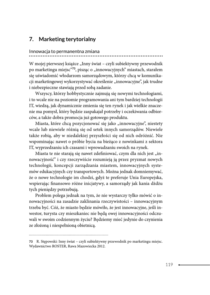 7. Marketing terytorialny Innowacja to permanentna zmiana W mojej pierwszej książce „Inny świat – czyli subiektywny przewodnik po marketingu miejsc”73, pisząc o „innowacyjnych” miastach, starałem się uświadomić włodarzom samorządowym, którzy chcą w komunikacji marketingowej wykorzystywać określenie „innowacyjne”, jak trudne i niebezpieczne stawiają przed sobą zadanie. Wszyscy, którzy hobbystycznie zajmują się nowymi technologiami, i to wcale nie na poziomie programowania ani tym bardziej technologii IT, wiedzą, jak dynamicznie zmienia się ten rynek i jak wielkie znaczenie ma pomysł, który będzie zaspakajał potrzeby i oczekiwania odbiorców, a także dobra promocja już gotowego produktu. Miasta, które chcą pozycjonować się jako „innowacyjne”, niestety wcale lub niewiele różnią się od setek innych samorządów. Niewiele także robią, aby w niedalekiej przyszłości się od nich odróżnić. Nie wspominając nawet o próbie bycia na bieżąco z nowinkami z sektora IT, wyprzedzaniu ich czasami i wprowadzaniu swoich na rynek. Miasta te nie starają się nawet zdefiniować, czym dla nich jest „innowacyjność” i czy rzeczywiście rozumieją ją przez pryzmat nowych technologii, koncepcji zarządzania miastem, innowacyjnych systemów edukacyjnych czy transportowych. Można jednak domniemywać, że o nowe technologie im chodzi, gdyż te preferuje Unia Europejska, wspierając finansowo różne inicjatywy, a samorządy jak kania dżdżu tych pieniędzy potrzebują. Problem polega jednak na tym, że nie wystarczy tylko mówić o innowacyjności na zasadzie zaklinania rzeczywistości – innowacyjnym trzeba być. Cóż, że miasto będzie mówiło, że jest innowacyjne, jeśli inwestor, turysta czy mieszkaniec nie będą owej innowacyjności odczuwali w swoim codziennym życiu? Będziemy mieć jedynie do czynienia ze złożoną i niespełnioną obietnicą. 73 R. Stępowski: Inny świat – czyli subiektywny przewodnik po marketingu miejsc. Wydawnictwo ROSTER, Rawa Mazowiecka 2012. 119 We wspomnianej książce porównywałem, jak zmienił się świat i jak szybko dziś można stracić palmę pierwszeństwa i innowacyjności, jeśli w ogóle się ją kiedykolwiek, poza hasłem promocyjnym, posiadało. Kiedyś by coś wyprodukować, potrzeba było fabryki, sprzętu, setek ludzi, wieloletnich planów i dużych pieniędzy. Dziś wystarczy pomysł i umiejętności. Konkurencja jest szalona. Dziś wymyślone, dziś zrealizowane, dziś dostęp do tego produktu ma cały świat. Wystarczy zobaczyć, jak powstał Facebook i polski portal NK (Nasza Klasa). Kiedyś ktoś w jakimś akademiku wymyślił coś, z czego korzystają miliony, a w przypadku Facebooka – miliardy osób, natomiast pomysłodawcy są dziś milionerami lub miliarderami, a kilka lat temu byli tylko zwykłymi studentami. Żyjemy w czasach ogromnej i permanentnej zmiany, przed którą nie da się uciec. To fala, która przemierza ocean, a za nią pędzi kolejna. Aby trwać, cały czas musimy trzymać te fale za grzywy. Proces wiecznej zmiany nie należy do łatwych, ale jest niezbędny. My, niestety, bardzo często stoimy w rozkroku. Chcemy być nowocześni i „innowacyjni”. Zdobywamy wiedzę i umiejętności, wykorzystujemy narzędzia, ale kurczowo trzymamy „stary ogon”. Chcielibyśmy być ultratradycyjnym narodem i maksymalnie innowacyjnym. Można by nawet użyć Mickiewiczowskiego określenia „tu miłość, tam powinność” – czyli umiłowanie nowinek technicznych i konieczność dbania o to, co sprawdzone i tradycyjne. Dlaczego zatem skoro chcemy być „innowacyjni”, tak mocno trzymamy się „starego” biznesu? Oczywiście ze względu na pieniądze, które on generuje na stabilnym poziomie (nawet jeśli systematycznie zmniejszającym się). Pieniądze jednak same nie przelewają się z konta na konto. Robią to ludzie. I to ludzie mentalnie nie są w stanie przestawić się na „innowacyjne” myślenie. Dlatego choć marzą o przysłowiowym „gołębiu na dachu”, czasami rzucą mu nawet kilka ziarenek, aby go zwabić, to jednak mimo wszystko pieniądze wyłożą na „wróbla w garści”. 120 Jednak to ludzie decydują o budżetach reklamowych i ewentualnym inwestowaniu w to, co innowacyjne. Miejsce pochodzenia ma znaczenie? Kiedy widzisz produkt ze szwajcarskim krzyżem na czerwonym tle, to jakie masz skojarzenia? Co myślisz o marce, zanim jeszcze kupisz produkt i go użyjesz? Zapewne jesteś przekonany o wysokiej jakości, trwałości i skuteczności oraz precyzji wykonania danego produktu lub usługi. Takie atrybuty ma właśnie marka Szwajcaria, a my podświadomie przenosimy je na marki, co do których jesteśmy przekonani, że właśnie z tego kraju pochodzą. Prawda jest jednak taka, że wcale nie wszystkie produkty oznaczone charakterystycznym logo są produkowane w Szwajcarii. Ba, producenci niektórych nawet nic wspólnego ze Szwajcarią nie mają. Potrafią tylko doskonale wykorzystywać postrzeganie tego kraju. Z raportu ARC Rynek i Opinia74 dotyczącego potencjału miejsca pochodzenia w marketingu produktów spożywczych wynika, że 25% Polaków podczas dokonywania wyboru przywiązuje wagę do miejsca pochodzenia produktu spożywczego. Dziewięćdziesiąt procent respondentów deklaruje, że byłoby gotowych zapłacić 10% więcej za masło, jeśli pochodziłoby ono z Warmii i Mazur. Natomiast 80% ankietowanych deklaruje, że byłoby w stanie zapłacić 10% więcej za jabłka, jeśli byłyby one z Podkarpacia. Wśród kobiet 31,6% z przedziału wiekowego 30-39 lat, a także 44% osób powyżej 40. roku życia i zarabiających więcej niż 1700 zł deklaruje, że przy zakupie produktu sugeruje się jego pochodzeniem. http://www.arc.com.pl/potencjal_miejsca_pochodzenia_w_marketingu_produktow_spozywczych-41999268-pl.html (dostęp: 6.08.2014). 74 121