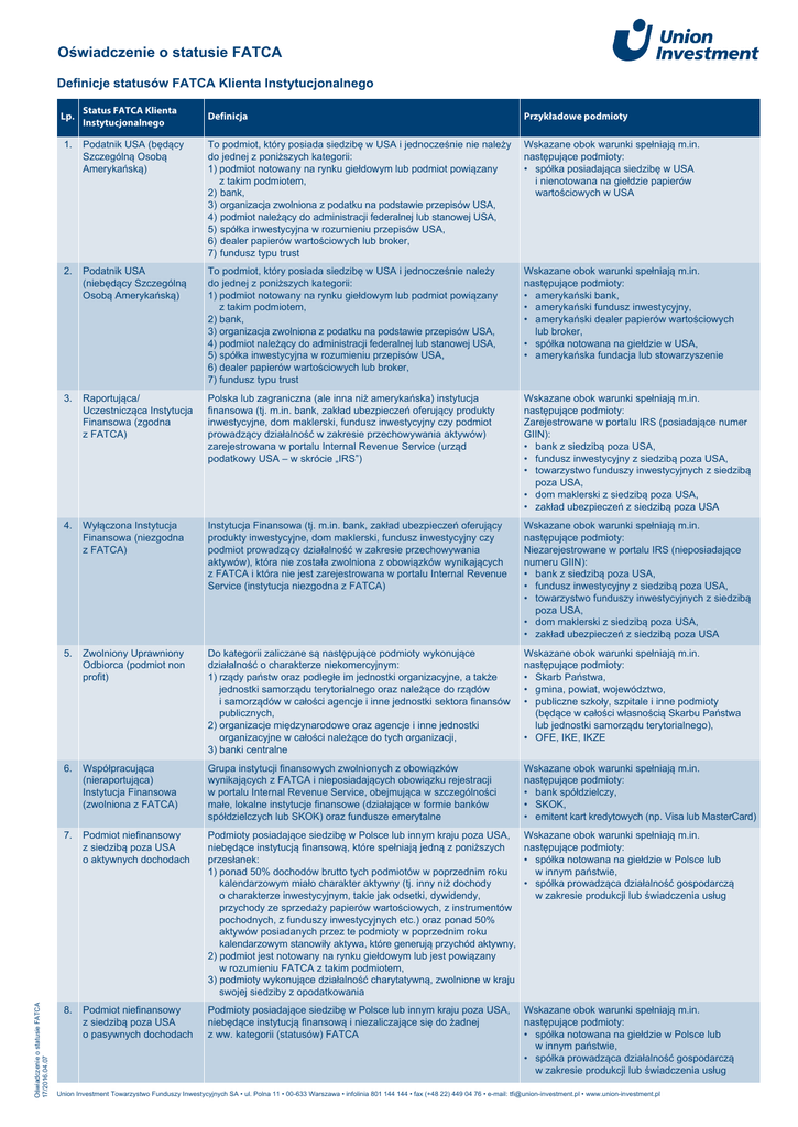 Oświadczenie o statusie FATCA Definicje statusów FATCA Klienta Instytucjonalnego Oświadczenie o statusie FATCA 17/2016.04.07 Lp. Status FATCA Klienta Instytucjonalnego Definicja Przykładowe podmioty 1. Podatnik USA (będący Szczególną Osobą Amerykańską) To podmiot, który posiada siedzibę w USA i jednocześnie nie należy do jednej z poniższych kategorii: 1) podmiot notowany na rynku giełdowym lub podmiot powiązany z takim podmiotem, 2) bank, 3) organizacja zwolniona z podatku na podstawie przepisów USA, 4) podmiot należący do administracji federalnej lub stanowej USA, 5) spółka inwestycyjna w rozumieniu przepisów USA, 6) dealer papierów wartościowych lub broker, 7) fundusz typu trust Wskazane obok warunki spełniają m.in. następujące podmioty: • spółka posiadająca siedzibę w USA i nienotowana na giełdzie papierów wartościowych w USA 2. Podatnik USA (niebędący Szczególną Osobą Amerykańską) To podmiot, który posiada siedzibę w USA i jednocześnie należy do jednej z poniższych kategorii: 1) podmiot notowany na rynku giełdowym lub podmiot powiązany z takim podmiotem, 2) bank, 3) organizacja zwolniona z podatku na podstawie przepisów USA, 4) podmiot należący do administracji federalnej lub stanowej USA, 5) spółka inwestycyjna w rozumieniu przepisów USA, 6) dealer papierów wartościowych lub broker, 7) fundusz typu trust Wskazane obok warunki spełniają m.in. następujące podmioty: • amerykański bank, • amerykański fundusz inwestycyjny, • amerykański dealer papierów wartościowych lub broker, • spółka notowana na giełdzie w USA, • amerykańska fundacja lub stowarzyszenie 3. Raportująca/ Uczestnicząca Instytucja Finansowa (zgodna z FATCA) Polska lub zagraniczna (ale inna niż amerykańska) instytucja finansowa (tj. m.in. bank, zakład ubezpieczeń oferujący produkty inwestycyjne, dom maklerski, fundusz inwestycyjny czy podmiot prowadzący działalność w zakresie przechowywania aktywów) zarejestrowana w portalu Internal Revenue Service (urząd podatkowy USA – w skrócie „IRS”) Wskazane obok warunki spełniają m.in. następujące podmioty: Zarejestrowane w portalu IRS (posiadające numer GIIN): • bank z siedzibą poza USA, • fundusz inwestycyjny z siedzibą poza USA, • towarzystwo funduszy inwestycyjnych z siedzibą poza USA, • dom maklerski z siedzibą poza USA, • zakład ubezpieczeń z siedzibą poza USA 4. Wyłączona Instytucja Finansowa (niezgodna z FATCA) Instytucja Finansowa (tj. m.in. bank, zakład ubezpieczeń oferujący produkty inwestycyjne, dom maklerski, fundusz inwestycyjny czy podmiot prowadzący działalność w zakresie przechowywania aktywów), która nie została zwolniona z obowiązków wynikających z FATCA i która nie jest zarejestrowana w portalu Internal Revenue Service (instytucja niezgodna z FATCA) Wskazane obok warunki spełniają m.in. następujące podmioty: Niezarejestrowane w portalu IRS (nieposiadające numeru GIIN): • bank z siedzibą poza USA, • fundusz inwestycyjny z siedzibą poza USA, • towarzystwo funduszy inwestycyjnych z siedzibą poza USA, • dom maklerski z siedzibą poza USA, • zakład ubezpieczeń z siedzibą poza USA 5. Zwolniony Uprawniony Odbiorca (podmiot non profit) Do kategorii zaliczane są następujące podmioty wykonujące działalność o charakterze niekomercyjnym: 1) rządy państw oraz podległe im jednostki organizacyjne, a także jednostki samorządu terytorialnego oraz należące do rządów i samorządów w całości agencje i inne jednostki sektora finansów publicznych, 2) organizacje międzynarodowe oraz agencje i inne jednostki organizacyjne w całości należące do tych organizacji, 3) banki centralne Wskazane obok warunki spełniają m.in. następujące podmioty: • Skarb Państwa, • gmina, powiat, województwo, • publiczne szkoły, szpitale i inne podmioty (będące w całości własnością Skarbu Państwa lub jednostki samorządu terytorialnego), • OFE, IKE, IKZE 6. Współpracująca (nieraportująca) Instytucja Finansowa (zwolniona z FATCA) Grupa instytucji finansowych zwolnionych z obowiązków wynikających z FATCA i nieposiadających obowiązku rejestracji w portalu Internal Revenue Service, obejmująca w szczególności małe, lokalne instytucje finansowe (działające w formie banków spółdzielczych lub SKOK) oraz fundusze emerytalne Wskazane obok warunki spełniają m.in. następujące podmioty: • bank spółdzielczy, • SKOK, • emitent kart kredytowych (np. Visa lub MasterCard) 7. Podmiot niefinansowy z siedzibą poza USA o aktywnych dochodach Podmioty posiadające siedzibę w Polsce lub innym kraju poza USA, niebędące instytucją finansową, które spełniają jedną z poniższych przesłanek: 1) ponad 50% dochodów brutto tych podmiotów w poprzednim roku kalendarzowym miało charakter aktywny (tj. inny niż dochody o charakterze inwestycyjnym, takie jak odsetki, dywidendy, przychody ze sprzedaży papierów wartościowych, z instrumentów pochodnych, z funduszy inwestycyjnych etc.) oraz ponad 50% aktywów posiadanych przez te podmioty w poprzednim roku kalendarzowym stanowiły aktywa, które generują przychód aktywny, 2) podmiot jest notowany na rynku giełdowym lub jest powiązany w rozumieniu FATCA z takim podmiotem, 3) podmioty wykonujące działalność charytatywną, zwolnione w kraju swojej siedziby z opodatkowania Wskazane obok warunki spełniają m.in. następujące podmioty: • spółka notowana na giełdzie w Polsce lub w innym państwie, • spółka prowadząca działalność gospodarczą w zakresie produkcji lub świadczenia usług 8. Podmiot niefinansowy z siedzibą poza USA o pasywnych dochodach Podmioty posiadające siedzibę w Polsce lub innym kraju poza USA, niebędące instytucją finansową i niezaliczające się do żadnej z ww. kategorii (statusów) FATCA Wskazane obok warunki spełniają m.in. następujące podmioty: • spółka notowana na giełdzie w Polsce lub w inny