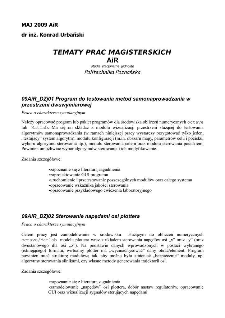MAJ 2009 AiR dr inż. Konrad Urbański TEMATY PRAC MAGISTERSKICH AiR studia stacjonarne jednolite Politechnika Poznańska 09AiR_DZj01 Program do testowania metod samonaprowadzania w przestrzeni dwuwymiarowej Praca o charakterze symulacyjnym Należy opracować program lub pakiet programów dla środowiska obliczeń numerycznych octave lub Matlab. Ma się on składać z modułu wizualizacji przestrzeni służącej do testowania algorytmów samonaprowadzania (w ramach niniejszej pracy wystarczy przygotować tylko jeden, „testujący” system algorytm), modułu konfiguracji (m.in. obszaru mapy, parametrów celu i pocisku, wyboru algorytmu sterowania itp.), modułu sterowania celem oraz modułu sterowania pociskiem. Powinien umożliwiać wybór algorytmów sterowania i ich modyfikowanie. Zadania szczegółowe: •zapoznanie się z literaturą zagadnienia GUI programu •uruchomienie i przetestowanie poszczególnych modułów oraz całego systemu •opracowanie wskaźnika jakości sterowania •opracowanie przykładowego ćwiczenia laboratoryjnego •zaprojektowanie 09AiR_DZj02 Sterowanie napędami osi plottera Praca o charakterze symulacyjnym Celem pracy jest zamodelowanie w środowisku służącym do obliczeń numerycznych octave/Matlab modelu plottera wraz z układem sterowania napędów osi „x” oraz „y” (oraz dwustanowego dla osi „z”). Na podstawie danych wprowadzonych w postaci wybranego (istniejącego) formatu, wirtualny plotter ma „wycinać/rysować” dany obraz/element. Program powinien mieć strukturę modułową tak, aby można było zmieniać „bezpiecznie” moduły, np. algorytmy sterowania silnikami, czy własne metody generowania trajektorii osi. Zadania szczegółowe: •zapoznanie się z literaturą zagadnienia •zamodelowanie „napędów” osi plottera, dobór nastaw regulatorów, opracowanie GUI oraz wizualizacji sygnałów sterujących napędami •wybór formatu wprowadzania danych •opracowanie „ręcznego” sterowania plotterem •opracowanie przykładowego ćwiczenia laboratoryjnego 09AiR_DZj03 Pomiar odległości metodami akustycznymi Praca o charakterze programistycznym Wykorzystując gotowy system akustyczny (niskobudżetowy) wbudowany w komputer PC, telefon komórkowy lub PPC należy opracować system pomiaru odległości. Zadania szczegółowe: •zapoznanie się z literaturą zagadnienia algorytmów pomiarowych oraz metod analizy i wizualizacji danych •opracowanie 09AiR_DZj04 Wykorzystanie transmisji szeregowej do sterowania modelem wyrzutni rakiet Praca o charakterze programistycznym Wykorzystując gotowy model wyrzutni (komercyjna zabawka USB-rocket-launcher) należy opracować własny interfejs sterujący dla systemu Windows XP umożliwiający programowe sterowanie w języku C, w m-pliku itp. w miejsce „zabawkowego” interfejsu. Podstawowy („fabryczny”) sposób sterowania sprowadza się do prostego sterowania binarnego silnikami 2 osi – lewo/prawo oraz „odpalenie rakiety” UWAGA! Model nie posiada oficjalnej dokumentacji. Zadania szczegółowe: •zapoznanie się z literaturą zagadnienia środowiska uruchomieniowego dla wyrzutni •opracowanie 09AiR_DZj05 Środowisko analizy systemów sterowania w automatyce dla urządzeń mobilnych Praca o charakterze programistycznym Należy opracować pakiet funkcji dotyczących analizy stabilności gotowych bloków transmitancji uruchamiany w telefonach komórkowych lub urządzeniach PPC. Gotowe środowisko ma być udostępnione społeczności internetowej. Zadania szczegółowe: •zapoznanie się z literaturą zagadnienia •przygotowanie „mapy” programu oraz sposobu wprowadzania danych •opracowanie wybranych funkcji wraz z wizualizacją wyników