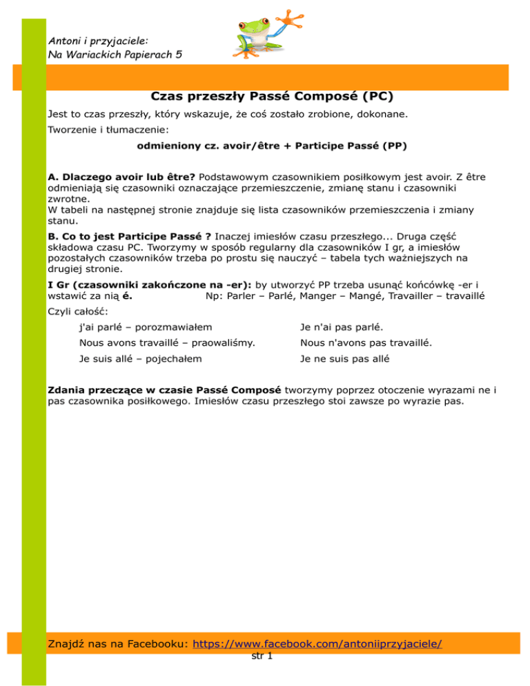 Antoni i przyjaciele: Na Wariackich Papierach 5 Czas przeszły Passé Composé (PC) Jest to czas przeszły, który wskazuje, że coś zostało zrobione, dokonane. Tworzenie i tłumaczenie: odmieniony cz. avoir/être + Participe Passé (PP) A. Dlaczego avoir lub être? Podstawowym czasownikiem posiłkowym jest avoir. Z être odmieniają się czasowniki oznaczające przemieszczenie, zmianę stanu i czasowniki zwrotne. W tabeli na następnej stronie znajduje się lista czasowników przemieszczenia i zmiany stanu. B. Co to jest Participe Passé ? Inaczej imiesłów czasu przeszłego... Druga część składowa czasu PC. Tworzymy w sposób regularny dla czasowników I gr, a imiesłów pozostałych czasowników trzeba po prostu się nauczyć – tabela tych ważniejszych na drugiej stronie. I Gr (czasowniki zakończone na -er): by utworzyć PP trzeba usunąć końcówkę -er i wstawić za nią é. Np: Parler – Parlé, Manger – Mangé, Travailler – travaillé Czyli całość: j'ai parlé – porozmawiałem Je n'ai pas parlé. Nous avons travaillé – praowaliśmy. Nous n'avons pas travaillé. Je suis allé – pojechałem Je ne suis pas allé Zdania przeczące w czasie Passé Composé tworzymy poprzez otoczenie wyrazami ne i pas czasownika posiłkowego. Imiesłów czasu przeszłego stoi zawsze po wyrazie pas. Znajdź nas na Facebooku: https://www.facebook.com/antoniiprzyjaciele/ str 1 Antoni i przyjaciele: Na Wariackich Papierach 5 Tabela czasowników przemieszczenia i zmiany stanu: Ważniejsze imiesłowy czasu przeszłego Naître Rodzić się vouloir voulu venir Przychodzić, przyjeżdżać, przyjść, przybyć savoir su arriver Przychodzić, przyjeżdżać, przyjść, przybyć avoir eu monter Wchodzić, podchodzić, wejść, podejść Être été entrer Wchodzić do środka, wejść Venir venu rester Pozostawać, pozostać Pouvoir pu sortir Wyjść, wychodzić Entendre entendu passer Przechodzić, przelatywać, przejść, przelecieć Boire bu retourner Zawracać, wrócić Attendre attendu rentrer Wracać, wrócić Dormir dormi descendre Schodzić, zejść Faire fait tomber Upadać, spadać, upaść, spaść Ouvrir ouvert partir Wyjeżdżać, wyjechać Descendre descendu aller Iść, jechać, pójść, pojechać Écrire écrit mourir Umierać, umrzeć Comprendre compris Prendre pris Znajdź nas na Facebooku: https://www.facebook.com/antoniiprzyjaciele/ str 2
