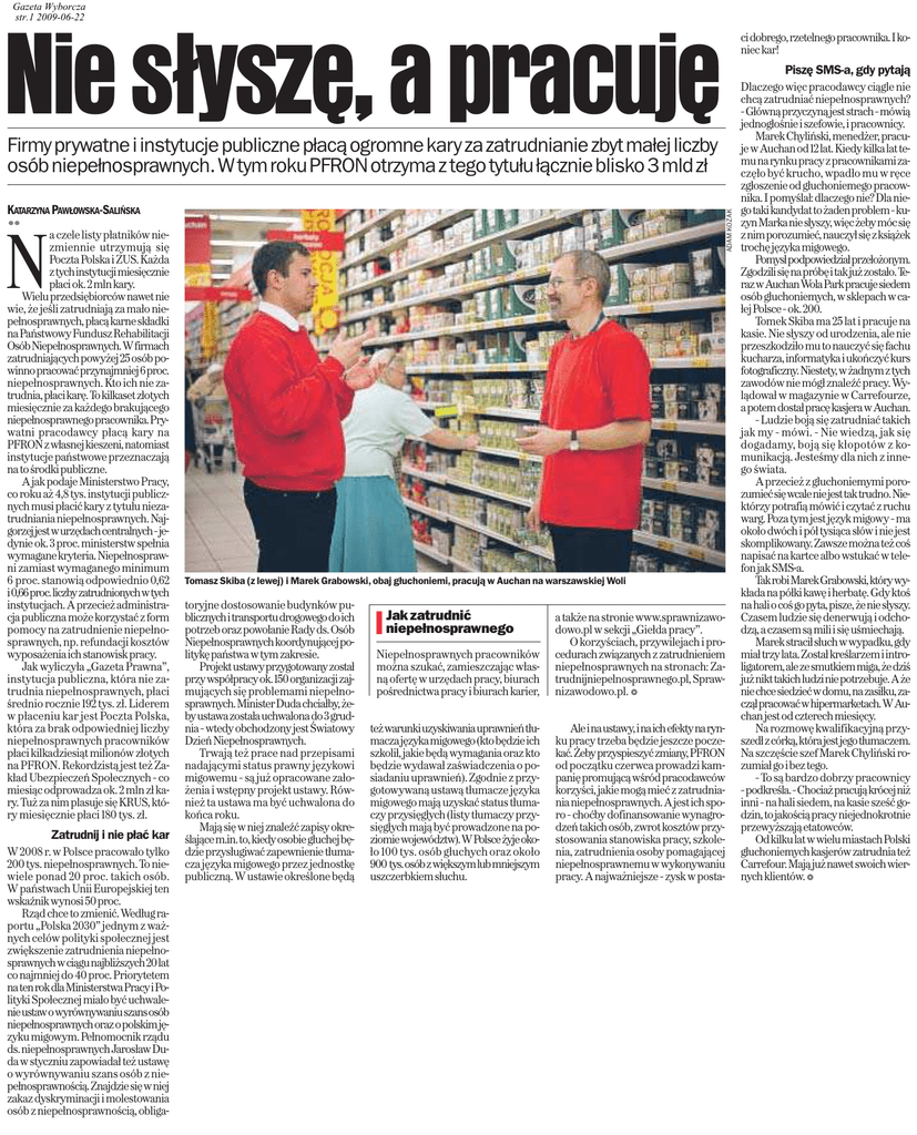 Gazeta Wyborcza str.1 2009-06-22 ci dobrego, rzetelnego pracownika. Ikoniec kar! Nie słyszę, apracuję Piszę SMS-a, gdy pytają Firmy prywatne i instytucje publiczne płacą ogromne kary za zatrudnianie zbyt małej liczby osób niepełnosprawnych. W tym roku PFRON otrzyma z tego tytułu łącznie blisko 3 mld zł a czele listy płatników niezmiennie utrzymują się Poczta Polska i ZUS. Każda z tych instytucji miesięcznie płaci ok. 2 mln kary. Wielu przedsiębiorców nawet nie wie, że jeśli zatrudniają za mało niepełnosprawnych, płacą karne składki na Państwowy Fundusz Rehabilitacji Osób Niepełnosprawnych. Wfirmach zatrudniających powyżej 25 osób powinno pracować przynajmniej 6 proc. niepełnosprawnych. Kto ich nie zatrudnia, płaci karę. To kilkaset złotych miesięcznie za każdego brakującego niepełnosprawnego pracownika. Prywatni pracodawcy płacą kary na PFRON zwłasnej kieszeni, natomiast instytucje państwowe przeznaczają na to środki publiczne. A jak podaje Ministerstwo Pracy, co roku aż 4,8 tys. instytucji publicznych musi płacić kary z tytułu niezatrudniania niepełnosprawnych. Najgorzej jest wurzędach centralnych –jedynie ok. 3 proc. ministerstw spełnia wymagane kryteria. Niepełnosprawni zamiast wymaganego minimum 6 proc. stanowią odpowiednio 0,62 i0,66 proc. liczby zatrudnionych wtych instytucjach. A przecież administracja publiczna może korzystać z form pomocy na zatrudnienie niepełnosprawnych, np. refundacji kosztów wyposażenia ich stanowisk pracy. Jak wyliczyła „Gazeta Prawna”, instytucja publiczna, która nie zatrudnia niepełnosprawnych, płaci średnio rocznie 192 tys. zł. Liderem w płaceniu kar jest Poczta Polska, która za brak odpowiedniej liczby niepełnosprawnych pracowników płaci kilkadziesiąt milionów złotych na PFRON. Rekordzistą jest też Zakład Ubezpieczeń Społecznych – co miesiąc odprowadza ok. 2 mln zł kary. Tuż za nim plasuje się KRUS, który miesięcznie płaci 180 tys. zł. ADAM KOZAK KATARZYNA PAWŁOWSKA-SALIŃSKA N Zatrudnij i nie płać kar W 2008 r. w Polsce pracowało tylko 200 tys. niepełnosprawnych. To niewiele ponad 20 proc. takich osób. W państwach Unii Europejskiej ten wskaźnik wynosi 50 proc. Rząd chce to zmienić. Według raportu „Polska 2030” jednym z ważnych celów polityki społecznej jest zwiększenie zatrudnienia niepełnosprawnych wciągu najbliższych 20 lat co najmniej do 40 proc. Priorytetem na ten rok dla Ministerstwa Pracy iPolityki Społecznej miało być uchwalenie ustaw owyrównywaniu szans osób niepełnosprawnych oraz opolskim języku migowym. Pełnomocnik rządu ds. niepełnosprawnych Jarosław Duda w styczniu zapowiadał też ustawę o wyrównywaniu szans osób z niepełnosprawnością. Znajdzie się wniej zakaz dyskryminacji i molestowania osób z niepełnosprawnością, obliga- Tomasz Skiba (z lewej) i Marek Grabowski, obaj głuchoniemi, pracują w Auchan na warszawskiej Woli toryjne dostosowanie budynków publicznych itransportu drogowego do ich potrzeb oraz powołanie Rady ds. Osób Niepełnosprawnych koordynującej politykę państwa wtym zakresie. Projekt ustawy przygotowany został przy współpracy ok. 150 organizacji zajmujących się problemami niepełnosprawnych. Minister Duda chciałby, żeby ustawa została uchwalona do 3 grudnia – wtedy obchodzony jest Światowy Dzień Niepełnosprawnych. Trwają też prace nad przepisami nadającymi status prawny językowi migowemu – są już opracowane założenia i wstępny projekt ustawy. Również ta ustawa ma być uchwalona do końca roku. Mają się w niej znaleźć zapisy określające m.in. to, kiedy osobie głuchej będzie przysługiwać zapewnienie tłumacza języka migowego przez jednostkę publiczną. W ustawie określone będą R E Jak zatrudnić niepełnosprawnego Niepełnosprawnych pracowników można szukać, zamieszczając własną ofertę w urzędach pracy, biurach pośrednictwa pracy i biurach karier, a także na stronie www.sprawnizawodowo.pl w sekcji „Giełda pracy”. O korzyściach, przywilejach i procedurach związanych z zatrudnieniem niepełnosprawnych na stronach: Zatrudnijniepelnosprawnego.pl, Sprawnizawodowo.pl. 1 też warunki uzyskiwania uprawnień tłumacza języka migowego (kto będzie ich szkolił, jakie będą wymagania oraz kto będzie wydawał zaświadczenia o posiadaniu uprawnień). Zgodnie z przygotowywaną ustawą tłumacze języka migowego mają uzyskać status tłumaczy przysięgłych (listy tłumaczy przysięgłych mają być prowadzone na poziomie województw). W Polsce żyje około 100 tys. osób głuchych oraz około 900 tys. osób zwiększym lub mniejszym uszczerbkiem słuchu. Ale ina ustawy, ina ich efekty na rynku pracy trzeba będzie jeszcze poczekać. Żeby przyspieszyć zmiany, PFRON od początku czerwca prowadzi kampanię promującą wśród pracodawców korzyści, jakie mogą mieć z zatrudniania niepełnosprawnych. Ajest ich sporo – choćby dofinansowanie wynagrodzeń takich osób, zwrot kosztów przystosowania stanowiska pracy, szkolenia, zatrudnienia osoby pomagającej niepełnosprawnemu w wykonywaniu pracy. A najważniejsze – zysk w posta- K L 28093400 A Dlaczego więc pracodawcy ciągle nie chcą zatrudniać niepełnosprawnych? –Główną przyczyną jest strach –mówią jednogłośnie iszefowie, ipracownicy. Marek Chyliński, menedżer, pracuje w Auchan od 12 lat. Kiedy kilka lat temu na rynku pracy zpracownikami zaczęło być krucho, wpadło mu w ręce zgłoszenie od głuchoniemego pracownika. I pomyślał: dlaczego nie? Dla niego taki kandydat to żaden problem –kuzyn Marka nie słyszy, więc żeby móc się znim porozumieć, nauczył się zksiążek trochę języka migowego. Pomysł podpowiedział przełożonym. Zgodzili się na próbę itak już zostało. Teraz wAuchan Wola Park pracuje siedem osób głuchoniemych, wsklepach wcałej Polsce – ok. 200. Tomek Skiba ma 25 lat i pracuje na kasie. Nie słyszy od urodzenia, ale nie