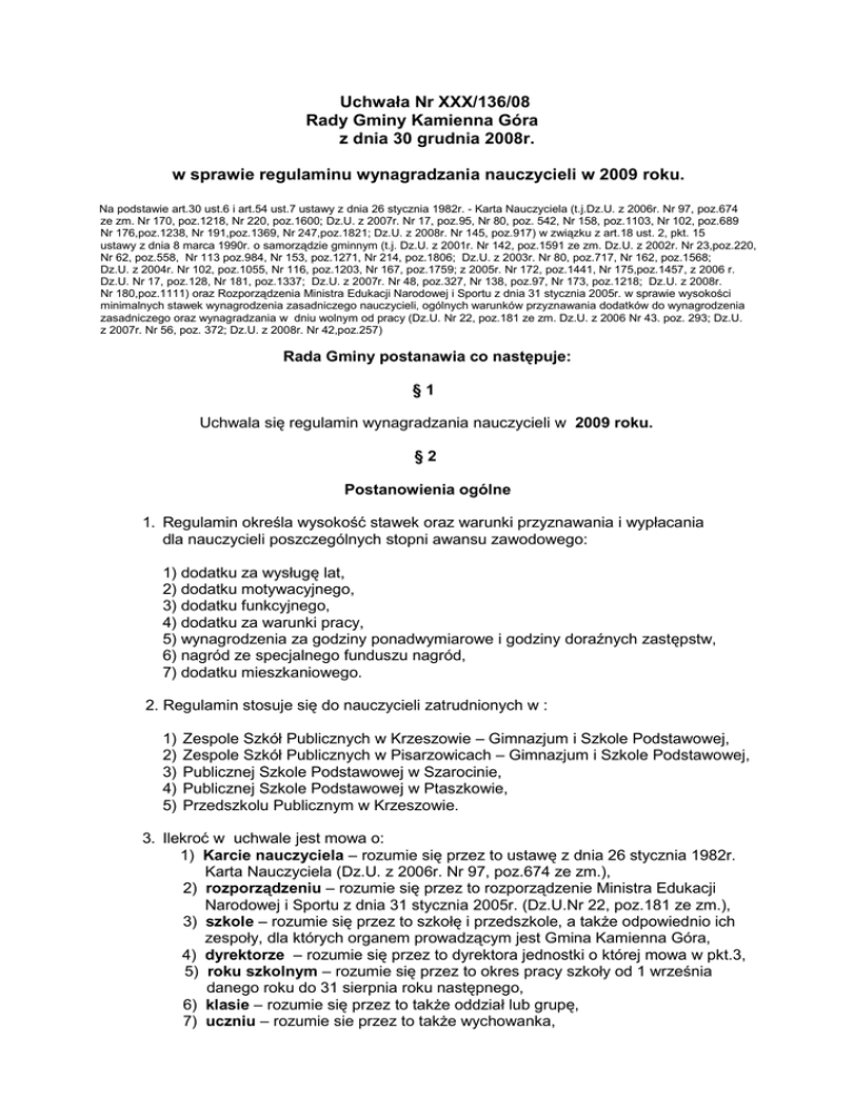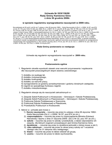 Uchwała Nr XXX/136/08 Rady Gminy Kamienna Góra z dnia 30 grudnia 2008r. w sprawie regulaminu wynagradzania nauczycieli w 2009 roku. Na podstawie art.30 ust.6 i art.54 ust.7 ustawy z dnia 26 stycznia 1982r. - Karta Nauczyciela (t.j.Dz.U. z 2006r. Nr 97, poz.674 ze zm. Nr 170, poz.1218, Nr 220, poz.1600; Dz.U. z 2007r. Nr 17, poz.95, Nr 80, poz. 542, Nr 158, poz.1103, Nr 102, poz.689 Nr 176,poz.1238, Nr 191,poz.1369, Nr 247,poz.1821; Dz.U. z 2008r. Nr 145, poz.917) w związku z art.18 ust. 2, pkt. 15 ustawy z dnia 8 marca 1990r. o samorządzie gminnym (t.j. Dz.U. z 2001r. Nr 142, poz.1591 ze zm. Dz.U. z 2002r. Nr 23,poz.220, Nr 62, poz.558, Nr 113 poz.984, Nr 153, poz.1271, Nr 214, poz.1806; Dz.U. z 2003r. Nr 80, poz.717, Nr 162, poz.1568; Dz.U. z 2004r. Nr 102, poz.1055, Nr 116, poz.1203, Nr 167, poz.1759; z 2005r. Nr 172, poz.1441, Nr 175,poz.1457, z 2006 r. Dz.U. Nr 17, poz.128, Nr 181, poz.1337; Dz.U. z 2007r. Nr 48, poz.327, Nr 138, poz.97, Nr 173, poz.1218; Dz.U. z 2008r. Nr 180,poz.1111) oraz Rozporządzenia Ministra Edukacji Narodowej i Sportu z dnia 31 stycznia 2005r. w sprawie wysokości minimalnych stawek wynagrodzenia zasadniczego nauczycieli, ogólnych warunków przyznawania dodatków do wynagrodzenia zasadniczego oraz wynagradzania w dniu wolnym od pracy (Dz.U. Nr 22, poz.181 ze zm. Dz.U. z 2006 Nr 43. poz. 293; Dz.U. z 2007r. Nr 56, poz. 372; Dz.U. z 2008r. Nr 42,poz.257) Rada Gminy postanawia co następuje: §1 Uchwala się regulamin wynagradzania nauczycieli w 2009 roku. §2 Postanowienia ogólne 1. Regulamin określa wysokość stawek oraz warunki przyznawania i wypłacania dla nauczycieli poszczególnych stopni awansu zawodowego: 1) dodatku za wysługę lat, 2) dodatku motywacyjnego, 3) dodatku funkcyjnego, 4) dodatku za warunki pracy, 5) wynagrodzenia za godziny ponadwymiarowe i godziny doraźnych zastępstw, 6) nagród ze specjalnego funduszu nagród, 7) dodatku mieszkaniowego. 2. Regulamin stosuje się do nauczycieli zatrudnionych w : 1) 2) 3) 4) 5) Zespole Szkół Publicznych w Krzeszowie – Gimnazjum i Szkole Podstawowej, Zespole Szkół Publicznych w Pisarzowicach – Gimnazjum i Szkole Podstawowej, Publicznej Szkole Podstawowej w Szarocinie, Publicznej Szkole Podstawowej w Ptaszkowie, Przedszkolu Publicznym w Krzeszowie. 3. Ilekroć w uchwale jest mowa o: 1) Karcie nauczyciela – rozumie się przez to ustawę z dnia 26 stycznia 1982r. Karta Nauczyciela (Dz.U. z 2006r. Nr 97, poz.674 ze zm.), 2) rozporządzeniu – rozumie się przez to rozporządzenie Ministra Edukacji Narodowej i Sportu z dnia 31 stycznia 2005r. (Dz.U.Nr 22, poz.181 ze zm.), 3) szkole – rozumie się przez to szkołę i przedszkole, a takŜe odpowiednio ich zespoły, dla których organem prowadzącym jest Gmina Kamienna Góra, 4) dyrektorze – rozumie się przez to dyrektora jednostki o której mowa w pkt.3, 5) roku szkolnym – rozumie się przez to okres pracy szkoły od 1 września danego roku do 31 sierpnia roku następnego, 6) klasie – rozumie się przez to takŜe oddział lub grupę, 7) uczniu – rozumie sie przez to takŜe wychowanka, 2 8) tygodniowym obowiązkowym wymiarze godzin – rozumie się przez to tygodniowy obowiązkowy wymiar godzin , o którym mowa w §1 rozporządzenia MENiS z dnia 31 stycznia 2005r. (Dz.U.Nr 22, poz.181 ze zm.), 9) nauczycielu – rozumie się przez to nauczycieli, wychowawców i innych pracowników pedagogicznych zatrudnionych w przedszkolu i szkołach, 10) organie prowadzącym szkoły – rozumie się przez to Gminę Kamienna Góra, 11) związkach zawodowych – rozumie się przez to związek zawodowy, którego członkiem jest nauczyciel, 4. Minimalne stawki wynagrodzenia zasadniczego oraz tabelę zaszeregowania dla nauczycieli określa rozporządzenie Ministra Edukacji Narodowej i Sportu z dnia 31 stycznia 2005r. w sprawie wysokości minimalnych stawek wynagrodzenia zasadniczego nauczycieli, ogólnych warunków przyznawania dodatków do wynagrodzenia zasadniczego oraz wynagradzania za pracę w dniu wolnym od pracy (Dz.U. Nr 22, poz.181 ze zm. Dz.U. z 2006 Nr 43. poz. 293, Dz.U. z 2007r. Nr 56, poz.372, Dz.U. z 2008r. Nr 42,poz.257). 5. Nie przewiduje się w 2009 r. środków na podwyŜszenie minimalnych stawek wynagrodzenia określonych w rozporządzeniu ministra właściwego do spraw oświaty i wychowania. 6. Wysokość, warunki oraz zasady wypłacania nauczycielom dotychczasowych dodatków specjalistycznych reguluje art.9 ustawy z dnia 18 lutego 2000r. o zmianie ustawy – Karta Nauczyciela oraz o zmianie niektórych innych ustaw (Dz.U.Nr 19, poz.239 ze zm.). 7. Wysokość, warunki oraz zasady wypłacania nauczycielom: 1) 2) 3) 4) 5) 6) 7) dodatku za wysługę lat, dodatkowego wynagrodzenia za pracę w porze nocnej, nagród jubileuszowych, dodatkowego wynagrodzenia rocznego, zasiłku na zagospodarowanie, odpraw z tytułu rozwiązania stosunku pracy, odpraw z tytułu przejścia na emerytyrę lub rentę, określają odpowiednie przepisy Karty Nauczyciela oraz przepisy rozporządzenia. §3 Dodatek za wysługę lat 1. Nauczycielowi przysługuje dodatek za wysługę lat w wysokości i na zasadach określonych w art.33 ust.1 Karty Nauczyciela. 2. Szczegółowe zasady zaliczania okresów zatrudnienia do staŜu pracy, będącego podstawą ustalenia stawki dodatku określa § 7 rozporządzenia MENiS z dnia 31 stycznia 2005r. (Dz.U. Nr 22, poz.181 ze zm.). 3. Nabycie prawa do dodatku za wysługę lat oraz jego wysokość potwierdza: 1) nauczycielowi - dyrektor szkoły, 2) dyrektorowi - wójt. 3 §4 Dodatek motywacyjny 1. Wysokość środków finansowych przeznaczonych na wypłatę dodatku motywacyjnego wynosi co najmniej 5% planowanej kwoty na wynagrodzenia zasadnicze ogółu nauczycieli zatrudnionych w danej szkole w danym roku budŜetowym. 2. Dodatek motywacyjny dla nauczyciela stanowi wskaźnik procentowy wynagrodzenia zasadniczego, określonego rozporządzeniem, którego wartość zawiera się od 0% do 50%. 3. Dodatek motywacyjny przyznaje się na cza