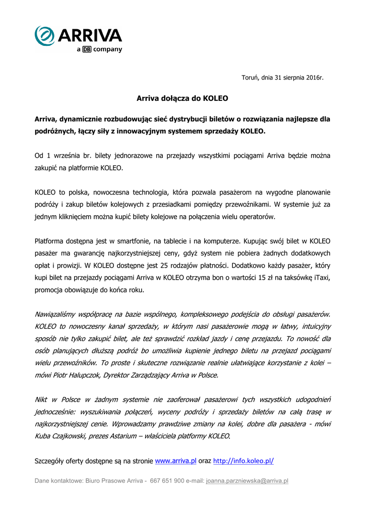 Toruń, dnia 31 sierpnia 2016r. Arriva dołącza do KOLEO Arriva, dynamicznie rozbudowując sieć dystrybucji biletów o rozwiązania najlepsze dla podróżnych, łączy siły z innowacyjnym systemem sprzedaży KOLEO. Od 1 września br. bilety jednorazowe na przejazdy wszystkimi pociągami Arriva będzie można zakupić na platformie KOLEO. KOLEO to polska, nowoczesna technologia, która pozwala pasażerom na wygodne planowanie podróży i zakup biletów kolejowych z przesiadkami pomiędzy przewoźnikami. W systemie już za jednym kliknięciem można kupić bilety kolejowe na połączenia wielu operatorów. Platforma dostępna jest w smartfonie, na tablecie i na komputerze. Kupując swój bilet w KOLEO pasażer ma gwarancję najkorzystniejszej ceny, gdyż system nie pobiera żadnych dodatkowych opłat i prowizji. W KOLEO dostępne jest 25 rodzajów płatności. Dodatkowo każdy pasażer, który kupi bilet na przejazdy pociągami Arriva w KOLEO otrzyma bon o wartości 15 zł na taksówkę iTaxi, promocja obowiązuje do końca roku. Nawiązaliśmy współpracę na bazie wspólnego, kompleksowego podejścia do obsługi pasażerów. KOLEO to nowoczesny kanał sprzedaży, w którym nasi pasażerowie mogą w łatwy, intuicyjny sposób nie tylko zakupić bilet, ale też sprawdzić rozkład jazdy i cenę przejazdu. To nowość dla osób planujących dłuższą podróż bo umożliwia kupienie jednego biletu na przejazd pociągami wielu przewoźników. To proste i skuteczne rozwiązanie realnie ułatwiające korzystanie z kolei – mówi Piotr Halupczok, Dyrektor Zarządzający Arriva w Polsce. Nikt w Polsce w żadnym systemie nie zaoferował pasażerowi tych wszystkich udogodnień jednocześnie: wyszukiwania połączeń, wyceny podróży i sprzedaży biletów na całą trasę w najkorzystniejszej cenie. Wprowadzamy prawdziwe zmiany na kolei, dobre dla pasażera - mówi Kuba Czajkowski, prezes Astarium – właściciela platformy KOLEO. Szczegóły oferty dostępne są na stronie www.arriva.pl oraz http://info.koleo.pl/ Dane kontaktowe: Biuro Prasowe Arriva - 667 651 900 e-mail: [email protected]