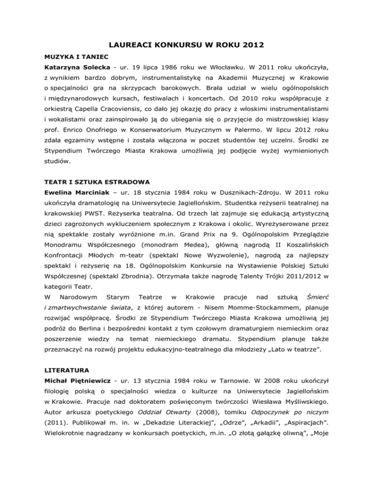 LAUREACI KONKURSU W ROKU 2012 MUZYKA I TANIEC Katarzyna Solecka - ur. 19 lipca 1986 roku we Włocławku. W 2011 roku ukończyła, z wynikiem bardzo dobrym, instrumentalistykę na Akademii Muzycznej w Krakowie o specjalności gra na skrzypcach barokowych. Brała udział w wielu ogólnopolskich i międzynarodowych kursach, festiwalach i koncertach. Od 2010 roku współpracuje z orkiestrą Capella Cracoviensis, co dało jej okazję do pracy z włoskimi instrumentalistami i wokalistami oraz zainspirowało ją do ubiegania się o przyjęcie do mistrzowskiej klasy prof. Enrico Onofriego w Konserwatorium Muzycznym w Palermo. W lipcu 2012 roku zdała egzaminy wstępne i została włączona w poczet studentów tej uczelni. Środki ze Stypendium Twórczego Miasta Krakowa umożliwią jej podjęcie wyżej wymienionych studiów. TEATR I SZTUKA ESTRADOWA Ewelina Marciniak – ur. 18 stycznia 1984 roku w Dusznikach-Zdroju. W 2011 roku ukończyła dramatologię na Uniwersytecie Jagiellońskim. Studentka reżyserii teatralnej na krakowskiej PWST. Reżyserka teatralna. Od trzech lat zajmuje się edukacją artystyczną dzieci zagrożonych wykluczeniem społecznym z Krakowa i okolic. Wyreżyserowane przez nią spektakle zostały wyróżnione m.in. Grand Prix na 9. Ogólnopolskim Przeglądzie Monodramu Współczesnego (monodram Medea), główną nagrodą II Koszalińskich Konfrontacji Młodych m-teatr (spektakl Nowe Wyzwolenie), nagrodą za najlepszy spektakl i reżyserię na 18. Ogólnopolskim Konkursie na Wystawienie Polskiej Sztuki Współczesnej (spektakl Zbrodnia). Otrzymała także nagrodę Talenty Trójki 2011/2012 w kategorii Teatr. W Narodowym Starym Teatrze w Krakowie pracuje nad sztuką Śmierć i zmartwychwstanie świata, z której autorem - Nisem Momme-Stockammem, planuje rozwijać współpracę. Środki ze Stypendium Twórczego Miasta Krakowa umożliwią jej podróż do Berlina i bezpośredni kontakt z tym czołowym dramaturgiem niemieckim oraz poszerzenie wiedzy na temat niemieckiego dramatu. Stypendium planuje także przeznaczyć na rozwój projektu edukacyjno-teatralnego dla młodzieży „Lato w teatrze”. LITERATURA Michał Piętniewicz - ur. 13 stycznia 1984 roku w Tarnowie. W 2008 roku ukończył filologię polską o specjalności wiedza o kulturze na Uniwersytecie Jagiellońskim w Krakowie. Pracuje nad doktoratem poświęconym twórczości Wiesława Myśliwskiego. Autor arkusza poetyckiego Oddział Otwarty (2008), tomiku Odpoczynek po niczym (2011). Publikował m. in. w „Dekadzie Literackiej”, „Odrze”, „Arkadii”, „Aspiracjach”. Wielokrotnie nagradzany w konkursach poetyckich, m.in. „O złotą gałązkę oliwną”, „Moje świata widzenie”, „Przeciw Poetom”, „Liberum Arbitrium”. Ostatnio wydał zbiór opowiadań Tarnowskie baśnie i mity. Obecnie przygotowuje nową książkę poetycką Szpital otwarty na oścież, na której wydanie chce przeznaczyć środki ze Stypendium Twórczego Miasta Krakowa. FILM Grzegorz Zariczny – ur. 9 kwietnia 1983 roku w Kokotowie pod Krakowem. W 2012 roku ukończył reżyserię filmową na Wydziale Radia i Telewizji Uniwersytetu Śląskiego. W 2010 roku w trakcie kursu dokumentalnego w Mistrzowskiej Szkole Reżyserii Filmowej Andrzeja Wajdy zrealizował nagradzany w Polsce i na świecie film dokumentalny Marysina Polana. W 2012 roku zrealizował film fabularny Nasza zima zła, za który otrzymał Nagrodę Specjalną Jury w konkursie „Młode Kino Polskie” na Festiwalu Polskich Filmów Fabularnych w Gdyni. W 2012 roku wyreżyserował film dokumentalny Gwizdek, uhonorowany m.in. nagrodą główną w konkursie polskim filmów krótkometrażowych na 12. Międzynarodowym Festiwalu Filmowym T-Mobile Nowe Horyzonty oraz nagrodą Jantar za najlepszy krótkometrażowy film dokumentalny na 31. Koszalińskim Festiwalu Debiutów Filmowych „Młodzi i Film". Środki ze Stypendium Twórczego Miasta Krakowa chce przeznaczyć na opłacenie rocznego programu fabularnego Studio Prób w Szkole Wajdy w Warszawie, którego jest obecnie uczestnikiem. SZTUKI PLASTYCZNE Wojciech Sobczyk – ur. 31 lipca 1985 roku w Jaworznie. W 2011 roku ukończył studia o specjalności grafika warsztatowa na Akademii Sztuk Pięknych w Krakowie. Jego praca dyplomowa, przygotowana w pracowni miedziorytu pod kierunkiem prof. Stanisława Wejmana, została odznaczona medalem rektora. Doktorant krakowskiej Akademii Sztuk Pięknych. Jego zamierzenia artystyczne i naukowe są ściśle ze sobą powiązane i koncentrują się wokół kwestii poszukiwania uniwersalnego języka sztuki oraz rozważań na temat istoty człowieczeństwa. Środki ze Stypendium Twórczego Miasta Krakowa chce przeznaczyć na realizację prac i ich wystawienie w krakowskich galeriach. ORGANIZACJA I I ARTYSTYCZNYCH, PRODUKCJA ZARZĄDZANIE PRZEDSIĘWZIĘĆ KULTURĄ, KULTURALNYCH KREOWANIE WAŻNYCH DLA KULTURY KRAKOWA WYDARZEŃ I WSPARCIE LOGISTYCZNE ARTYSTÓW Delfina Piekarska - ur. 16 lutego 1986 roku w Szczecinie. Absolwentka Uniwersytetu Jagiellońskiego w Krakowie na kierunkach filozofia oraz historia sztuki. Doktorantka w Instytucie Filozofii Uniwersytetu Jagiellońskiego. Pracuje w Muzeum Sztuki Współczesnej w Krakowie MOCAK, gdzie była współkuratorką dużych wystaw: „Historia w sztuce”, „Eva & Adele. Artysta = dzieło sztuki” oraz „Sport w sztuce”. Obecnie wraz z Moniką Kozioł tworzy autorski programu wystaw w galeriach Alfa i Beta w MOCAK-u. Swoją pracę doktorską z zakresu estetyki planuje oprzeć na przykładach z dziedziny sztuk wizualnych. Środki ze Stypendium planuje przeznaczyć na podjęcie studiów podyplomowych „Marketing kultury” prowadzonych przez Narodowe Centrum Kultury i Uniwersytet Warszawski.
