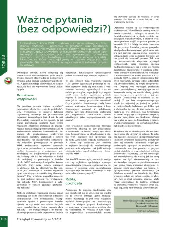 forum Ważne pytania (bez odpowiedzi?) Uchwalona 1 lipca 2011 r. ustawa o zmianie ustawy o utrzymaniu czystości i porządku w gminach oraz niektórych innych ustaw nie wydaje się być dobrym rozwiązaniem legislacyjnym, gdyż powoduje zniszczenie obecnych więzi społecznych i gospodarczych, nie gwarantując powstania nowych i silnych. Świadczą o tym liczne pytania przedsiębiorców, na które nie znajdujemy w ustawie wiążących odpowiedzi. Nie ma ich także w wyjaśnieniach autorów projektu ustawy. Dziesiątki szkoleń, które odbywają się w tym czasie, nie są miejscem, gdzie moglibyśmy znaleźć odpowiedzi na podstawowe pytania, gdyż króluje tam tematyka poboczna. A jeśli już padają odpowiedzi, to często zdają się być one wytworem fantazji szkolących. Branżowe wątpliwości Na poniższe pytania trudno „wydębić” odpowiedź, chyba że… „nie do protokołu”. Czy wymienioną w ustawie definicję regionalnej instalacji do przetwarzania odpadów komunalnych (art. 4 ust. 1e pkt 15c) należy rozumieć w ten sposób, że jej status przysługuje spalarni bądź trzem rodzajom obiektów: instalacji do mechaniczno-biologicznego przetwarzania (MBP) zmieszanych odpadów komunalnych, instalacji do przetwarzania selektywnie zebranych odpadów zielonych i innych bioodpadów lub składowisku (składowanie odpadów powstających w procesie MBP zmieszanych odpadów komunalnych oraz pozostałości z sortowania odpadów komunalnych o pojemności pozwalającej na przyjmowanie przez okres nie krótszy niż 15 lat odpadów w ilości nie mniejszej niż powstająca w instalacji do MBP zmieszanych odpadów komunalnych). Czy może należy rozumieć tę definicję tak, że alternatywą dla spalarni jest instalacja o statusie regionalnym, zawierająca wszystkie trzy elementy łącznie? Czy w takim wypadku konieczna jest jedność miejsca (tj. występowanie zakładu MBP, kompostowni i składowiska) w ramach jednego terytorialnie zakładu? Jeśli za instalację regionalną można uznać instalację do MBP zmieszanych odpadów komunalnych (bez konieczności występowania łącznie z pozostałymi instalacjami), to czy może ona należeć do jednego przedsiębiorcy, który posiada dwa zakłady – do biologicznego i do mechanicznego przetwarzania odpadów w dwóch 104 Przegląd Komunalny nr 9/2011 odrębnych lokalizacjach (pozostających jednak w ramach tego samego regionu)? W jaki sposób będą tworzone regiony i jak gminy ogłaszające przetargi na odbiór odpadów będą się rozliczały z operatorami instalacji regionalnych – na zasadzie przetargów, negocjacji czy uzgodnień? Jaka będzie egzekucja polityki regionu i decyzji poszczególnych gmin oraz jakie zasady przydziału strumieni? Czy z podatku śmieciowego będą finansowane sortownie dosortowujące i konfekcjonujące materiał z selektywnej zbiórki, czy tak definiowane sortowanie jest fragmentem całokształtu działań określanych jako zagospodarowanie odpadów? Jeśli właściciel nieruchomości prowadzi selektywną zbiórkę, to czy pozostałości z sortowania „u źródła” mogą być odwożone bezpośrednio na składowisko, a status tych odpadów nie sprowadzi się do kodu „zmieszane odpady komunalne”? A zatem czy konieczne jest istnienie w regionie instalacji do mechanicznego przetwarzania odpadów, zaś jeśli selekcja obejmuje także odpad biologiczny – instalacji do MBP? nie powinny czekać do wejścia w życie ustawy. Nie jest to zresztą jedyny i najważniejszy powód. Ogromnie ważne są też rozporządzenia wykonawcze. Nowelizacja ustawy o utrzymaniu czystości… nałożyła na resort środowiska obowiązek wydania sześciu rozporządzeń wykonawczych, z których większość powinna wejść w życie w pierwszym kwartale 2012 r. Mają one duże znaczenie dla przyszłego kształtu systemu gospodarki odpadami komunalnymi, gdyż sama ustawa jest jedynie ogólną wizją, wstępnym szkicem (cały czas pomijamy kwestię, czy tak godzi się stanowić prawo). Tak więc np. rozporządzenie dotyczące wymagań technicznych, jakie powinien spełniać podmiot ubiegający się o wpis do rejestru działalności regulowanej w zakresie odbierania odpadów komunalnych od właścicieli nieruchomości w wersji projektu z 12 listopada 2010 r., oprócz bezsprzecznie trafnych rozwiązań, zawiera jedno, zdawałoby się, zbyt absurdalne, by mogło być prawdziwe. Dotyczy ono wymagań posiadania przez przedsiębiorcę, aspirującego do wykonywania usług na terenie danej gminy, bazy transportowo-sprzętowej w jej granicach. Oznaczałoby to istnienie co najmniej 2,5 tys. baz transportowo-sprzętowych (co najmniej po jednej w gminie, w metropoliach dodatkowo po kilka itp.), a zbliżałoby to nas do idei rozwoju hutnictwa na wsi chińskiej. Tak brzemienne w skutki mogą być szczegółowe rozporządzenia wymyślone za biurkiem, dlatego tak ważne są uczciwe konsultacje z branżowymi organizacjami (od których nasz Związek nigdy się nie uchylał). Skupianie się na drobiazgach nie ma istotnego sensu dla „życia” tej ustawy. To właśnie regiony, instalacje i podporządkowane im ruchy strumieni nadawałyby pozytywny sens tej reformie (niszczenie więzi gospodarczych, opartych na swobodzie kontraktowania, nie jest przecież – przynajmniej oficjalnie w wypowiedziach ministra środowiska – tą istotą). Ale ani samorządy, ani przedsiębiorcy nie wiedzą, jak ten nowy Jak kwalifikowane będą instalacje zastęp- system ma być skonstruowany w sencze: czy najbliższe, spełniające wymaga- sie twardym (organizacyjno-finansowym): nia definicji (w tym poza regionem), czy ist- jak gminy będą związane decyzjami reniejące w regionie, choć niespełniające gionów (czyli marszałka), jak będzie rewymagań (np. sortownie, instalacje do wy- dystrybuowany podatek śmieciowy, jak dzielony strumień na instalacje itp. Ustarobu paliw alternatywnych)? wodawca zdaje się mówić „róbta, co chceta”. Ale to zbyt poważna spra