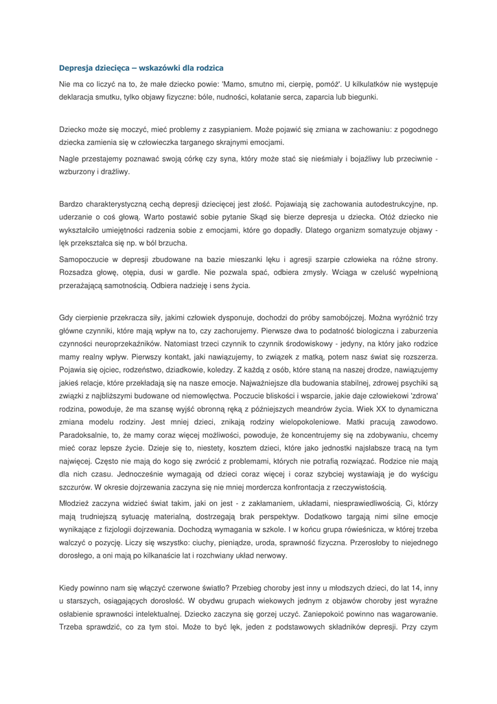 Depresja dziecięca – wskazówki dla rodzica Nie ma co liczyć na to, że małe dziecko powie: 'Mamo, smutno mi, cierpię, pomóż'. U kilkulatków nie występuje deklaracja smutku, tylko objawy fizyczne: bóle, nudności, kołatanie serca, zaparcia lub biegunki. Dziecko może się moczyć, mieć problemy z zasypianiem. Może pojawić się zmiana w zachowaniu: z pogodnego dziecka zamienia się w człowieczka targanego skrajnymi emocjami. Nagle przestajemy poznawać swoją córkę czy syna, który może stać się nieśmiały i bojaźliwy lub przeciwnie wzburzony i drażliwy. Bardzo charakterystyczną cechą depresji dziecięcej jest złość. Pojawiają się zachowania autodestrukcyjne, np. uderzanie o coś głową. Warto postawić sobie pytanie Skąd się bierze depresja u dziecka. Otóż dziecko nie wykształciło umiejętności radzenia sobie z emocjami, które go dopadły. Dlatego organizm somatyzuje objawy lęk przekształca się np. w ból brzucha. Samopoczucie w depresji zbudowane na bazie mieszanki lęku i agresji szarpie człowieka na różne strony. Rozsadza głowę, otępia, dusi w gardle. Nie pozwala spać, odbiera zmysły. Wciąga w czeluść wypełnioną przerażającą samotnością. Odbiera nadzieję i sens życia. Gdy cierpienie przekracza siły, jakimi człowiek dysponuje, dochodzi do próby samobójczej. Można wyróżnić trzy główne czynniki, które mają wpływ na to, czy zachorujemy. Pierwsze dwa to podatność biologiczna i zaburzenia czynności neuroprzekaźników. Natomiast trzeci czynnik to czynnik środowiskowy - jedyny, na który jako rodzice mamy realny wpływ. Pierwszy kontakt, jaki nawiązujemy, to związek z matką, potem nasz świat się rozszerza. Pojawia się ojciec, rodzeństwo, dziadkowie, koledzy. Z każdą z osób, które staną na naszej drodze, nawiązujemy jakieś relacje, które przekładają się na nasze emocje. Najważniejsze dla budowania stabilnej, zdrowej psychiki są związki z najbliższymi budowane od niemowlęctwa. Poczucie bliskości i wsparcie, jakie daje człowiekowi 'zdrowa' rodzina, powoduje, że ma szansę wyjść obronną ręką z późniejszych meandrów życia. Wiek XX to dynamiczna zmiana modelu rodziny. Jest mniej dzieci, znikają rodziny wielopokoleniowe. Matki pracują zawodowo. Paradoksalnie, to, że mamy coraz więcej możliwości, powoduje, że koncentrujemy się na zdobywaniu, chcemy mieć coraz lepsze życie. Dzieje się to, niestety, kosztem dzieci, które jako jednostki najsłabsze tracą na tym najwięcej. Często nie mają do kogo się zwrócić z problemami, których nie potrafią rozwiązać. Rodzice nie mają dla nich czasu. Jednocześnie wymagają od dzieci coraz więcej i coraz szybciej wystawiają je do wyścigu szczurów. W okresie dojrzewania zaczyna się nie mniej mordercza konfrontacja z rzeczywistością. Młodzież zaczyna widzieć świat takim, jaki on jest - z zakłamaniem, układami, niesprawiedliwością. Ci, którzy mają trudniejszą sytuację materialną, dostrzegają brak perspektyw. Dodatkowo targają nimi silne emocje wynikające z fizjologii dojrzewania. Dochodzą wymagania w szkole. I w końcu grupa rówieśnicza, w której trzeba walczyć o pozycję. Liczy się wszystko: ciuchy, pieniądze, uroda, sprawność fizyczna. Przerosłoby to niejednego dorosłego, a oni mają po kilkanaście lat i rozchwiany układ nerwowy. Kiedy powinno nam się włączyć czerwone światło? Przebieg choroby jest inny u młodszych dzieci, do lat 14, inny u starszych, osiągających dorosłość. W obydwu grupach wiekowych jednym z objawów choroby jest wyraźne osłabienie sprawności intelektualnej. Dziecko zaczyna się gorzej uczyć. Zaniepokoić powinno nas wagarowanie. Trzeba sprawdzić, co za tym stoi. Może to być lęk, jeden z podstawowych składników depresji. Przy czym młodsze dzieci boją się zadań, nowych miejsc. U starszych lęki mają charakter egzystencjalny. Pojawia się poczucie bezsensowności życia, strach przed przyszłością. Innym bardzo charakterystycznym objawem depresji u nastolatków jest agresja. Może to być autoagresja, ale w przypadku młodzieży także prowokowanie bójek, nadużywanie alkoholu, narkotyki, przekraczanie obowiązujących norm społecznych. Inne ważne symptomy to zaburzenia snu, brak apetytu lub objadanie się. Nastolatki przestają spotykać się ze znajomymi. Część z nich zapada się w nudzie. Mają duże trudności z porannym wstawaniem. Kiedy zauważymy takie objawy u dziecka musimy pamiętać, że w okresie intensywnego rozwoju pojawiają się okresy, w których dziecko wcale nie jest pogodne i wesołe, co nie oznacza, że ma depresję, szczególnie w okresie dojrzewania. Ale jeżeli niczym nieuzasadnione objawy utrzymują się kilka tygodni, to niezależnie od wieku dziecka należy szukać pomocy u specjalisty. Jeśli do tego momentu nie nawiązaliśmy z dzieckiem dobrej więzi emocjonalnej, nie oczekujmy, że nawiążemy ją teraz. Jeśli na depresję cierpi nastolatek, musimy pamiętać, że dla niego ważniejsza jest grupa rówieśnicza. Rodzice, stają się wówczas mało wiarygodni. Ponadto sami tworzymy system, w którym wykluła się choroba, więc trudno nam obiektywnie ocenić sytuację. U kogo szukać pomocy? W szkole - u nauczyciela czy psychologa szkolnego; w poradniach psychologiczno-pedagogicznych, punktach interwencji kryzysowej - u psychologów lub psychiatrów dziecięcych. Trzeba działać szybko i zdecydowanie. Depresja to zwykle długie miesiące samotnej męczarni dziecka. Nie wolno tego lekceważyć, szczególnie że przy tej chorobie istnieje ryzyko samobójstwa. Depresję można porównać do mocno napiętej cięciwy łuku - wystarczy drgnięcie ręki i strzała leci. Rodzice nie mają czasu, koleżanki obśmiały nowy ciuch, nie uda się coś w szkole i zaczyna się 'czarny tunel'. Mały, na pozór nieistotny epizod może wystarczyć, by dziecko podjęło próbę samobójczą. Terapia depresji Bardzo często stosuje si