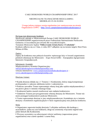 CAKE DESIGNERS WORLD CHAMPIONSHIP FIPGC 2017 NIEOFICJALNE TŁUMACZENIE REGULAMINU. MEDIOLAN 23-24.10.2016 Uwaga jedyna wiążąca wersją regulaminu jest zamieszczona na stronie Organizatora CDWC - http://www.campionatomondialecakedesigner.it. Do kogo jest skierowany konkurs: Możliwość udziału w Mistrzostwach Świata CAKE DESIGNERS WORLD CHAMPIONSHIP organizowanych przez Federazione Internazionale Pasticceria Gelateria e Cioccolateria jest otwarta dla wszystkich krajów. Tematem Mistrzostw będzie ''Odkrywanie świata Kawy i Czekolady'' . Konkurs odbywa się co 2 lata, w roku 2017 odbędzie się na terenie targów Host Fiera Milano di Rho. Zapisy: Zapisy do konkursu oraz pokrycie kosztów wpisowego leży w kwestii organizatora polskich eliminacji do Mistrzostw – Expo Sweet EZIG – Europejskie Zgrupowanie Interesów Gospodarczych. Informacje i kontakt: Międzynarodowy Komitet Organizacyjny : [email protected] witryna internetowa: www.campionatomondialecakedesigner.it – www.cakedesignersworldchampionship.com Drużyna i trener: ⦁ Każda drużyna składa się z 1 Trenera i 1 Konkurenta, którzy mają kompetencje profesjonalne w zakresie zdobienia tortów i cukiernictwa. ⦁ Podczas zawodów Trener reprezentuje własny kraj jako sędzia międzynarodowy i ma prawo głosu w imieniu własnego kraju. ⦁ Konkurent będzie musiał zrealizować sam zadania konkursowe. ⦁ Zadaniem Trenera jest przygotowanie własnej drużyny do Mistrzostw. Trener nie może pomagać konkurentowi podczas Mistrzostw. ⦁ Trener reprezentuje drużynę w jury międzynarodowym i kontaktuje się w imieniu drużyny z komitetem organizacyjnym w fazie organizacyjnej oraz podczas konkursu. Strój: ⦁ Organizator zapewnia każdej drużynie 2 oficjalne uniformy dla każdego z uczestników: jeden na czas konkursu, drugi na ceremonię wręczanie nagród oraz jeden fartuch dla Konkurenta. ⦁ Wszyscy uczestnicy są zobowiązani włożyć uniformy (zapewnione przez organizatora) oraz czarne spodnie i czarne buty. 1 ⦁ Organizator zakazuje używania innych uniformów niż te zapewnione przez organizatora oraz umieszczania innego logo niż logo organizatora na ubiorze. ⦁ Ponadto podczas całego trwania konkursu organizator zakazuje eksponowania logo lub innych materiałów reklamowych na ubraniach, na narzędziach oraz surowcach, które muszą być umieszczone w pojemnikach, a ich logo musi być zakryte. Wyjątek stanowią etykiety sponsorów mistrzostw zatwierdzone przez organizatora. Karą za eksponowanie niedozwolonego logo jest wykluczenie drużyny z udziału w mistrzostwach. Temat konkursu oraz broszury: ⦁ Tematem Mistrzostw Świata w Cake Design FIPGC, o którym zadecydował Międzynarodowy Komitet organizujący konkurs w 2017 będzie ''Odkrywanie świata Kawy i Czekolady'' i będzie on musiał być przedstawiony przez każdą z drużyn. ⦁ Każda drużyna będzie zobowiązana dostarczyć 20 broszur, które będą zawierać przepisy, krótką biografię członków drużyny, opis zaprezentowanego tematu, zdjęcie Konkurenta. Każda z drużyn sama zadecyduje jak wykonać broszurę (broszura musi być napisana w języku angielskim, włoskim i w języku ojczystym drużyny). ⦁ Broszury powinny być dostarczone podczas konkursu w formie papierowej oraz na płycie CD (1 płyta) w języku angielskim i włoskim Prezydentowi Międzynarodowego Jury. W przypadku ich braku lub braku części wymaganych materiałów drużyna zostanie ukarana 20 punktami karnymi. ⦁ Przepisy, zdjęcia, biografie i broszury opisujące drużynę staną się własnością organizatora, który będzie miał prawo je publikować w dowolnym miejscu. Prezentacja drużyny i przydzielenie miejsca. Wszystkie drużyny muszą się stawić w sekretariacie Mistrzostw, który będzie się znajdował na terenie Targów w dniu 22.10.2017 o godzinie 14 gdzie odbędzie się: ⦁ losowanie miejsca, ⦁ losowanie godzin degustacji, ⦁ losowanie dnia degustacji. O godzinie 16:30 w dniu 22.10.2017 odbędzie się prezentacja wszystkich drużyn. Pierwsze osiem drużyn, które będą konkurować 23.10.2017 będą mogły zorganizować wylosowane miejsce pracy między godziną 15:30 a 16:30. Drużyny, które będą konkurować 23.10.2017 będą mogły zorganizować swoje miejsce pracy w godzinach 15:30 – 16:30 w dniu 22.10.2017. Drużyny, które będą konkurować 24.10.2017 będą mogły zorganizować swoje stanowiska w dniu 23.10.2017 między godziną 15:30 a 16:30. Organizator poinformuje szefa drużyny w wiadomości e-mail o tym jak dostać się do pawilonu, w którym będzie odbywał się konkurs. Szefowie drużyn powinni wysłać drogą mailową informację o numerze rejestracyjnym oraz marce pojazdu jakim 2 przyjadą na teren targów, w celu otrzymania przepustki (samochód będzie mógł pozostać na terenie targów tylko na czas rozładunku). Na stronie www.host.fieramilano.it można będzie nabyć bilety uprawniające do wjazdu większą ilością samochodów. W dniu 22.10.2017 wszystkie drużyny muszą przywieźć do pawilonu, w którym odbędą się Mistrzostwa materiały i potrzebne podczas konkursu narzędzia. Każda drużyna składająca się z trenera i osoby startującej będzie musiała w ciągu 8 godzin zaprezentować co następuje (Początek zawodów godzina 7, koniec zawodów godzina 15). O godzinie 15:00 wszystkie drużyny będą musiały zaprezentować na przygotowanym ekspozytorze - stole ''Tort pokazowy'' oraz ''Tort pokazowy dekorowany na miejscu'' w celu ich oceny. Podczas zawodów w roku 2017 muszą być zaprezentowane następujące kategorie tortów: ⦁ Tort wystawowy (maksymalna szerokość 80 cm, brak ograniczeń co do wysokości) ⦁ Tort do degustacji. ⦁ Tort dekorowany podczas Mistrzostw (maksymalna szerokość 30 cm, brak ograniczeń co do wysokości). TORT WYSTAWOWY ⦁ Zawodnicy muszą przygotować jeden tort piętrowy przygotowany na styropianowych atrapach pokryty lukrem plastycznym, czekoladą plastyczną lub marcepanem 