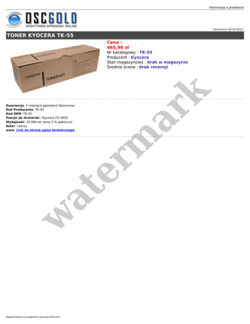 Informacje o produkcie Utworzono 02-03-2017 TONER KYOCERA TK-55 Cena : 465,96 zł er m ar k Nr katalogowy : TK-55 Producent : Kyocera Stan magazynowy : brak w magazynie Średnia ocena : brak recenzji w at Gwarancja: 3 miesiące gwarancji fabrycznej Kod Producenta: TK-55 Kod OEM: TK-55 Pasuje do drukarek:: Kyocera FS-1920 Wydajność: 15.000 str (przy 5 % pokryciu) Kolor: czarny www: Link na stronę opisu technicznego Wygenerowano w programie www.oscGold.com
