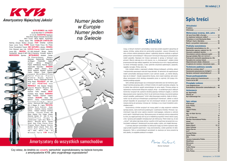Od redakcji | 3 ALFA ROMEO 166. AUDI A4 A6 RS4 RS6 TT. CITROËN C1 C3 C6. DAIHATSU Applause Atrai/ Atrai Wagon Charade Feroza Max Mira / Cuore Move Naked Pyzar/Gran Rocky Storia YRV. DAIMLER CHRYSLER Sebring (Coupe Stratus (Coupe). FIAT Croma Lancia Kappa Lancia Thema FORD Escort Fiesta Focus Ka Probe Puma Thunderbird Transit. GM SATURN L-Series. HONDA Civic Element Jazz Life. LEXUS (Toyota) Es300 Lexus 400 Lexus 200. MAZDA 121 626 Anteza/6 Bongo Demio Familia/323 Mazda 6 MPV MX-3 Premency Proceed Xedos 9 MERCEDES Sprinter. MITSUBISHI Airetrek Center TB Chariot/Space Wa g o n Debonair Delica/L300 Diamante ek-Wagon Forte/L200 Galant Lancer Minica Mirage/Colt Pajero RVR/Space Runner Space Gear/L400 Town-Box . NISSAN 200SX 300ZX Almera Alurel Avenir Bassara Bluebird Caravan Cedric Datsun Truck Elgrand Leopard Micra/March/Cube Patrol Pick-up Prairie Primera Quest Serena Skyline Sunny Pathfinder/Terrano Wing Road. PEUGEOT 107 406 407 607. PONTIAC Vibe RENAULT Clio Espace Kangoo Lagune Megane Megane CC Megane Senic Modus R5 Express Trafic Velsatis SEAT Cordoba Ibiza Toledo SUBARU Baja Forester Impreza Legacy Outback SUZUKI Aerio Alto Baleno Carry Cultus/Crescent E s c u d o / Vi t a r a I g n i s Jimmy / Sammurai MR Wagon Swift SX 4 Wagon R / Ignis TOYOTA A l t e z z a A u r i s Av e n s i s Ay g o Brevis Caldina Camry Carmia Celica Celsior Century Comfort Corolla Corona Crown dB Dyna Estima Fon Cargo Gracia Granvia Harrier Hi Ace Hi Lux Ipsum/Picnic Kluger V Landcruiser Light Ace Mark II Matrix Minivan Mr-S Naida Noah Opa Piatz Previa Prius Progres Raum Regius Sienna Starlet Soarrt Supra Town Ace To y o A c e T u n d r a V i s t a Vitz / Yaris Will-Vi / Will - Vs W i n d o m Ya r i s V W P o l o Numer jeden w Europie Numer jeden na Œwiecie Amortyzatory do wszystkich samochodów Czy wiesz, ¿e œrednio co czwarty samochód wyprodukowany na œwiecie korzysta z amortyzatorów KYB jako oryginalnego wyposa¿enia? Spis treści Aktualności Produkty . . . . . . . . . . . . . . . . . . . . . . . . . . . . . . 4 Informacje . . . . . . . . . . . . . . . . . . . . . . . . . . . . 10 Motoryzacja wczoraj, dziś, jutro Silniki Czasy, w których mechanik samochodowy musiał być przede wszystkim specjalistą od napraw silników, należą dzisiaj do zamierzchłej przeszłości. Jeszcze kilkanaście lat temu silnikom właśnie poświęcano główne i najbardziej obszerne rozdziały w ogólnych podręcznikach samochodowych i fabrycznych instrukcjach dotyczących poszczególnych modeli pojazdów. Najwięcej też miejsca zajmowały te sprawy w fachowych czaso pismach. Obecnie zdarzają się w nich jeszcze, np. w „Autonaprawie”, odrębne działy przeznaczone dla tego rodzaju zagadnień, lecz zamieszcza się w nich z reguły publikacje na temat silnikowego osprzętu, a więc systemów wtryskowo-zapłonowych, sprężarek, napędów rozrządu, filtrów, świec itp. Cała rozległa wiedza o naprawach układów tłokowo-korbowych, cylindrów, głowic i mechanizmów zaworowych mało dziś kogo obchodzi. W odniesieniu do współczesnych modeli samochodów obowiązuje bowiem w tym zakresie zasada: „to zrobiła fabryka, tego się nie dotyka”. Zasada najwyraźniej słuszna, skoro nawet najtańsze, byle prawi dłowo serwisowane silniki działają niezawodnie przez co najmniej 150 tysięcy kilo metrów przebiegu pojazdu. Tylko zakłady specjalizujące się w renowacjach weteranów szos lub mechanicy spor towych teamów poczynają sobie z silnikami śmielej niż zwykłe warsztaty usługowe. Są to jednak dwa odmienne wyjątki potwierdzające tę samą regułę. Pierwszy polega na naprawianiu mechanizmów faktycznie zużytych, drugi – na ewidentnym psuciu dobrych konstrukcji seryjnych dla uzyskania doraźnej poprawy niektórych osiągów, w zakresie dopuszczanym przez regulaminy. Brzmi to jak techniczna herezja, bo przecież podczas samych zawodów „podrasowane” silniki robią fascynujące wrażenie, chyba że któryś... rozleci się lub zatrze po kilkudziesięciu przejechanych kilometrach. Jednak w trakcie wolnych dojazdów do wyczynowych tras lub serwisowych boksów te same wspaniałe maszyny dymią jak parowozy, krztuszą się i strzelają w rury niczym kompletne samo chodowe wraki... Konstruktorzy silników seryjnych też muszą godzić ze sobą wzajemnie rozbieżne wymogi prawne, realia techniczno-produkcyjne i oczekiwania klientów. Pierwsze z wy mienionych mają dziś coraz częściej znaczenie rozstrzygające, zwłaszcza w zakresie emisji spalin i hałaśliwości pracy. Wymuszana przez nie ewolucja zmierza najwyraźniej ku temu, by napęd spalinowy stał się już w niedalekiej przyszłości niemal równie czysty, cichy i sprawny pod względem energetycznym jak elektryczny. Potem okaże się, że owo „niemal” robi jednak zbyt dużą różnicę i wszelkie silniki spalinowe (przynajmniej w sa mochodach osobowych i dostawczych) po prostu wyjdą z użytku, jak niegdyś dwusuwy. Z zamianą obecnych samochodów na elektryczne wiążą się wielkie wyzwania doty czące przede wszystkim pojemności i masy akumulatorów, a także systemów ich doła dowywania. Tylko w samochodowych warsztatach ta rewolucja już teraz przeszła by dość gładko, ze względów podanych na wstępie. Marian Kozłowski 30-lecie firmy NGK w Europie . . . . . . . . . . . . . Czy będziemy tankować wódkę? . . . . . . . . . . . VII konkurs o tytuł Mechanika Roku: Półfinał i finał w Ostródzie . . . . . . . . . . . . . . . Bosch o przyszłości motoryzacji . . . . . . . . . . . Praktyka warsztatowa Podnośniki samochodowe (cz. II) . . . . . . . . . . Blacharskie naprawy nadwozi (cz. X): Usuwanie uszkodzeń dachów . . . . . . . . . . . . . Warsztatowe systemy odsysania spalin . . . . . . Rozrząd silników PSA 1.8 i 2.0 16 V . . . . . . . . Podręcznik mechaniki pojazdowej (cz. IX): Narzędzia do wymiany łożysk . . . . . . . . . . . . . Odpowietrzanie układu chłodzenia . . . . . . . . . Urządzenia do montażu i demontaż