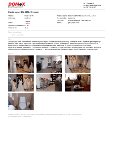 ul. Targowa 12 44-300, Wodzisław Śląski tel. 32 750-84-67 Oferta numer LW-5488, Wynajem Miasto: Bielsko-Biała Przeznaczenie: działalność,handlowa,usługowa,biurowa Dzielnica: Centrum Typ budynku: kamienica Cena: 3 000 zł 2 500 zł Położenie: okolice głównego ciągu pieszych Media: gaz, prąd, woda Powierzchnia obiektu: 62 m 2 Cena za m2: 40 zł Agent prowadzący: Imię i nazwisko: Opis: Do wynajęcia lokal o powierzchni 62mkw usytuowany na parterze piętrowej kamienicy w centrum miasta w pobliżu głównego ciągu pieszych.Lokal składa się z dużej części handlowej przedzielonej ścianką działową oraz toalety.Witryna oraz wejście od ulicy.Do wykorzystania zewnętrzna duża reklama świetlna+dodatkowe małe. Nadaje się na sklep, gabinet kosmetyczny,salon fryzjerski,działalność biurową,itp. Do wynajęcia od zaraz!!! Odstępne 3000zł+media, kaucja jednomiesięczna. Możliwość wynajęcia także pomieszczenia (jako magazyn) o powierzchni 40mkw za dodatkową miesięczną opłatą 500zł. Zapraszam na prezentację! Zdjęcia: Zamieszczone na naszej stronie oferty nieruchomości mają charakter informacyjny i nie stanowią oferty w rozumieniu prawa handlowego.