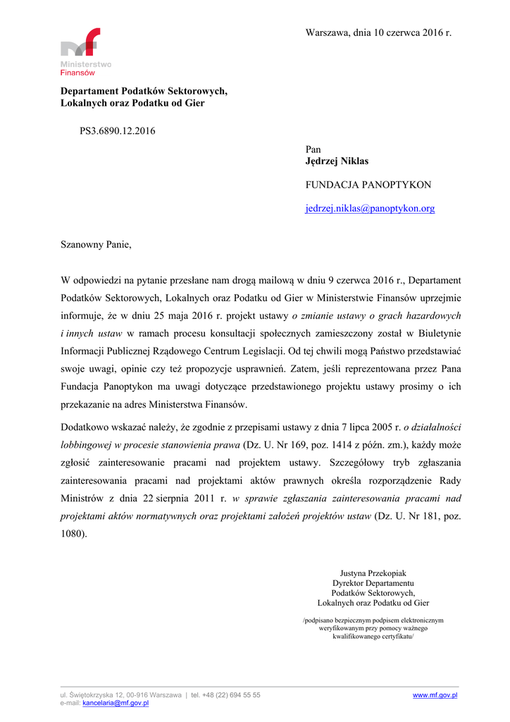 Warszawa, dnia 10 czerwca 2016 r. Departament Podatków Sektorowych, Lokalnych oraz Podatku od Gier PS3.6890.12.2016 Pan Jędrzej Niklas FUNDACJA PANOPTYKON [email protected] Szanowny Panie, W odpowiedzi na pytanie przesłane nam drogą mailową w dniu 9 czerwca 2016 r., Departament Podatków Sektorowych, Lokalnych oraz Podatku od Gier w Ministerstwie Finansów uprzejmie informuje, że w dniu 25 maja 2016 r. projekt ustawy o zmianie ustawy o grach hazardowych i innych ustaw w ramach procesu konsultacji społecznych zamieszczony został w Biuletynie Informacji Publicznej Rządowego Centrum Legislacji. Od tej chwili mogą Państwo przedstawiać swoje uwagi, opinie czy też propozycje usprawnień. Zatem, jeśli reprezentowana przez Pana Fundacja Panoptykon ma uwagi dotyczące przedstawionego projektu ustawy prosimy o ich przekazanie na adres Ministerstwa Finansów. Dodatkowo wskazać należy, że zgodnie z przepisami ustawy z dnia 7 lipca 2005 r. o działalności lobbingowej w procesie stanowienia prawa (Dz. U. Nr 169, poz. 1414 z późn. zm.), każdy może zgłosić zainteresowanie pracami nad projektem ustawy. Szczegółowy tryb zgłaszania zainteresowania pracami nad projektami aktów prawnych określa rozporządzenie Rady Ministrów z dnia 22 sierpnia 2011 r. w sprawie zgłaszania zainteresowania pracami nad projektami aktów normatywnych oraz projektami założeń projektów ustaw (Dz. U. Nr 181, poz. 1080). Justyna Przekopiak Dyrektor Departamentu Podatków Sektorowych, Lokalnych oraz Podatku od Gier /podpisano bezpiecznym podpisem elektronicznym weryfikowanym przy pomocy ważnego kwalifikowanego certyfikatu/ ul. Świętokrzyska 12, 00-916 Warszawa | tel. +48 (22) 694 55 55 e-mail: [email protected] www.mf.gov.pl