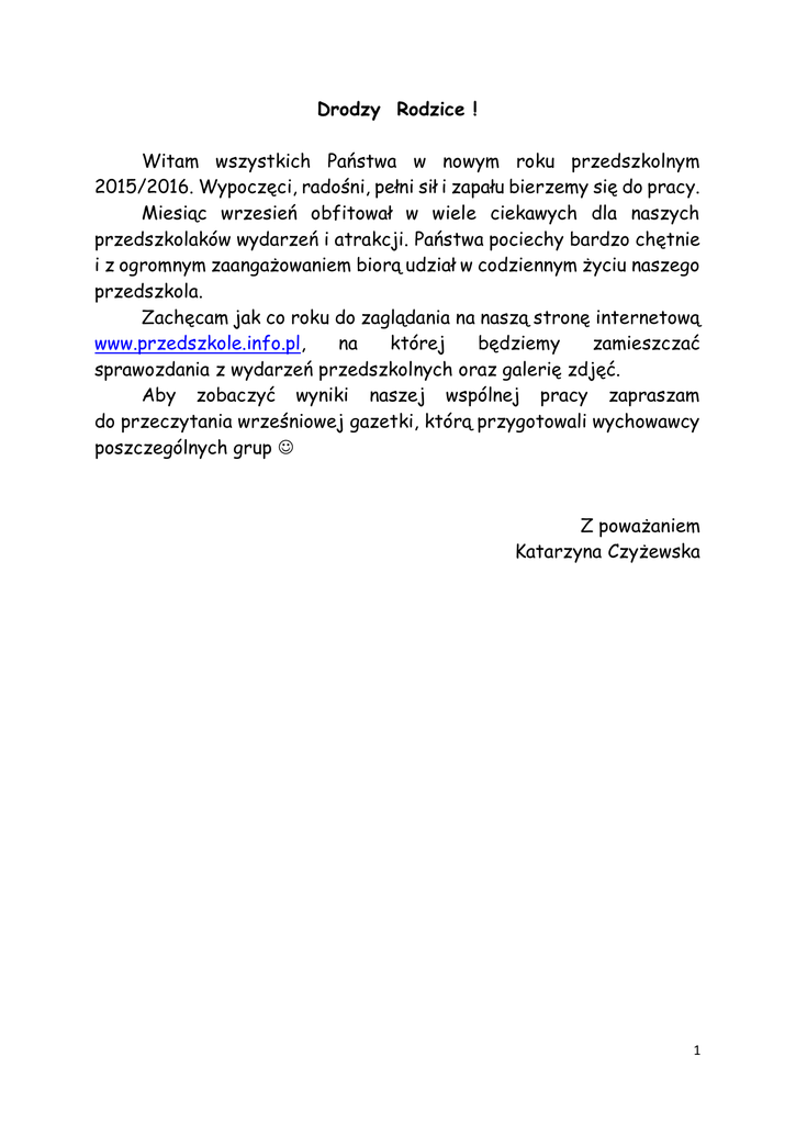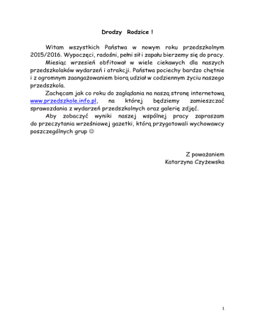 Drodzy Rodzice ! Witam wszystkich Państwa w nowym roku przedszkolnym 2015/2016. Wypoczęci, radośni, pełni sił i zapału bierzemy się do pracy. Miesiąc wrzesień obfitował w wiele ciekawych dla naszych przedszkolaków wydarzeń i atrakcji. Państwa pociechy bardzo chętnie i z ogromnym zaangażowaniem biorą udział w codziennym życiu naszego przedszkola. Zachęcam jak co roku do zaglądania na naszą stronę internetową www.przedszkole.info.pl, na której będziemy zamieszczać sprawozdania z wydarzeń przedszkolnych oraz galerię zdjęć. Aby zobaczyć wyniki naszej wspólnej pracy zapraszam do przeczytania wrześniowej gazetki, którą przygotowali wychowawcy poszczególnych grup Z poważaniem Katarzyna Czyżewska 1 PSZCZÓŁKI – O CZYM UCZYLIŚMY SIĘ WE WRZEŚNIU? Tydzień Tydzień Tydzień Tydzień pierwszy: Idę do przedszkola; drugi: Przedszkolaczek; trzeci: Lubimy się bawić; czwarty: Jestem bezpieczny na ulicy. W pierwszym tygodniu września Pszczółki wraz z innymi przedszkolakami powitały nowy rok przedszkolny. Dzieci poznały zasady panujące w przedszkolu. Brały udział w zabawach ruchowych – tanecznych oraz integracyjnych. Podczas zajęć dydaktycznych przedszkolaki uczyły się zgodnej zabawy wspólnymi zabawkami; poznały zasady bezpiecznej zabawy w przedszkolu oraz na placu zabaw; uczyły się słuchać nauczyciela i reagować na polecenia; utrwaliły imiona kolegów i koleżanek. Ponadto Pszczółki rozwijały umiejętność słuchania krótkich tekstów literackich; nazywały przedmioty na obrazku; ćwiczyły ruchome narządy mowy przez powtarzanie wyrażeń onomatopeicznych; wykonywały ćwiczenia oddechowe. Podczas zabaw matematycznych dzieci poznały określenia: długi, krótki; klasyfikowały przedmioty jako należące i nienależące do wyodrębnianego zbioru. Podczas pracy z kartami plstyczno – technicznymi Pszczółki kształciły umiejętność tworzenia prostych kompozycji metodą stemplowania. W kolejnym tygodniu września przedszkolaki kontynuowały odkrywanie przedszkola i zasad w nim panujących; nabywały umiejętności, które usprawniają przebieg dnia w przedszkolu. Podczas zajęć dydaktycznych dzieci wdrażały się do używania zwrotów grzecznościowych: dzień dobry, do widzenia, przepraszam, proszę, dziękuję; uczyły się odkładania zabawek na wyznaczone, stałe miejsce; przypomniały sobie rozmieszczenie poszczególnych sal i pomieszczeń w przedszkolu (zwiedzanie przedszkola). Ponadto rozwijały umiejętność słuchania krótkich utworów literackich; poznały znaczenie wyrazu przedszkolaki; wiązały opis słowny z przedmiotem; uczyły się wykonywania ćwiczeń ruchomych narządów artykulacyjnych 2 – języka; wdrażały się do zachowywania prawidłowego toru oddechowego. Podczas zabaw matematycznych przedszkolaki poznały i nazywały części ciała; poznały liczebniki od 1 do 3; liczyły w dostępnym zakresie; rozumiały określenia: długi, krótki. Podczas pracy z kartami plastyczno – technicznymi Pszczółki kształciły umiejętność tworzenia prostych kompozycji geometrycznych z gotowych elementów. W trzecim tygodniu września skupiliśmy się na różnego rodzaju zabawach. Dzieci opowiadały o swoich ulubionych zabawach i zabawkach; poznały zasady bezpiecznego korzystania z zabawek przedszkolnych oraz zgodnej zabawy wspólnymi zabawkami. Podczas zajęć dydaktycznych Pszczółki uważnie słuchały krótkich utworów literackich i próbowały odpowiedzieć na pytania dotyczące ich treści; posługiwały się nazwami różnych zabawek; ćwiczyły mięśnie narządów mowy; wykonywały ćwiczenia oddechowe; ćwiczyły podparcie oddechowe. Podczas zabaw matematycznych przedszkolaki rozwijały umiejętność określania wielkości: wysoki, niski; rozumiały określenia: na, pod, obok, za; posługiwały się określeniami: mały, duży; kształciły umiejętność klasyfikacji ze względu na wielkość; dostrzegały rytmiczny układ zabawek; układały zabawki w określonym rytmie; liczyły w dostępnym zakresie; rozwijały orientację w schemacie własnego ciała. Podczas pracy z kartami plastyczno – technicznymi Pszczółki doskonaliły sprawność manualną; rozwijały spostrzegawczość wzrokową; kształciły umiejętność wykonywania odbitek za pomocą prostych przedmiotów. W ostatnim tygodniu września przedszkolaki poznały podstawową zasadę bezpiecznego poruszania się na ulicy – pod opieką dorosłych. Podczas zajęć dydaktycznych rozmawialiśmy o prawidłowym zachowaniu się na chodniku; bezpiecznym przechodzeniu przez ulicę; poznaliśmy podstawowe znaki drogowe oraz sygnalizację świetlną. Ponadto dzieci zrozumiały określenia: przejście dla pieszych, pasy, sygnalizator świetlny, ścieżka rowerowa; dowiedziały się, co znaczą 3 światła na sygnalizatorze świetlnym. Rozmawialiśmy również o pracy policjanta. Omówiliśmy jego wygląd – mundur i akcesoria wykorzystywane do pracy. Podczas zabaw matematycznych Pszczółki rozpoznawały kształty podstawowych figur geometrycznych; oswajały się z nazwami: trójkątny, kwadratowy, okrągły; klasyfikowały ze względu na kształt; rozwijały orientację w schemacie własnego ciała. Podczas pracy z kartami plastyczno – technicznymi dzieci rozwijały umiejętność rozpoznawania kolorów; rozwijały spostrzegawczość wzrokową; doskonaliły sprawność manualną. We wrześniu podczas zabaw muzyczno – ruchowych Pszczółki rozwijały umiejętność poruszania się w kole wiązanym; uczyły się reagowania w zabawie na sygnały słowne i dźwiękowe; rozwijały poczucie rytmu; uczestniczyły w zabawach ze śpiewem; ilustrowały ruchem treść wiersza i piosenki; reagowały ruchem na zmiany tempa; poznały piosenki: „Do przedszkola idzie maluch”, „Dom dla lalek”, „Samochody”. Ponadto we wrześniu Pszczółki wraz z innymi przedszkolakami wzięły udział w uroczystym Rozpoczęciu Roku Przedszkolnego, przywitał