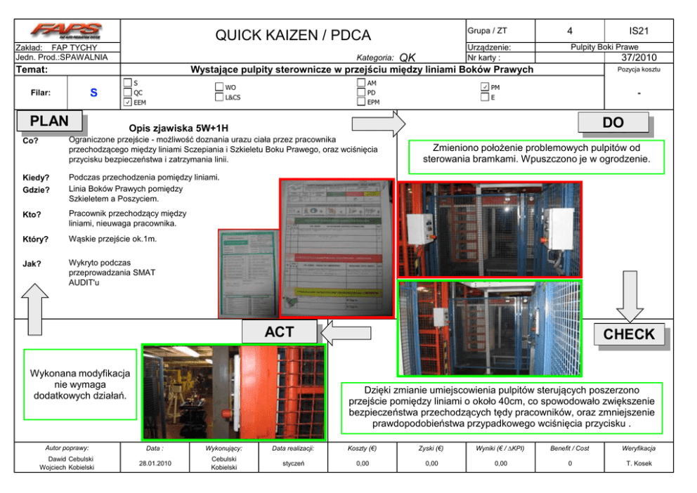 Grupa / ZT QUICK KAIZEN / PDCA Zakład: FAP TYCHY Jedn. Prod.:SPAWALNIA Kategoria: Urządzenie: Nr karty : QK 4 Pulpity Boki Prawe 37/2010 Wystające pulpity sterownicze w przejściu między liniami Boków Prawych Temat: S QC S Filar: PLAN AM PD EPM WO L&CS EEM IS21 Pozycja kosztu PM - E 10h DO Opis zjawiska 5W+1H Co? Ograniczone przejście - możliwość doznania urazu ciała przez pracownika przechodzącego między liniami Sczepiania i Szkieletu Boku Prawego, oraz wciśnięcia przycisku bezpieczeństwa i zatrzymania linii. Kiedy? Gdzie? Podczas przechodzenia pomiędzy liniami. Linia Boków Prawych pomiędzy Szkieletem a Poszyciem. Kto? Pracownik przechodzący między liniami, nieuwaga pracownika. Który? Wąskie przejście ok.1m. Zmieniono położenie problemowych pulpitów od sterowania bramkami. Wpuszczono je w ogrodzenie. szkic Jak? Wykryto podczas przeprowadzania SMAT AUDIT'u ACT Wykonana modyfikacja nie wymaga dodatkowych działań. Autor poprawy: Dawid Cebulski Wojciech Kobielski CHECK Dzięki zmianie umiejscowienia pulpitów sterujących poszerzono przejście pomiędzy liniami o około 40cm, co spowodowało zwiększenie bezpieczeństwa przechodzących tędy pracowników, oraz zmniejszenie prawdopodobieństwa przypadkowego wciśnięcia przycisku . Data : Wykonujący: Data realizacji: Koszty (€) Zyski (€) Wyniki (€ / ∆KPI) Benefit / Cost Weryfikacja 28.01.2010 Cebulski Kobielski styczeń 0,00 0,00 0,00 0 T. Kosek