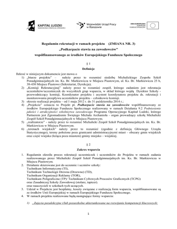 Regulamin rekrutacji w ramach projektu (ZMIANA NR. 3) „Podkarpacie stawia na zawodowców” współfinansowanego ze środków Europejskiego Funduszu Społecznego §1 Definicje Ilekroć w niniejszym dokumencie jest mowa o 1) „biurze projektu” – należy przez to rozumieć siedzibę Michalickiego Zespołu Szkół Ponadgimnazjalnych im. Ks. Br. Markiewicza w Miejscu Piastowym, ul. Ks. Br. Markiewicza 25 b, 38-430 Miejsce Piastowe (Sekretariat, Dyrekcja); 2) „Komisji Rekrutacyjnej” należy przez to rozumieć zespół, którego zadaniem jest rekrutacja uczestników/uczestniczek do wszystkich grup wsparcia, w skład którego wejdą Dyrektor Szkoły przewodniczący komisji, Koordynator projektu i asystent koordynatora projektu ds. rekrutacji i monitorowania przepływu uczestników projektu – członkowie komisji. 3) okresie realizacji projektu – od 1 maja 2012 r. do 31 października 2014 r.; 4) „Projekcie” oznacza to Projekt pt. Podkarpacie stawia na zawodowców współfinansowany ze środków Europejskiego Funduszu Społecznego realizowany w ramach Działania 9.2 Podniesienie jakości i atrakcyjności szkolnictwa zawodowego Programu Operacyjnego Kapitał Ludzki, którego Partnerem jest Zgromadzenie Świętego Michała Archanioła - organ prowadzący szkołę Michalicki Zespół Szkół Ponadgimnazjalnych w Miejscu Piastowym; 5) „realizatorze” - należy przez to rozumieć Michalicki Zespół Szkół Ponadgimnazjalnych im. Ks. Br. Markiewicza w Miejscu Piastowym. 6) „terenach wiejskich” należy przez to rozumieć (zgodnie z definicją Głównego Urzędu Statystycznego), tereny położone poza granicami administracyjnymi miast – obszary gmin wiejskich oraz część wiejska (leżąca poza miastem) gminy miejsko – wiejskiej. §2 Zakres wsparcia 1. Regulamin określa proces rekrutacji uczestniczek i uczestników do Projektu w ramach zadania realizowanego przez Michalicki Zespół Szkół Ponadgimnazjalnych im. Ks. Br. Markiewicza w Miejscu Piastowym. 2. Działanie skierowane jest do uczennic i uczniów szkoły: Technikum Informatyczne (TI), Technikum Technologii Drewna (Drzewne) (TD), Technikum Organizacji Reklamy (TOR), Technikum Poligraficzne (TP)/ Technikum Cyfrowych Procesów Graficznych (TCPG) oraz Zasadniczej Szkoły Zawodowej (stolarz, tapicer). oraz nauczycieli w szkołach tych uczących. 3. Udział w Projekcie jest bezpłatny, koszty związane z realizacją form wsparcia, współfinansowane są ze środków Unii Europejskiej w ramach Europejskiego Funduszu Społecznego. 4. W ramach projektu realizowane będą następujące formy wsparcia: 1) „Zajęcia pozalekcyjne i/lub pozaszkolne ukierunkowane na rozwijanie kompetencji kluczowych: 1 a) Zajęcia dodatkowe z j. obcego branżowego/ zawodowego poziom rozszerzony – branża informatyczna dla uczniów/uczennic Technikum Informatycznego w ilości (30 godz.) dydaktycznych dla 2 grup – (liczba osób uczestniczących: do 20 osób/grupę*) b) Zajęcia dodatkowe z j. obcego branżowego/ zawodowego poziom rozszerzony - branża poligraficzna dla uczennic/uczniów Technikum Poligraficznego/ Technikum Cyfrowych Procesów Graficznych w ilości (30 godz.) dydaktycznych dla 2 grup – (liczba osób uczestniczących: 15/grupę*). c) Zajęcia dodatkowe z j. obcego branżowego/ zawodowego poziom rozszerzony - branża reklama dla uczennic/uczniów Technikum Organizacji Reklamy, w ilości (30 godz.) dydaktycznych dla 1 grupy – ( liczba osób uczestniczących: 15*) 2) „Zajęcia pozalekcyjne i/lub pozaszkolne ukierunkowane na rozwijanie kompetencji zawodowych zgodnie z kierunkiem kształcenia zawodowego; w tym kursy specjalistyczne”; a) Kurs operatora obrabiarek sterowanych numerycznie CNC dla uczniów ZSZ (stolarz, tapicer) w ilości (120 godz. dydaktycznych) dla 2 grup – (liczba osób uczestniczących: 6/grupę*) b) Kurs operatora obrabiarek sterowanych numerycznie CNC dla uczniów Technikum Drzewnego w ilości (120 godz. dydaktycznych) dla 1 grupy – liczba osób uczestniczących: 9 osób*) c) Kurs "Tworzenie grafiki inżynierskiej - AUTOCAD" dla uczniów Technikum Drzewnego w ilości (40 godz. dydaktycznych) dla 2 grup – (liczba osób uczestniczących: 13 osób/grupę*) d) Kurs "Obsługa programu komputerowego NOWY ROZKRÓJ i PRO-100 - projektowanie mebli" dla uczniów Technikum Drzewnego w ilości (30 godz. dydaktycznych) dla 2 grup – (liczba osób uczestniczących: 12 osób/grupę*) e) Kurs "Obsługa programu komputerowego NOWY ROZKRÓJ i PRO-100 - projektowanie mebli" dla uczniów ZSZ (stolarz, tapicer) w ilości (30 godz. dydaktycznych) dla 1 grupy – ( liczba osób uczestniczących: 8 osób/grupę*) f) Kurs " Kierowca - operator wózków jezdniowych napędzanych w tym zasilanych gazem" – dla uczniów Technikum Drzewnego w ilości (min. 35 godz. dydaktycznych) dla 1 grupy – liczba osób uczestniczących: 12 osób/grupę*) g) Kurs " Kierowca - operator wózków jezdniowych napędzanych w tym zasilanych gazem" – dla uczniów ZSZ (stolarz, tapicer) w ilości (min. 35 godz. dydaktycznych) dla 2 grup – liczba osób uczestniczących: 8 osób/grupę* h) Kurs SEP do 1 kv dla uczniów Technikum Informatycznego w ilości 40 godz. dydaktycznych dla 2 grup – liczba uczestniczących: 14 osób/ grupę* i) Kurs Grafika Komputerowa dla uczniów/uczennic Technikum Organizacji Reklamy w ilości 60 godz. dydaktycznych dla 1 grupy – liczba uczestniczących: 12 osób* j) Warsztaty "Edukacja multimedialna, medialna" dla uczniów/uczennic Technikum Organizacji Reklamy w ilości 20 godz. dydaktycznych dla 1 grupy – (liczba uczestniczących: 14 -16 osób*). k) Warsztaty plenerowe fotograficzne dla uczennic/uczniów Technikum Organizacji Reklamy w ilości 30 godz. dydaktycznych dla 2 grup – (liczba uczestniczących: 12 osób/grupę*). 2 3) „Staże i praktyki”; a) Organizacja praktyk zawodowych (20 godz.) dla uczniów/uczennic Technikum Informatycznego dla 1 grupy – (liczba uczestniczących 29 osób*), b) Organiz