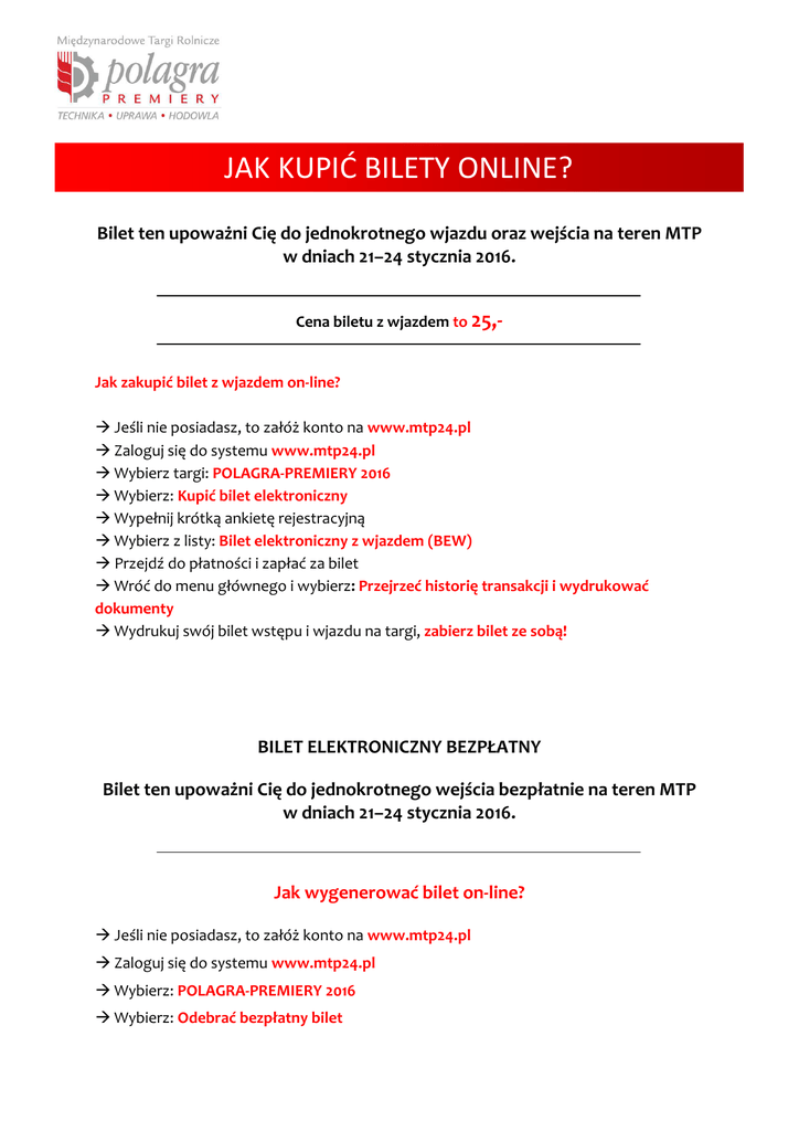 BILET Z WJAZDEM JAK KUPIĆ BILETY ONLINE? 2014 Bilet ten upoważni Cię do jednokrotnego wjazdu oraz wejścia na teren MTP w dniach 21–24 stycznia 2016. Cena biletu z wjazdem to 25,- Jak zakupić bilet z wjazdem on-line? Jeśli nie posiadasz, to załóż konto na www.mtp24.pl Zaloguj się do systemu www.mtp24.pl Wybierz targi: POLAGRA-PREMIERY 2016 Wybierz: Kupić bilet elektroniczny Wypełnij krótką ankietę rejestracyjną Wybierz z listy: Bilet elektroniczny z wjazdem (BEW) Przejdź do płatności i zapłać za bilet Wróć do menu głównego i wybierz: Przejrzeć historię transakcji i wydrukować dokumenty Wydrukuj swój bilet wstępu i wjazdu na targi, zabierz bilet ze sobą! BILET ELEKTRONICZNY BEZPŁATNY Bilet ten upoważni Cię do jednokrotnego wejścia bezpłatnie na teren MTP w dniach 21–24 stycznia 2016. Jak wygenerować bilet on-line? Jeśli nie posiadasz, to załóż konto na www.mtp24.pl Zaloguj się do systemu www.mtp24.pl Wybierz: POLAGRA-PREMIERY 2016 Wybierz: Odebrać bezpłatny bilet Wypełnij krótką ankietę rejestracyjną Twoje zgłoszenie trafiło do pracownika MTP, który musi je akredytować O potwierdzeniu zgłoszenia zostaniesz poinformowany e-mailem. Po otrzymaniu maila ponownie zaloguj się do www.mtp24.pl Wybierz: Przejrzeć historię transakcji i wydrukować dokumenty jeśli bilet ma status: Akredytacja zakończona powodzeniem KLIKNIJ ikonę pliku PDF lub PNG – drukuj PDF/PNG Wydrukuj swój darmowy bilet wstępu i zabierz go ze sobą na targi! Poinformuj współpracowników i znajomych 21–24 stycznia 2016, POZNAŃ KONTAKT: e-mail. [email protected] Tel. 61 869 20 88 Faks. 61 869 29 99