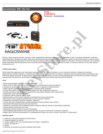 Informacje o produkcie Sennheiser EW 152 G3 Cena : 2.599,00 zł or e. pl Producent : Sennheiser St Wszyscy, którzy maja do czynienia z estradą , sceną ,nagłaśnianiem doskonale wiedzą ,że firma Sennheiser to lider w produkcji mikrofonów i systemów bezprzewodowych. Wszędzie tam gdzie stawia się na bezkompromisową jakość oraz stabilność działania wybiera się Sennheisera.Jeżeli Ty szukasz właśnie takich systemów bezprzewodowych to seria EW 100 jest znakomitą ofertą dla najbardziej wymagających warunków .Techniczne możliwości oraz znakomita jakość wyprzedziły konkurencję bardzo mocno do przodu.Sennheiser jest firmą , która produkuje w europie ,a niemiecka solidność nie ma sobie równychprzekonaj się sam. Charakterystyka ogólna ey Wyraź siebie bez angażowania rąk: wykorzystaj całą scenę i skup się na swoim występie, a nie na trzymaniu mikrofonu. Dołączony do zestawu pojemnościowy mikrofon nagłowny o charakterystyce kardioidalnej jest bardzo łatwy w założeniu, posiada znakomite zabezpieczenie przed efektem pop i przekazuje potężne brzmienie. W skład zestawu wchodzi również przetestowany na wielu scenach odbiornik typu true diversity oraz nadajnik bodypack, który posiada styki ładowania umożliwiające bezpośrednie doładowywanie opcjonalnego akumulatorka BA2015. Cechy ● ● ● ● ● ● ● ● ● ● ● ● ● ● ● ● ● Wytrzymała metalowa obudowa ( nadajnik i odbiornik). Pasmo 42 MHz: 1680 częstotliwości UHF do wyboru w celu zapewnienia pracy bez zakłóceń. Rozszerzony system banku częstotliwości z maksymalnie 12 zgodnymi częstotliwościami. Odbiór sygnału typu true diversity zapewniający najwyższą jakość dźwięków. Funkcja Pilot squelch w celu wyeliminowania zakłóceń RF, gdy nadajnik jest wyłączony. Funkcja automatycznego skanowania częstotliwości wyszukująca dostępne wolne częstotliwości. Rozszerzony zakres częstotliwości audio. Zwiększony zakres dynamiki sygnału audio. Bezprzewodowa synchronizacja nadajnika za pośrednictwem portu podczerwieni. Menu kontroli pracy przyjazne użytkownikowi z wieloma opcjami ustawień. Podświetlany wyświetlacz graficzny (nadajnik i odbiornik). Funkcja Auto-Lock zabezpieczająca przed przypadkową zmianą ustawień pracy systemu. Kompander HDX zapewniający krystaliczne brzmienie. Wskazanie 4 poziomów stanu naładowania baterii nadajnika widoczne również na wyświetlaczu odbiornika. Programowalna funkcja przycisku Mute. Wbudowany korektor graficzny oraz tryb Soundcheck. Styki bezpośredniego ładowania akumulatorka BA 2015 accupack umieszczone na obudowie nadajnika. Bogaty wybór akcesoriów pozwalających na zaadaptowanie systemu do użycia w różnych warunkach i konfiguracjach. K ● Zawartość pakietu ● ● ● ● ● ● 1 odbiornik w obudowie standardu rack EM 100 G3 1 nadajnik bodypack SK 100 G3 1 zestaw nagłowny ME 3-ew (charakterystyka kierunkowa - kardioidalna) 1 zasilacz sieciowy NT 2 2 anteny 2 elementy do tworzenia pionowych zestawów odbiorników Wygenerowano w programie www.oscGold.com ● ● 2 baterie AA Instrukcja obsługi Dane techniczne: 516..... 865 MHz Częstotliwości transmisji/odbioru 1680 Programy 12 Szerokość pasma przełączania 42 MHz Maksymalna dewiacja FM +/- 48 kHz Kompander HDX Zakres częstotliwości (mikrofon) 80.....18000 Hz Odstęp sygnał-szum > 110 dB(A) THD, całkowite zniekształcenia harmoniczne < 0,9 % Zgodność z normami ETS 300422 , ETS 300445 , CE , FCC Złącze anteny or e. pl Zakres częstotliwości RF 2 BNC, 50 Ohm Złącze audio 6,3 mm Poziom wyjściowy audio (symetrycznie) XLR: +18 dBu max Poziom wyjściowy audio (niesymetrycznie) Wymiary (odbiornik) Jack: +12 dBu max 212 x 202 x 43 mm Masa (odbiornik) 900 g Moc wyjściowa RF 30 mW Czas pracy (nadajnik) około 8 godzin Poziom napięcia wejściowego Poziom napięcia wejściowego Wymiary (nadajnik) 1,8 V line 2,4 V line 82 x 64 x 24 mm Masa (nadajnik) ~ 160 g Przetwornik, typ mikrofonu elektretowy 1,6 mV/Pa Poziom ciśnienia akustycznego (SPL) 150 dB(SPL) max. K ey Charakterystyka kierunkowości St Czułość AF superkardioidalna