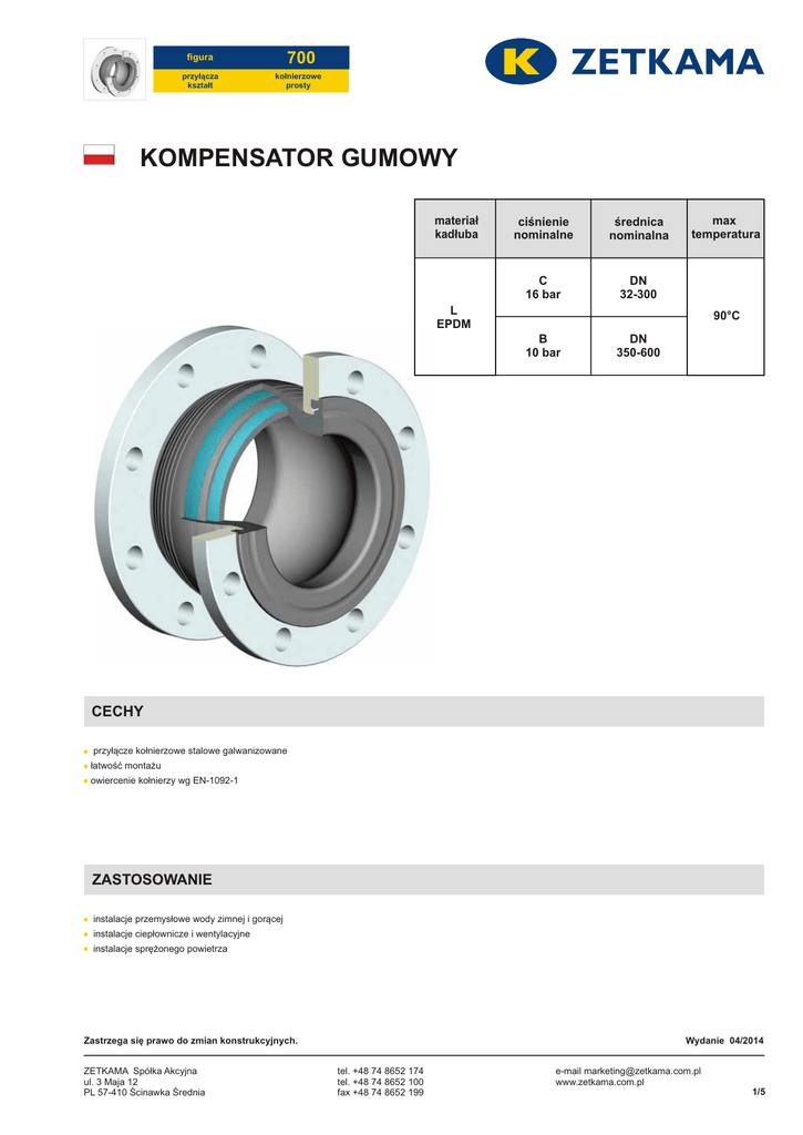 700 figura przyłącza kształt kołnierzowe prosty KOMPENSATOR GUMOWY materiał kadłuba ciśnienie nominalne średnica nominalna C 16 bar DN 32-300 max temperatura L EPDM 90°C B 10 bar DN 350-600 CECHY przyłącze kołnierzowe stalowe galwanizowane łatwość montażu owiercenie kołnierzy wg EN-1092-1 ZASTOSOWANIE instalacje przemysłowe wody zimnej i gorącej instalacje ciepłownicze i wentylacyjne instalacje sprężonego powietrza Zastrzega się prawo do zmian konstrukcyjnych. ZETKAMA Spółka Akcyjna ul. 3 Maja 12 PL 57-410 Ścinawka Średnia Wydanie 04/2014 tel. +48 74 8652 174 tel. +48 74 8652 100 fax +48 74 8652 199 e-mail [email protected] www.zetkama.com.pl 1/5 700 figura przyłącza kształt kołnierzowe prosty MATERIAŁY 2 1 3 4 materiał kadłuba L wykonanie 00 1 kadłub 2 przyłącze kołnierzowe 3 pierścień zabezpieczający 4 kord syntetyczny EPDM stal węglowa galwanizowana stal węglowa nylon max temperatura 90oC Zastrzega się prawo do zmian konstrukcyjnych. ZETKAMA Spółka Akcyjna ul. 3 Maja 12 PL 57-410 Ścinawka Średnia Wydanie 04/2014 tel. +48 74 8652 174 tel. +48 74 8652 100 fax +48 74 8652 199 e-mail [email protected] www.zetkama.com.pl 2/5 700 figura przyłącza kształt kołnierzowe prosty K D nxd WYMIARY L DN D mm L K nxd kompresja osiowa mm wydłużenie osiowe mm przemieszczenie przemieszczenie kątowe boczne ± mm ± stopień kg 32 140 93 100 4x18 8 4 8 15 2,80 40 150 93 110 4x18 8 4 8 15 3,80 50 165 99 125 4x18 8 4 8 15 4,20 65 185 108 145 4x18 12 6 10 15 4,80 80 200 116 160 8x18 12 6 10 15 6,20 100 220 129 180 8x18 12 10 12 15 7,20 125 250 142 210 8x18 16 10 12 15 9,30 150 285 156 240 8x22 16 10 12 15 11,70 200 340 177 295 12x22 20 14 18 15 16,80 250 405 206 355 12x26 20 14 18 15 20,60 300 460 217 410 12x26 20 14 18 15 25,80 350 505 266 460 16x22 25 16 18 15 39,20 400 565 266 515 16x26 25 16 18 15 49,80 450 615 200 565 20x26 20 12 18 15 52,00 500 670 200 620 20x26 20 12 18 15 62,80 600 780 250 720 20x30 20 12 18 15 82,50 Zastrzega się prawo do zmian konstrukcyjnych. ZETKAMA Spółka Akcyjna ul. 3 Maja 12 PL 57-410 Ścinawka Średnia Wydanie 04/2014 tel. +48 74 8652 174 tel. +48 74 8652 100 fax +48 74 8652 199 e-mail [email protected] www.zetkama.com.pl 3/5 700 figura przyłącza kształt kołnierzowe prosty ZALEŻNOŚĆ TEMPERATURY OD CIŚNIENIA 18,0 16,0 16,0 14,0 12,4 12,0 Obszar dopuszczalnych parametrów pracy PN 16 DN32 - DN300 10,0 Ciśnienie (bar) 10,0 7,5 8,0 6,5 6,0 5,2 4,0 2,0 0,0 Temperatura otoczenia 50 60 70 80 90 Temperatura (oC) 12,0 10,0 10,0 Obszar dopuszczalnych parametrów pracy PN 10 DN350 - DN600 7,5 8,0 Ciśnienie (bar) 6,2 6,0 5,0 4,0 4,0 3,2 2,0 0,0 Temperatura otoczenia 50 60 70 80 90 Temperatura (oC) WYKONANIA figura 700 materiał kadłuba EPDM średnica nominalna DN ciśnienie nominalne PN 32-300 C mm 16 bar 350-600 B mm 10 bar wykonanie 00 00 Tmax 90 °C przyłącze - stal węglowa galwanizowana, kadłub - EPDM Zastrzega się prawo do zmian konstrukcyjnych. ZETKAMA Spółka Akcyjna ul. 3 Maja 12 PL 57-410 Ścinawka Średnia Tmax 90 °C przyłącze - stal węglowa galwanizowana, kadłub - EPDM Wydanie 04/2014 tel. +48 74 8652 174 tel. +48 74 8652 100 fax +48 74 8652 199 e-mail [email protected] www.zetkama.com.pl 4/5 700 figura przyłącza kształt kołnierzowe prosty ZAMAWIANIE Uprasza się o zamawianie produktu wg indeksu figura materiał kadłuba średnica nominalna DN ciśnienie nominalne PN wykonanie 700 L 040 C 00 700 PRZYKŁAD ZAMÓWIENIA 040 C 00 700 kompensator gumowy, przyłącze kołnierzowe, kształt prosty L EPDM 040 średnica nominalna DN40 C ciśnienie nominalne PN16 00 przyłącze - stal węglowa galwanizowana, kadłub EPDM Zastrzega się prawo do zmian konstrukcyjnych. ZETKAMA Spółka Akcyjna ul. 3 Maja 12 PL 57-410 Ścinawka Średnia L Wydanie 04/2014 tel. +48 74 8652 174 tel. +48 74 8652 100 fax +48 74 8652 199 e-mail [email protected] www.zetkama.com.pl 5/5