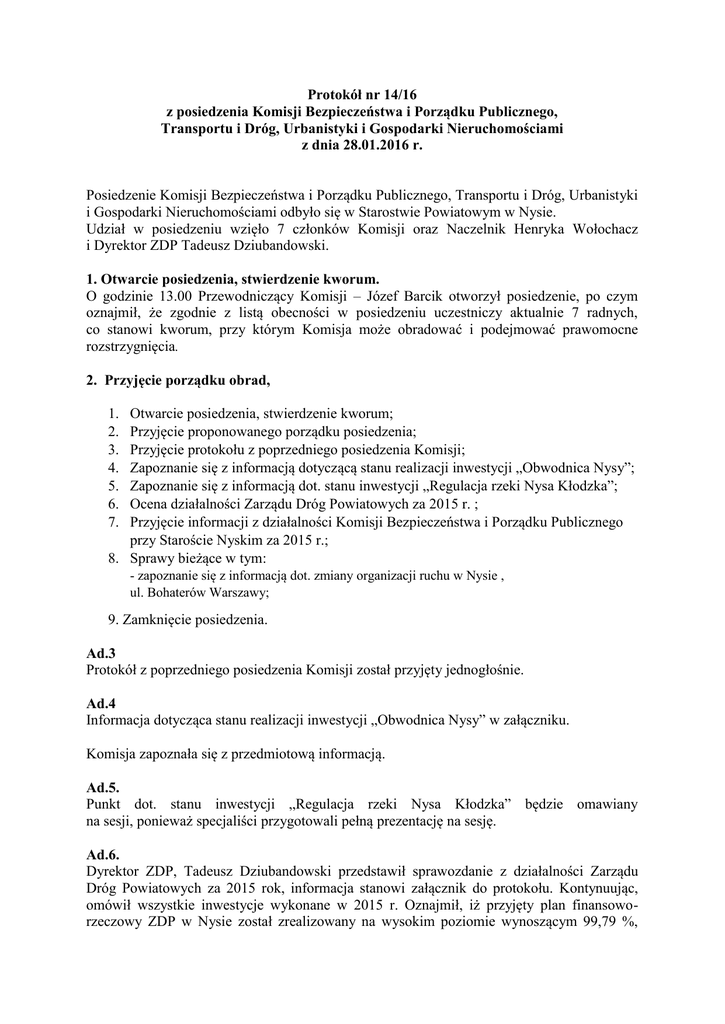 Protokół nr 14/16 z posiedzenia Komisji Bezpieczeństwa i Porządku Publicznego, Transportu i Dróg, Urbanistyki i Gospodarki Nieruchomościami z dnia 28.01.2016 r. Posiedzenie Komisji Bezpieczeństwa i Porządku Publicznego, Transportu i Dróg, Urbanistyki i Gospodarki Nieruchomościami odbyło się w Starostwie Powiatowym w Nysie. Udział w posiedzeniu wzięło 7 członków Komisji oraz Naczelnik Henryka Wołochacz i Dyrektor ZDP Tadeusz Dziubandowski. 1. Otwarcie posiedzenia, stwierdzenie kworum. O godzinie 13.00 Przewodniczący Komisji – Józef Barcik otworzył posiedzenie, po czym oznajmił, że zgodnie z listą obecności w posiedzeniu uczestniczy aktualnie 7 radnych, co stanowi kworum, przy którym Komisja może obradować i podejmować prawomocne rozstrzygnięcia. 2. Przyjęcie porządku obrad, 1. 2. 3. 4. 5. 6. 7. Otwarcie posiedzenia, stwierdzenie kworum; Przyjęcie proponowanego porządku posiedzenia; Przyjęcie protokołu z poprzedniego posiedzenia Komisji; Zapoznanie się z informacją dotyczącą stanu realizacji inwestycji „Obwodnica Nysy”; Zapoznanie się z informacją dot. stanu inwestycji „Regulacja rzeki Nysa Kłodzka”; Ocena działalności Zarządu Dróg Powiatowych za 2015 r. ; Przyjęcie informacji z działalności Komisji Bezpieczeństwa i Porządku Publicznego przy Staroście Nyskim za 2015 r.; 8. Sprawy bieżące w tym: - zapoznanie się z informacją dot. zmiany organizacji ruchu w Nysie , ul. Bohaterów Warszawy; 9. Zamknięcie posiedzenia. Ad.3 Protokół z poprzedniego posiedzenia Komisji został przyjęty jednogłośnie. Ad.4 Informacja dotycząca stanu realizacji inwestycji „Obwodnica Nysy” w załączniku. Komisja zapoznała się z przedmiotową informacją. Ad.5. Punkt dot. stanu inwestycji „Regulacja rzeki Nysa Kłodzka” będzie omawiany na sesji, ponieważ specjaliści przygotowali pełną prezentację na sesję. Ad.6. Dyrektor ZDP, Tadeusz Dziubandowski przedstawił sprawozdanie z działalności Zarządu Dróg Powiatowych za 2015 rok, informacja stanowi załącznik do protokołu. Kontynuując, omówił wszystkie inwestycje wykonane w 2015 r. Oznajmił, iż przyjęty plan finansoworzeczowy ZDP w Nysie został zrealizowany na wysokim poziomie wynoszącym 99,79 %, oraz, że zrealizowano wszystkie planowane zadania, które znacząco poprawiły bezpieczeństwo, warunki komunikacyjne i transportowe. Przedstawił również zamierzenia na 2016 r. Głównym zadaniem inwestycyjnym jest budowa drogi Piseczna - Nysa, kwota przewidywana na tę inwestycję to 5.000.000,00 zł. Zadanie podzielono na 3 etapy. Przebudowa ul. Krawieckiej, przebudowa ul. Długosza, od skrzyżowania Długosza za Białą Nyskę ten etap by się kończył. Ponadto ZDP złożył wniosek do NPPDL na zadanie Korfantów, Budzieszewice, Łambinowice, Szadurczyce łączące z drogą 46 w miejscowości . To zadanie na liście rankingowej jest obecnie na 14 miejscu. Awaryjnie, w ramach PROW, ZDP chce zrealizować dwa zadania Korfantów – Budzieszowice, Nysa – Kałków, do Bukowa. Łączyło by się to z zadaniem, które chcemy realizować. Dyrektor ZDP, przedstawił również koncepcję na przebudowę ul. Piastowskiej. Do tej koncepcji powstanie w najbliższym czasie dokumentacja techniczna. Przeznaczone są również środki na remonty chodników, w wysokości 200.000,00 zł. Przewodniczący Komisji wystąpił z prośbą do ZDP, o informacje dotyczące ilości dróg powiatowych. Członek Zarządu, Daniel Palimąka odnosząc się do tematu, dołączy też podział procentowy dróg w każdej gminie. Komisja pozytywnie zaopiniowała przedmiotowe sprawozdanie. Ad.7. Informacja z działalności Komisji Bezpieczeństwa i Porządku Publicznego w załączniku. Naczelnik Henryka Wołochacz przedstawiła sprawozdanie z działalności Komisji Bezpieczeństwa. Jednym z zadań Komisji jest ocena bezpieczeństwa publicznego, jeśli chodzi o wszystkie służby, straże, inspekcje, które podlegają Staroście. Wnioski, jakie się nasunęły Komisji, jeśli chodzi o Policję, to spadek liczby wypadków, w porównaniu do poprzedniego roku (analiza robiona w 2014 r.). Natomiast wzrosła liczba osób zabitych, które brały udział w wypadkach samochodowych. Najczęstszą przyczyną wypadków jest nadmierna prędkość, wymuszenie pierwszeństwa, błędy pieszych. A jeśli chodzi o kolizje, to były wymuszenia, niezachowanie odpowiedniego odstępu i wyprzedzane, jak również nietrzeźwi sprawcy. Jeśli chodzi o nietrzeźwych sprawców, w porównaniu do 2013 r., to było ich trochę mniej. Stwierdzono też zmniejszoną liczbę przestępstw wśród nieletnich. Z inicjatywy Komisji, 12 maja, zostało przeprowadzone ćwiczenie wspólnie z Komendą Policji, Państwową Wyższą Szkołą Zawodową, Państwową Strażą Pożarną, pt. „Akademia Bezpiecznego kierowcy”, gdzie było doskonalenie działania służb ratowniczych, czyli policji, PSP i ratowników medycznych. Komisja zgłosiła się też do Komendanta Policji o przeanalizowanie najbardziej newralgicznych miejsc skrzyżowań drogowych, gdzie jest duży ruch, szczególnie w godzinach rannych i popołudniowych. Tutaj zwrócono uwagę na ul. Chełmońskiego i Otmuchowską. Pani Naczelnik odczytała odpowiedź, jaką Komisja uzyskała od Komendanta Policji. Z tego pisma wynika, iż niejednokrotnie wnioskowano do Zarządu Dróg Krajowych o przebudowę skrzyżowania Chełmońskiego – Otmuchowska, żeby tam było rondo, co najprawdopodobniej rozwiązałoby problem. Natomiast ZDK nie przychyla się do tego i nie widzi problemu. Przewodniczący Komisji J. Barcik zwrócił się z zapytaniem, jakie są zastrzeżenia, podsumowując pracę komisji. Pani Naczelnik, oznajmiła, że jest problem, jeśli chodzi o dopalacze, ale w tym roku ten problem będzie szerzej poruszany, przez Komisję, przy współudziale Komendy Policji i Sanepidu. Radny K. Rozumek zwrócił się z zapytaniem, czy uregulowano sprawę usunięcia martwych zwierząt z dróg? Nacz