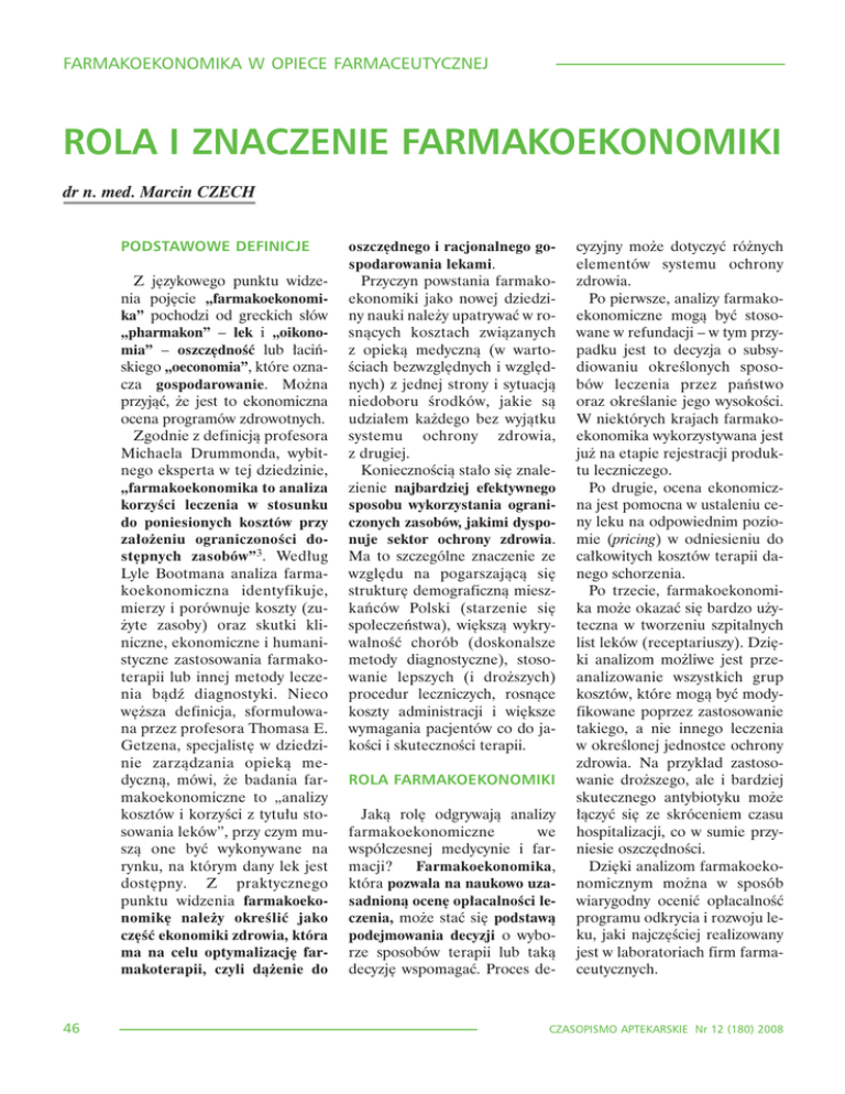 FARMAKOEKONOMIKA W OPIECE FARMACEUTYCZNEJ ??? ROLA I ZNACZENIE FARMAKOEKONOMIKI dr n. med. Marcin CZECH PODSTAWOWE DEFINICJE Z jêzykowego punktu widzenia pojêcie „farmakoekonomika” pochodzi od greckich s³ów „pharmakon” – lek i „oikonomia” – oszczêdnoœæ lub ³aciñskiego „oeconomia”, które oznacza gospodarowanie. Mo¿na przyj¹æ, ¿e jest to ekonomiczna ocena programów zdrowotnych. Zgodnie z definicj¹ profesora Michaela Drummonda, wybitnego eksperta w tej dziedzinie, „farmakoekonomika to analiza korzyœci leczenia w stosunku do poniesionych kosztów przy za³o¿eniu ograniczonoœci dostêpnych zasobów”3. Wed³ug Lyle Bootmana analiza farmakoekonomiczna identyfikuje, mierzy i porównuje koszty (zu¿yte zasoby) oraz skutki kliniczne, ekonomiczne i humanistyczne zastosowania farmakoterapii lub innej metody leczenia b¹dŸ diagnostyki. Nieco wê¿sza definicja, sformu³owana przez profesora Thomasa E. Getzena, specjalistê w dziedzinie zarz¹dzania opiek¹ medyczn¹, mówi, ¿e badania farmakoekonomiczne to „analizy kosztów i korzyœci z tytu³u stosowania leków”, przy czym musz¹ one byæ wykonywane na rynku, na którym dany lek jest dostêpny. Z praktycznego punktu widzenia farmakoekonomikê nale¿y okreœliæ jako czêœæ ekonomiki zdrowia, która ma na celu optymalizacjê farmakoterapii, czyli d¹¿enie do 46 oszczêdnego i racjonalnego gospodarowania lekami. Przyczyn powstania farmakoekonomiki jako nowej dziedziny nauki nale¿y upatrywaæ w rosn¹cych kosztach zwi¹zanych z opiek¹ medyczn¹ (w wartoœciach bezwzglêdnych i wzglêdnych) z jednej strony i sytuacj¹ niedoboru œrodków, jakie s¹ udzia³em ka¿dego bez wyj¹tku systemu ochrony zdrowia, z drugiej. Koniecznoœci¹ sta³o siê znalezienie najbardziej efektywnego sposobu wykorzystania ograniczonych zasobów, jakimi dysponuje sektor ochrony zdrowia. Ma to szczególne znaczenie ze wzglêdu na pogarszaj¹c¹ siê strukturê demograficzn¹ mieszkañców Polski (starzenie siê spo³eczeñstwa), wiêksz¹ wykrywalnoœæ chorób (doskonalsze metody diagnostyczne), stosowanie lepszych (i dro¿szych) procedur leczniczych, rosn¹ce koszty administracji i wiêksze wymagania pacjentów co do jakoœci i skutecznoœci terapii. ROLA FARMAKOEKONOMIKI Jak¹ rolê odgrywaj¹ analizy farmakoekonomiczne we wspó³czesnej medycynie i farmacji? Farmakoekonomika, która pozwala na naukowo uzasadnion¹ ocenê op³acalnoœci leczenia, mo¿e staæ siê podstaw¹ podejmowania decyzji o wyborze sposobów terapii lub tak¹ decyzjê wspomagaæ. Proces de- cyzyjny mo¿e dotyczyæ ró¿nych elementów systemu ochrony zdrowia. Po pierwsze, analizy farmakoekonomiczne mog¹ byæ stosowane w refundacji – w tym przypadku jest to decyzja o subsydiowaniu okreœlonych sposobów leczenia przez pañstwo oraz okreœlanie jego wysokoœci. W niektórych krajach farmakoekonomika wykorzystywana jest ju¿ na etapie rejestracji produktu leczniczego. Po drugie, ocena ekonomiczna jest pomocna w ustaleniu ceny leku na odpowiednim poziomie (pricing) w odniesieniu do ca³kowitych kosztów terapii danego schorzenia. Po trzecie, farmakoekonomika mo¿e okazaæ siê bardzo u¿yteczna w tworzeniu szpitalnych list leków (receptariuszy). Dziêki analizom mo¿liwe jest przeanalizowanie wszystkich grup kosztów, które mog¹ byæ modyfikowane poprzez zastosowanie takiego, a nie innego leczenia w okreœlonej jednostce ochrony zdrowia. Na przyk³ad zastosowanie dro¿szego, ale i bardziej skutecznego antybiotyku mo¿e ³¹czyæ siê ze skróceniem czasu hospitalizacji, co w sumie przyniesie oszczêdnoœci. Dziêki analizom farmakoekonomicznym mo¿na w sposób wiarygodny oceniæ op³acalnoœæ programu odkrycia i rozwoju leku, jaki najczêœciej realizowany jest w laboratoriach firm farmaceutycznych. CZASOPISMO APTEKARSKIE Nr 12 (180) 2008 FARMAKOEKONOMIKA W OPIECE FARMACEUTYCZNEJ ??? Farmakoekonomika jest nauk¹ interdyscyplinarn¹ (ryc. 1). Chocia¿ jest zaliczana do nauk ekonomicznych, a przez niektórych wprost uto¿samiana z ekonomik¹ ochrony zdrowia i stamt¹d czerpie wiêkszoœæ podstaw metodologicznych, trudno wyobraziæ sobie prowadzenie analiz bez dog³êbnej znajomoœci farmacji i medycyny. Konieczna jest wiedza farmakologiczna dotycz¹c¹ danego leku lub leków – ich dzia³añ niepo¿¹danych czy interakcji, oraz schematów terapeutycznych zwi¹zanych z leczeniem danej jednostki chorobowej. W tym miejscu warto wspomnieæ o tak wa¿nych z punktu widzenia opieki farmaceutycznej problemach jak przerwanie leczenia i zmniejszenie compliance. Nie bez znaczenia jest rozumienie patofizjologii, diagnostyki, sposobów leczenia choroby, która znajduje siê w spektrum zainteresowania farmakoekonomisty. Prowadz¹cy analizy farmakoekonomiczne powinien tak¿e wiedzieæ, w jaki sposób prowadzone s¹ badania kliniczne (standard Good Clinical Practice – GCP), oraz potrafiæ je prawid³owo oceniæ zgodnie z zasadami Medycyny Wiarygodnej (Medycyny Opartej na Dowodach, Evidence Based Medicine – EBM). Wybór odpowiednich sposobów pomiaru skutecznoœci leczenia, tzw. punktów koñcowych analizy, odró¿nienie twardych, inaczej zwanych pierwszorzêdowymi, punktów koñcowych, do których np. nale¿¹ œmiertelnoœæ, lata ¿ycia korygowane o jakoœæ, dni wolne od powik³añ, od punktów zastêpczych (drugorzêdowych), których Ryc. 1. Wielodyscyplinarny charakter oceny farmakoekonomicznej przyk³adem s¹ wskaŸniki laboratoryjne, ma zasadnicze znaczenie z punktu widzenia oceny skutecznoœci terapii. W prowadzeniu analiz farmakoekonomicznych, szczególnie ocen kosztów choroby, wielk¹ rolê odgrywa epidemiologia: chorobowoœæ czy zachorowalnoœæ zwi¹zana z okreœlonym schorzeniem daje podstawê do obliczenia kosztów danej choroby. Statystyka to kolejna nauka, z której korzystaj¹ farmakoekonomiœci, stosuj¹c j¹ w ocenie kosztów i efektów ró¿nych form terapii. Wykorzystanie znajduj¹ zarówno tradycyjne techniki statystyczne jak i niekla