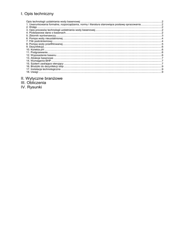 I. Opis techniczny Opis technologii uzdatniania wody basenowej .............................................................................................................2 1. Uwarunkowania formalne, rozporządzenia, normy i literatura stanowiące postawę opracowania ............................2 2. Wstęp .......................................................................................................................................................................2 3. Opis procesów technologii uzdatniania wody basenowej .........................................................................................2 4. Podstawowe dane o basenach.................................................................................................................................2 5. Zbiornik wyrównawczy..............................................................................................................................................3 6. Pompa wody nieuzdatnionej.....................................................................................................................................4 7. Filtr podciśnieniowy ..................................................................................................................................................4 8. Pompa wody przefiltrowanej.....................................................................................................................................5 9. Dezynfekcja ..............................................................................................................................................................6 10. Korekta pH .............................................................................................................................................................6 11. Podgrzewanie .........................................................................................................................................................6 12. Wyposażenie basenu .............................................................................................................................................6 13. Atrakcje basenowe .................................................................................................................................................7 14. Wymagania BHP ....................................................................................................................................................7 15. System zasilająco sterujący ...................................................................................................................................7 16. Brodziki do dezynfekcji stóp ...................................................................................................................................9 17. Instalacja technologiczna .......................................................................................................................................9 18. Uwagi .....................................................................................................................................................................9 II. Wytyczne branżowe III. Obliczenia IV. Rysunki Opis technologii uzdatniania wody basenowej 1. Uwarunkowania formalne, rozporządzenia, normy i literatura stanowiące postawę opracowania Jako podstawę do opracowania technologii uzdatniania wody basenowej dla otwartego kąpieliska Biała Prudnik wykorzystano następującą dokumentację: Wymagania sanitarno – higieniczne dla krytych pływalni. Opracowanie mgr inż. Czesław Sokołowski Rozporządzenie Ministra Zdrowia z dnia 19.03.2007 r. w sprawie jakości wody przeznaczonej do spożycia przez ludzi (Dz.U. Nr 61, poz. 417) Rozporządzenia Ministra Gospodarki Przestrzennej i Budownictwa z dnia 27 stycznia 1994 r. w sprawie bezpieczeństwa i higieny pracy przy stosowaniu środków chemicznych do uzdatniania wody i oczyszczania ścieków (Dz.U. Nr 21, poz. 73) „Planung von Schwimmbaden” –Christoph Saunus 1998r. Przepisy FINA Wytyczne projektowania basenów – PZiTS – Warszawa 1984 Niemiecka Norma DIN 19643 Obowiązujące normy i przepisy Katalogi firm branży basenowej 2. Wstęp Obiekt został zaprojektowany jako otwarte kąpielisko. Składa się ono z basenu pływackiego, basenu rekreacyjnego z atrakcjami oraz z brodzika dla dzieci. Technologię uzdatniania wody basenowej zaprojektowano przy wykorzystaniu filtracji na filtrach podciśnieniowych. Niecki basenowe zaprojektowano ze stali nierdzewnej. 3. Opis procesów technologii uzdatniania wody basenowej Każdy basen posiada osobną stację uzdatniania wody basenowej. Filtracja wody basenowej odbywa się na filtrach podciśnieniowych ze złożem filtracyjnym z ziemi okrzemkowej. Proces filtracji, proces płukania filtrów, kontrola jakości wody oraz utrzymanie odpowiednich parametrów wody odbywa się automatycznie. Przewidziano monitorowanie, archiwizowanie i wizualizację parametrów oraz stanów alarmowych. Dla każdego basenu zaprojektowano zamknięty obieg uzdatniania wody. Woda z basenu przelewa się do rynny przelewowej, skąd rurociągami jest odprowadzana do zbiornika wyrównawczego. Ze zbiornika woda jest zasysana poprzez pompę wody nieuzdatnionej i tłoczona do filtra. Na filtrze podciśnieniowym wypełnionym złożem filtracyjnym – ziemią okrzemkową - zachodzi proces filtracji. Dalej woda jest zasysana przez pompę wody przefiltrowanej. Pompa tłoczy wodę poprzez rurociąg tłoczny, gdzie przeprowadza się podgrzanie, korektę pH oraz dezynfekcję wody, a następnie woda doprowadzana jest do niecki basenu, gdzie poprzez systemowe kanały dyszowe jest równomiernie rozprowadzona w całej niecce. W ten sposób następuje zamknięcie obiegu wody basenowej. Do uzdatniania wody wykorzystuje się podchloryn wapnia. Natomiast korektę pH przeprowadza się za pomocą kwasu siarkowego. Basen rekreacyjny został zaprojektowany z atrakcjami wodnymi, dla których przewidz