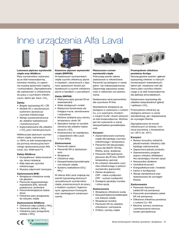 Inne urządzenia Alfa Laval Lutowane płytowe wymienniki ciepła oraz AlfaNova Płyty wymienników wykonane są ze stali kwasoodpornej, lutowane miedzią, co zapewnia wysoką sprawność cieplną i wytrzymałość. Zaprojektowane dla zastosowań w chłodnictwie do pracy z czynnikami chłodniczymi, takimi jak: freon, CO2. Zalety: • Bogaty typoszereg AC i CB • Modele AC z wbudowanym systemem dystrybucji czynnika chłodniczego • Wersje wysokociśnieniowe do układów kaskadowych i transkrytycznych • Zoptymalizowane dla układów z CO2 pod i transkrytycznych AlfaNova jest płytowym wymiennikiem ciepła, wykonanym w 100% ze stali kwasoodpornej. (za pomocą rewolucyjnej technologii opracowanej przez Alfa Laval, tzw. AlfaFusionTM). Zalety AlfaNova: • Kompaktowa i lekka konstrukcja, łatwa instalacja • Mały ładunek czynnika chłodniczego • Wysoka odporność korozyjna Zastosowania BHE: • Skraplacze chłodzone wodą lub glikolem • Parowniki bezpośredniego rozprężania (DX), obwody pojedyncze i podwójne • Parowniki/skraplacze kaskadowe • Chłodnice pary przegrzanej do odzysku ciepła Zastosowania AlfaNova: • Chłodnice oleju (układy z NH3) • Parowniki (układy z NH3) • Chłodnice pary przegrzanej (układy z NH3) Kasetowe płytowe wymienniki ciepła (SWPHE) W kasetowych wymiennikach ciepła czynnik chłodniczy płynie w kasetach, utworzonych z laserowo spawanych dwóch pyt kanałowych a czynnik chłodzony płynie w kanałach z uszczelkami. Zalety SWPHE: • Efektywne płyty (ponad 20 lat doświadczeń) • Wiele dostępnych modeli • Elastyczna konstrukcja ułatwiająca mycie, serwisowanie i rozbudowę • Możliwe działanie przy różnicy temperatury około 3K • Specjalna wersja na wysokie ciśnienia dla układów kaskadowych z CO2 • Dostosowany do współpracy z separatorem Alfa Laval U-turn (NH3) Zastosowania • Parowniki zalane • Parowniki DX (z dystrybutorem) • Skraplacze • Chłodnice oleju • Desuperheatery/przedskraplacze (odzysk ciepła) • Systemy kaskadowe (CO2/ NH3) W ofercie Alfa Laval znajduje się szeroki typoszereg płytowych uszczelkowych wymienników ciepła, przeznaczonych do pracy z mediami czystymi, higienicznymi, agresywnymi korozyjnie oraz zawierającymi zanieczyszczenia. Płaszczowo-rurowe wymienniki ciepła Pokrywają szeroki zakres zastosowań w chłodnictwie. Parowniki są dostępne w wersji jedno- lub wieloprzepływowej. Zapewniają najwyższą wydajność w zależności od zastosowania. Przemysłowe chłodnice powietrza Arctigo Niewiarygodnie szeroki i głęboki typoszereg chłodnic w różnych kombinacjach materiałowych, takich jak: miedziane rurki dla freonu jako czynnika chłodniczego a ze stali kwasoodpornej dla aplikacji amoniakalnych. Dedykowana seria parowników dla czynników R134a. Dedykowany typoszereg dla układów bezpośrednich (glikol) i aplikacji z CO2. Standardowe skraplacze są dostępne w wykonaniu z rurkami Cu, a w wykonaniu morskim z rurkami Cu/Ni i dnami sitowymi ze stali kwasoodpornej. Możliwe jest też wykonanie w wersji desuperheatera (przedskraplacze). Korzyści: • Zoptymalizowana wymiana ciepła dla każdego czynnika chłodniczego i temperatury • Parowniki DH (dwuprzepływowe dla R407F, R410a, R404a, temp. dodatnie) • Parowniki DM (jednoprzepływowe dla R134a, R407F, temperatury ujemne) • Do czterech obwodów czynnika chłodniczego w jednym wymienniku (parowniki) • Zakres skraplaczy: CXP - niskie wydajności CRF - wyższe wydajności • Dostępne aprobaty morskie i różne opcje Zastosowania • Skraplacze chłodzone wodą • Desuperheatery/przedskraplacze (odzysk ciepła) • Skraplacze morskie • Parowniki DX do układów chłodzenia i zamrażania • Chillery i pompy ciepła Przemysłowe chłodnice są dostępne zarówno w wersji standardowej, jak i dopasowanej do wymagań Klienta. Zaprojektowane do komór chłodniczych ze świeżą i mrożoną żywnością, z temperaturą od +20°C do -40°C. Korzyści: • Bardzo korzystny wskaźnik jakość/wartość chłodnicy (dla każdego zastosowania) • Zapewniona jakość produktu • Zaawansowany program doboru chłodnic (AlfaSelect Air) zawierający również opcje • Niezawodne działanie • Certyfikat Eurovent • Energoefektywność i trwałość • Łatwe w konfiguracji • Wersje standardowe oraz dostosowane do wymagań Klienta Zastosowania • Parowniki freonowe (układ DX lub pompowy) • Parowniki amoniakalne (układ DX lub pompowy) • Glikolowe chłodnice powietrza z rurkami Cu i SS • Mroźnie, komory chodnicze i pomieszczenia robocze, tunele zamrażalnicze Seria komercyjnych chłodnic powietrza i skraplaczy 31