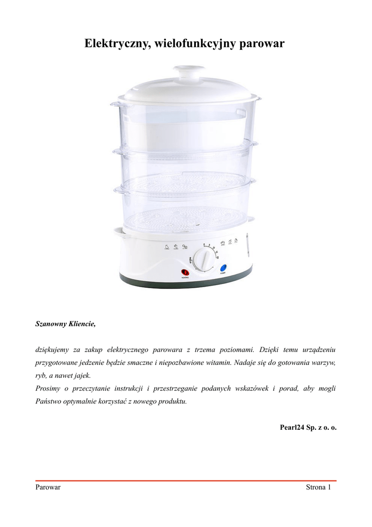 Elektryczny, wielofunkcyjny parowar Szanowny Kliencie, dziękujemy za zakup elektrycznego parowara z trzema poziomami. Dzięki temu urządzeniu przygotowane jedzenie będzie smaczne i niepozbawione witamin. Nadaje się do gotowania warzyw, ryb, a nawet jajek. Prosimy o przeczytanie instrukcji i przestrzeganie podanych wskazówek i porad, aby mogli Państwo optymalnie korzystać z nowego produktu. Pearl24 Sp. z o. o. Parowar Strona 1 Zawartość zestawu: • Element regulacyjny • Pierścień ochronny • 1 taca (dolna powłoka) • 3 tace do gotowania na parze • 1 taca do gotowania ryżu (miska) • 1 pokrywa (górna powłoka) • Instrukcja obsługi Dane techniczne • Pojemność: 8,4 litra • Moc: 900 W • Zasilanie: 230 V • Długość kabla: 115 cm • Wymiary: 300 x 425 x 200 mm Parowar Strona 2 Ważne informacje na początek Bezpieczeństwo • Niniejsza instrukcja ma na celu zapoznanie Państwa z zasadami prawidłowego korzystania z produktu. Zaleca się przechowywanie instrukcji w łatwo dostępnym miejscu, aby w razie potrzeby mogli Państwo zweryfikować informacje. • Wszelkie modyfikacje produktu obniżają poziom jego bezpieczeństwa. UWAGA! Istnieje ryzyko obrażeń! • Nie należy rozkładać ani naprawiać urządzenia samodzielnie! • Zaleca się ostrożne obchodzenie się z produktem. Produkt może ulec uszkodzeniu w wyniku uderzenia, wstrząsów lub upadku nawet z niewielkiej wysokości. • Produkt należy trzymać z dala od wilgoci i wysokiej temperatury. • Nie należy zanurzać elementu sterującego produktu w wodzie i innych płynach. • Nie należy dotykać gorącego urządzenia bez rękawice kuchennych i nie należy używać urządzenia bez pokrywy. • Należy trzymać pokrywę podczas zdejmowania tak, aby nie weszła w kontakt z wydobywającą się parą lub kapiącą gorącą wodą. • Urządzenie jest przeznaczone do użytku domowego. • Uważaj na gorącą ciecz w tacy ociekowej. • Po użyciu należy zawsze wyjąć wtyczkę z gniazdka. • Produkt powinien znajdować się w bezpiecznej odległości od górnych szafek/półek i bocznych obiektów. • Należy ustawić urządzenie na suchej, płaskiej i żaroodpornej powierzchni. • Nigdy nie należy przesuwać urządzenia podczas użytkowania! • Pojemnik można wypełnić tylko wodą. Nie należy używać innych płynów. • Należy wyczyścić poszczególne części tak jak zostało to opisane w sekcji „Czyszczenie i przechowywanie”. • Upewnij się, że żywność nie dotyka elementu grzewczego w pokrywie podczas użytkowania. • Nie należy przechowywać resztek w urządzeniu. • Używaj urządzenia wyłącznie w zamkniętych pomieszczeniach. • Zachowaj bezpieczną odległość od innych źródeł ciepła, takich jak np. płyty kuchenne lub piece, aby zapobiec uszkodzeniu sprzętu. Parowar Strona 3 • Urządzenie nie powinno znajdować się w pobliżu łatwopalnych materiałów (zasłony, tekstylia). • Nie należy ustawiać urządzenia na kuchence lub w pobliżu źródła gazu. • Należy podłączyć urządzenie tylko do prawidłowo zainstalowanego gniazdka z uziemieniem. Gniazdko musi być łatwo dostępne po podłączeniu. • Upewnij się, że podłączony kabel zasilający nie jest zagrożeniem potknięcia. Przewód nie może zwisać z powierzchni. Nigdy nie ciągnij za przewód zasilający w celu przeniesienia urządzenia. • Kabel nie może być przygnieciony, zagięty i nie powinien stykać się z gorącymi powierzchniami. • Nie zakrywaj urządzenia podczas użytkowania, aby uniknąć niebezpieczeństwa pożaru. • Nie należy umieszczać żadnych łatwopalnych materiałów (karton, plastik, papier) na lub w urządzeniu. • Używaj tylko dostarczonych akcesoriów. • Wyłącz urządzenie, gdy pokrywa nie jest zamknięta. • Nie należy pozostawiać urządzenia bez nadzoru podczas pracy! • Urządzenie nagrzewa się podczas użytkowania. Prosimy upewnić się, że urządzenie nie styka się z rozgrzanymi częściami w trakcie i po użyciu. Dotykaj tylko uchwytu i kontrolera, gdy urządzenie jest w pracy lub bezpośrednio po zatrzymaniu. UWAGA! Istnieje ryzyko poparzenia! • Należy przenosić urządzenie tylko wtedy, gdy jest całkowicie schłodzone. • To urządzenie nie jest przeznaczone do stosowania przez osoby (w tym dzieci) z ograniczonymi możliwościami sensorycznymi lub umysłowymi, chyba że są one nadzorowane przez osobę odpowiedzialną za ich bezpieczeństwo lub uzyskają od niej wskazówki dotyczące sposobu korzystania z urządzenia. Dzieci powinny być nadzorowane, aby nie bawiły się urządzeniem. • Wszelkie prawa do wprowadzania zmian technicznych oraz eliminacji błędów są zastrzeżone. Parowar Strona 4 Ważne wskazówki dotyczące utylizacji Urządzenia elektrycznego nie zalicza się do odpadów gospodarstwa domowego. W celu właściwej utylizacji urządzenia należy skontaktować się z organizacją odpowiedzialną za zbiórkę elektroodpadów w wybranej miejscowości. Deklaracja zgodności PEARL.GmbH oświadcza, że produkt NC-3621 jest zgodny z dyrektywą o bezpieczeństwie produktu 2001/95/EG, dyrektywą EMV 2004/108/EG, dyrektywą niskonapięciową 2006/95/EG i dyrektywą RoHS 2011/65/UE. Parowar Strona 5 Szczegóły produktu 1. Pokrywa 2. Taca do gotowania na parze 3. Taca ociekowa 4. Taca do gotowania na parze 5. Taca ociekowa 6. Taca do gotowania na parze ryżu 7. Taca do gotowania na parze 8. Taca ociekowa 9. Obudowa elementu grzewczego 10. Panel sterowania ze zbiornikiem wody 11. Wskaźnik poziomu wody 12. Dioda LED zasilania 13. Kabel zasilający 14. Element grzewczy 15. Czasomierz 16. Wyświetlacz ogrzewania Parowar Strona 6 Uruchomienie 1. Wyjmij urządzenie i wszystkie akcesoria z opakowania. 2. Oczyść wszystkie części wodą z odrobiną płynu do mycia naczyń - za wyjątkiem panelu sterowania. Wypłucz i osusz dokładnie. 3. Urządzenie należy ustawić na płaskiej, suchej, antypoślizgowej i odpornej na temper