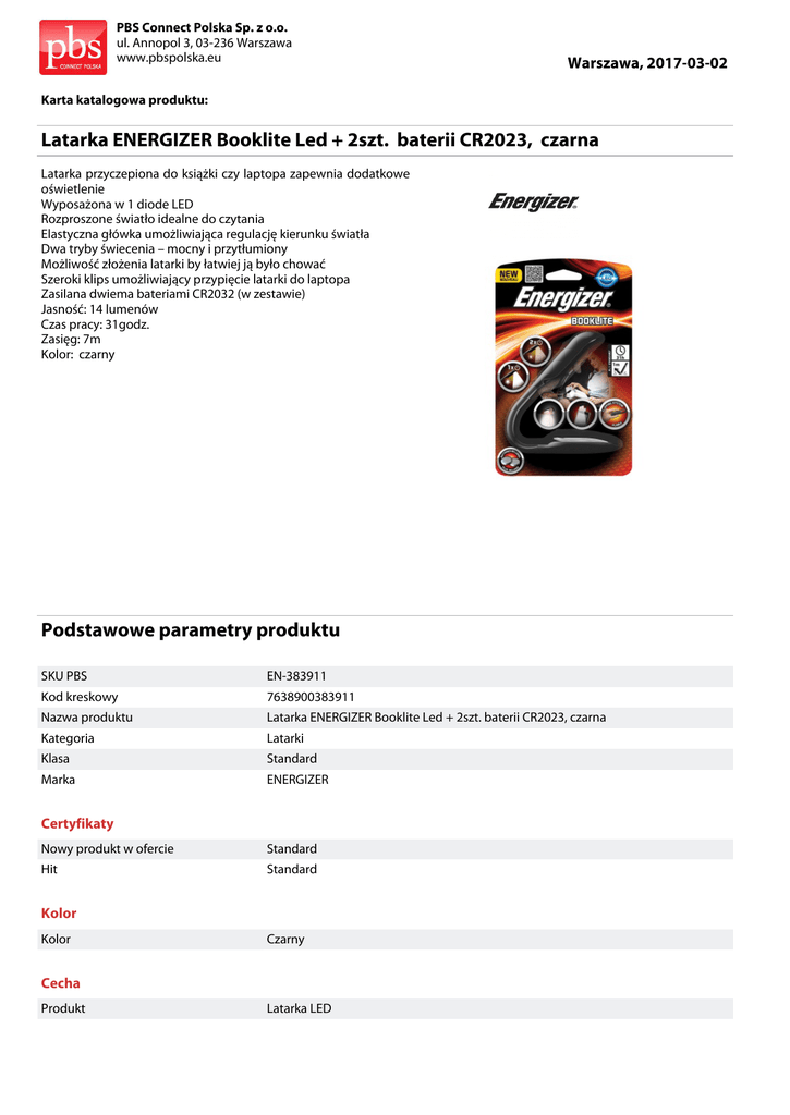 PBS Connect Polska Sp. z o.o. ul. Annopol 3, 03-236 Warszawa www.pbspolska.eu Warszawa, 2017-03-02 Karta katalogowa produktu: Latarka ENERGIZER Booklite Led + 2szt. baterii CR2023, czarna Latarka przyczepiona do książki czy laptopa zapewnia dodatkowe oświetlenie Wyposażona w 1 diode LED Rozproszone światło idealne do czytania Elastyczna główka umożliwiająca regulację kierunku światła Dwa tryby świecenia – mocny i przytłumiony Możliwość złożenia latarki by łatwiej ją było chować Szeroki klips umożliwiający przypięcie latarki do laptopa Zasilana dwiema bateriami CR2032 (w zestawie) Jasność: 14 lumenów Czas pracy: 31godz. Zasięg: 7m Kolor: czarny Podstawowe parametry produktu SKU PBS EN-383911 Kod kreskowy 7638900383911 Nazwa produktu Latarka ENERGIZER Booklite Led + 2szt. baterii CR2023, czarna Kategoria Latarki Klasa Standard Marka ENERGIZER Certyfikaty Nowy produkt w ofercie Standard Hit Standard Kolor Kolor Czarny Cecha Produkt Latarka LED PBS Connect Polska Sp. z o.o. ul. Annopol 3, 03-236 Warszawa www.pbspolska.eu Warszawa, 2017-03-02 Karta katalogowa produktu cd. Latarka ENERGIZER Booklite Led + 2szt. baterii CR2023, czarna Podstawowe parametry produktu Typ LED Rodzaj 14 lumenów Materiał Tworzywo W ofercie od 2015-07 Wspólny słownik zamówień CPV 31521320-3 Jednostki logistyczne Opakowanie 1 12 szt Opakowanie 2 576 szt