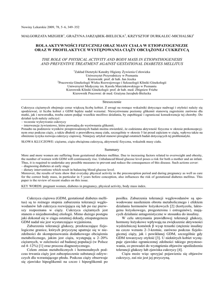 Nowiny Lekarskie 2009, 78, 5–6, 349–352 MAŁGORZATA MIZGIER1, GRAŻYNA JARZĄBEK-BIELECKA2, KRZYSZTOF DURKALEC-MICHALSKI1 ROLA AKTYWNOŚCI FIZYCZNEJ ORAZ MASY CIAŁA W ETIOPATOGENEZIE ORAZ W PROFILAKTYCE WYSTĘPOWANIA CIĄŻY OBCIĄŻONEJ CUKRZYCĄ THE ROLE OF PHYSICAL ACTIVITY AND BODY MASS IN ETIOPATHOGENESIS AND PREVENTIVE TREATMENT AGAINST GESTATIONAL DIABETES MELLITUS 1 Zakład Dietetyki Katedry Higieny Żywienia Człowieka Uniwersytet Przyrodniczy w Poznaniu Kierownik: prof. dr hab. Jan Jeszka 2 Pracownia Ginekologii Wieku Rozwojowego i Seksuologii Kliniki Ginekologii Uniwersytet Medyczny im. Karola Marcinkowskiego w Poznaniu Kierownik Kliniki Ginekologii: prof. dr hab. med. Zbigniew Friebe Kierownik Pracowni: dr med. Grażyna Jarząbek-Bielecka Streszczenie Cukrzyca ciężarnych obejmuje coraz większą liczbę kobiet. Z uwagi na rosnące wskaźniki dotyczące nadwagi i otyłości należy się spodziewać, iż liczba kobiet z GDM będzie nadal wzrastać. Niewyrównane poziomy glikemii stanowią zagrożenie zarówno dla matki, jak i noworodka, trzeba zatem podjąć wszelkie możliwe działania, by zapobiegać i ograniczać konsekwencje tej choroby. Do działań tych należy zaliczyć: – wczesne wykrywanie cukrzycy – interwencje żywieniowe, które prowadzą do wyrównania glikemii. Ponadto na podstawie wyników przeprowadzonych badań można stwierdzić, że codzienna aktywność fizyczna w okresie prekoncepcyjnym oraz podczas ciąży, a także dbałość o prawidłową masę ciała, szczególnie w okresie 5 lat przed zajściem w ciążę, wpływa także na obniżenie ryzyka rozwoju cukrzycy ciążowej. Niniejszy artykuł stanowi przegląd ostatnich badań dotyczących tej problematyki. SŁOWA KLUCZOWE: ciężarne, ciąża obciążona cukrzycą, aktywność fizyczna, wskaźnik masy ciała. Summary More and more women are suffering from gestational diabetes mellitus. Due to increasing factors related to overweight and obesity, the number of women with GDM will continuously rise. Unbalanced blood glucose level poses a risk for both a mother and an infant. Thus, it is required to undertake any possible measures to prevent and reduce the consequences of this disease. Such actions cover: – diagnosing diabetes at early stage – dietary interventions which result in balancing blood glucose level. Moreover, the results of tests show that everyday physical activity in the preconception period and during pregnancy as well as care for the correct body mass, in particular in 5 years before conception, also influences the risk of gestational diabetes mellitus. This paper is the review of recent studies on this issue. KEY WORDS: pregnant women, diabetes in pregnancy, physical activity, body mass index. Cukrzyca ciążowa (GDM, gestational diabetes mellitus) są to rożnego stopnia zaburzenia tolerancji węglowodanów lub cukrzyca rozwijająca się lub po raz pierwszy rozpoznana w ciąży. Cukrzyca ciężarnych jest stanem o niejednorodnej etiologii. Mimo dużego postępu jaki dokonał się w ciągu ostatniej dekady, etiopatogeneza GDM nadal nie jest wystarczająco wyjaśniona. Zaburzenia tolerancji glukozy, przekraczające fizjologiczne granice, których przyczynę upatruje się w niezdolności do skompensowania dodatkowego obciążenia metabolicznego, jakim jest ciąża, występują u 2–20% ciężarnych, w zależności od badanej populacji (w Polsce od 4–12%) [1] oraz procesu diagnostycznego. Celem zmian metabolicznych i hormonalnych podczas trwania ciąży jest zabezpieczenie substancji odżywczych dla wzrastającego płodu. Podczas ciąży obserwuje się zjawisko hipoglikemii na czczo i hiperglikemii po posiłku. Zaburzenia tolerancji węglowodanów są spowodowane nasileniem obrotu metabolicznego i efektem działania hormonów łożyskowych [2] (kortyzolu, laktogenu łożyskowego, progesteronu i estrogenów), mających działanie antagonistyczne w stosunku do insuliny. W celu utrzymania prawidłowej tolerancji glukozy, hormony łożyskowe wpływają na zwiększenie aktywności wydzielniczej komórek β wysp trzustki (stężenie insuliny na czczo wzrasta 2–3-krotnie, zarówno podczas fizjologicznej ciąży, jak i powikłanej GDM, szczególnie gdy GDM towarzyszy otyłość [3]. U niektórych kobiet występuje zjawisko ograniczonej zdolności takiego przystosowania, co prowadzi do wystąpienia objawów upośledzenia tolerancji glukozy lub zjawiska cukrzycy [4]. Ciąża może więc sprzyjać pojawieniu się objawów cukrzycy, zaś nie jest jej przyczyną. 350 Małgorzata Mizgier i inni W ciąży, szczególnie w drugim i trzecim trymestrze, fizjologicznie zmniejsza się zdolność działania insuliny na tkanki obwodowe tj. narastają cechy insulinooporności, spowodowane działaniem ww. hormonów. Początkowo oporność tkanek na insulinę jest wyrównywana poprzez hiperinsulinemię. Jednakże ograniczone możliwości kompensacyjne prowadzą do hiperglikemii, co z kolei wpływa na dysfunkcję komórek β trzustki i dalsze zmniejszanie wrażliwości tkanek na insulinę. Podwyższone zaś stężenie wolnych kwasów tłuszczowych (FFA, free fatty acids) działa lipotoksycznie na czynność trzustki i wzmaga glukotoksyczny wpływ hiperglikemii [3]. Wielu autorów podkreśla występowanie cech wspólnych cukrzycy ciążowej oraz cukrzycy typu 2. tj. występowanie insulinooporności z towarzyszącym niedoborem insuliny. W obu rodzajach zaburzeń gospodarki węglowodanowej komórki β wysp trzustkowych nie są w stanie sprostać zwiększonemu zapotrzebowaniu na insulinę [5]. U pacjentek z GDM z jednej strony obserwuje się postępujące zaburzenia wydzielania insuliny oraz spadek insulinowrażliwości tkanek docelowych, a z drugiej – postępującą upośledzoną kompensację komórek β trzustki, a następnie ich dysfunkcję [6]. Zjawisko insulinooporności szczególnie nasilone jest u kobiet otyłych [7]. O roli tkanki tłuszczowej w rozwoju insulinooporności traktuje wielu autoró
