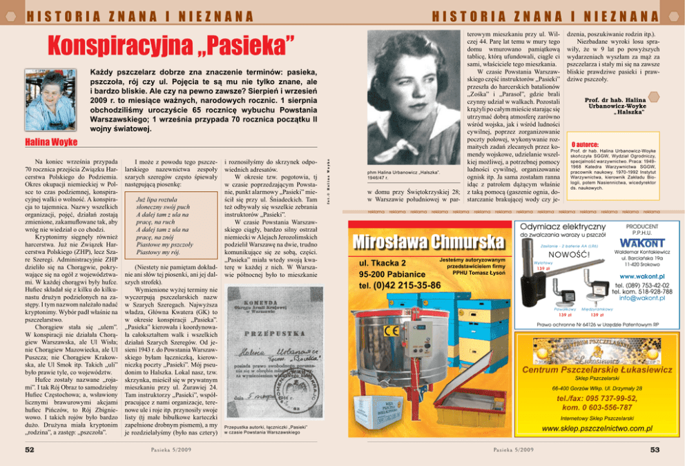 HISTORIA ZNANA I NIEZNANA HISTORIA ZNANA I NIEZNANA Konspiracyjna „Pasieka” Każdy pszczelarz dobrze zna znaczenie terminów: pasieka, pszczoła, rój czy ul. Pojęcia te są mu nie tylko znane, ale i bardzo bliskie. Ale czy na pewno zawsze? Sierpień i wrzesień 2009 r. to miesiące ważnych, narodowych rocznic. 1 sierpnia obchodziliśmy uroczyście 65 rocznicę wybuchu Powstania Warszawskiego; 1 września przypada 70 rocznica początku II wojny światowej. Na koniec września przypada 70 rocznica przejścia Związku Harcerstwa Polskiego do Podziemia. Okres okupacji niemieckiej w Polsce to czas podziemnej, konspiracyjnej walki o wolność. A konspiracja to tajemnica. Nazwy wszelkich organizacji, pojęć, działań zostają zmienione, zakamuflowane tak, aby wróg nie wiedział o co chodzi. Kryptonimy sięgnęły również harcerstwa. Już nie Związek Harcerstwa Polskiego (ZHP), lecz Szare Szeregi. Administracyjnie ZHP dzieliło się na Chorągwie, pokrywające się na ogół z województwami. W każdej chorągwi były hufce. Hufiec składał się z kilku do kilkunastu drużyn podzielonych na zastępy. I tym nazwom należało nadać kryptonimy. Wybór padł właśnie na pszczelarstwo. Chorągiew stała się „ulem”. W konspiracji nie działała Chorągiew Warszawska, ale Ul Wisła; nie Chorągiew Mazowiecka, ale Ul Puszcza; nie Chorągiew Krakowska, ale Ul Smok itp. Takich „uli” było prawie tyle, co województw. Hufce zostały nazwane „rojami”. I tak Rój Obraz to samodzielny Hufiec Częstochowa; a, wsławiony licznymi brawurowymi akcjami hufiec Pińczów, to Rój Zbigniewowo. I takich rojów było bardzo dużo. Drużyna miała kryptonim „rodzina”, a zastęp: „pszczoła”. 52 I może z powodu tego pszczelarskiego nazewnictwa zespoły szarych szeregów często śpiewały następującą piosenkę: Już lipa roztula słoneczny swój puch A dalej tam z ula na pracę, na ruch A dalej tam z ula na pracę, na znój Piastowe my pszczoły Piastowy my rój. (Niestety nie pamiętam dokładnie ani słów tej piosenki, ani jej dalszych strofek). Wymienione wyżej terminy nie wyczerpują pszczelarskich nazw w Szarych Szeregach. Najwyższa władza, Główna Kwatera (GK) to w okresie konspiracji „Pasieka”. „Pasieka” kierowała i koordynowała całokształtem walk i wszelkich działań Szarych Szeregów. Od jesieni 1943 r. do Powstania Warszawskiego byłam łączniczką, kierowniczką poczty „Pasieki”. Mój pseudonim to Halszka. Lokal nasz, tzw. skrzynka, mieścił się w prywatnym mieszkaniu przy ul. Żurawiej 24. Tam instruktorzy „Pasieki”, współpracujące z nami organizacje, terenowe ule i roje itp. przynosiły swoje listy (tj małe bibułkowe karteczki zapełnione drobnym pismem), a my je rozdzielałyśmy (było nas cztery) Pa s i eka 5 /2 0 0 9 i roznosiłyśmy do skrzynek odpowiednich adresatów. W okresie tzw. pogotowia, tj w czasie poprzedzającym Powstanie, punkt alarmowy „Pasieki” mieścił się przy ul. Śniadeckich. Tam też odbywały się wszelkie zebrania instruktorów „Pasieki”. W czasie Powstania Warszawskiego ciągły, bardzo silny ostrzał niemiecki w Alejach Jerozolimskich podzielił Warszawę na dwie, trudno komunikujące się ze sobą, części. „Pasieka” miała wtedy swoją kwaterę w każdej z nich. W Warszawie północnej było to mieszkanie fot.© Halina Woyke Halina Woyke phm Halina Urbanowicz „Halszka”. 1946/47 r. w domu przy Świętokrzyskiej 28; w Warszawie południowej w parreklama reklama reklama reklama terowym mieszkaniu przy ul. Wilczej 44. Parę lat temu w mury tego domu wmurowano pamiątkową tablicę, którą ufundowali, ciągle ci sami, właściciele tego mieszkania. W czasie Powstania Warszawskiego część instruktorów „Pasieki” przeszła do harcerskich batalionów „Zośka” i „Parasol”, gdzie brali czynny udział w walkach. Pozostali krążyli po całym mieście starając się utrzymać dobrą atmosferę zarówno wśród wojska, jak i wśród ludności cywilnej, poprzez zorganizowanie poczty polowej, wykonywanie rozmaitych zadań zlecanych przez komendy wojskowe, udzielanie wszelkiej możliwej, a potrzebnej pomocy ludności cywilnej, organizowanie ognisk itp. Ja sama zostałam ranna idąc z patrolem dążącym właśnie z taką pomocą (gaszenie ognia, dostarczanie brakującej wody czy je- reklama reklama reklama reklama reklama dzenia, poszukiwanie rodzin itp.). Niezbadane wyroki losu sprawiły, że w 9 lat po powyższych wydarzeniach wyszłam za mąż za pszczelarza i stały mi się na zawsze bliskie prawdziwe pasieki i prawdziwe pszczoły. Prof. dr hab. Halina Urbanowicz-Woyke „Halszka” O autorce: Prof. dr hab. Halina Urbanowicz-Woyke skończyła SGGW, Wydział Ogrodniczy, specjalność warzywnictwo. Praca: 19491968 Katedra Warzywnictwa SGGW, pracownik naukowy. 1970-1992 Instytut Warzywnictwa, kierownik Zakładu Biologii, potem Nasiennictwa, wicedyrektor ds. naukowych. reklama reklama reklama Odymiacz elektryczny Mirosława Chmurska reklama reklama PRODUCENT P.P.H.U. do zwalczania warozy u pszczół Zasilanie - 2 baterie AA (LR6) Waldemar Kontakiewicz ul. Barciańska 19a 11-420 Srokowo NOWOŚĆ! Jesteśmy autoryzowanym przedstawicielem firmy PPHU Tomasz Łysoń ul. Tkacka 2 95-200 Pabianice tel. (0)42 215-35-86 Wylotowy 139 zł www.wakont.pl tel. (089) 753-42-02 tel. kom. 518-928-788 [email protected] Powałkowy Międzyramkowy Międzyramkow 139 zł 139 zł Prawo ochronne Nr 64126 w Urzędzie Patentowym RP Centrum Pszczelarskie Łukasiewicz Sklep Pszczelarski 66-400 Gorzów Wlkp. Ul. Drzymały 28 tel./fax: 095 737-99-52, kom. 0 603-556-787 Internetowy Sklep Pszczelarski Przepustka autorki, łączniczki „Pasieki” w czasie Powstania Warszawskiego www.sklep.pszczelnictwo.com.pl Pa s iek a 5/ 2 00 9 53