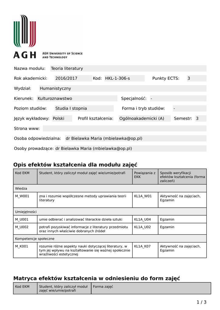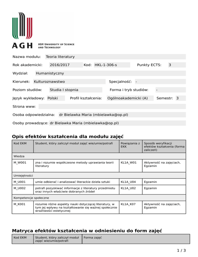 Nazwa modułu: Teoria literatury Rok akademicki: 2016/2017 Wydział: Humanistyczny Kierunek: Kulturoznawstwo Poziom studiów: Kod: HKL-1-306-s Specjalność: Studia I stopnia Język wykładowy: Polski Punkty ECTS: - Forma i tryb studiów: Profil kształcenia: 3 Ogólnoakademicki (A) Semestr: 3 Strona www: Osoba odpowiedzialna: dr Bielawka Maria ([email protected]) Osoby prowadzące: dr Bielawka Maria ([email protected]) Opis efektów kształcenia dla modułu zajęć Kod EKM Student, który zaliczył moduł zajęć wie/umie/potrafi Powiązania z EKK Sposób weryfikacji efektów kształcenia (forma zaliczeń) zna i rozumie współczesne metody uprawiania teorii literatury KL1A_W01 Aktywność na zajęciach, Egzamin M_U001 umie odbierać i analizować literackie dzieła sztuki KL1A_U04 Egzamin M_U002 potrafi pozyskiwać informacje z literatury przedmiotu oraz innych właściwie dobranych źródeł KL1A_U02 Egzamin KL1A_K07 Aktywność na zajęciach, Egzamin Wiedza M_W001 Umiejętności Kompetencje społeczne M_K001 rozumie różne aspekty nauki dotyczącej literatury, w tym jej wpływu na kształtowanie się ważnej społecznie wrażliwości estetycznej Matryca efektów kształcenia w odniesieniu do form zajęć Kod EKM Student, który zaliczył moduł zajęć wie/umie/potrafi Forma zajęć 1/3 Ćwiczenia laboratoryjne Ćwiczenia projektowe Konwersatori um Zajęcia seminaryjne Zajęcia praktyczne Zajęcia terenowe Zajęcia warsztatowe + - - - - - - - - - - M_U001 umie odbierać i analizować literackie dzieła sztuki + - - - - - - - - - - M_U002 potrafi pozyskiwać informacje z literatury przedmiotu oraz innych właściwie dobranych źródeł + - - - - - - - - - - + - - - - - - - - - - E-learning Ćwiczenia audytoryjne zna i rozumie współczesne metody uprawiania teorii literatury Inne Wykład Karta modułu - Teoria literatury Wiedza M_W001 Umiejętności Kompetencje społeczne M_K001 rozumie różne aspekty nauki dotyczącej literatury, w tym jej wpływu na kształtowanie się ważnej społecznie wrażliwości estetycznej Treść modułu zajęć (program wykładów i pozostałych zajęć) Wykład I Wprowadzenie (6 godz.): Literaturoznawstwo w szerokim rozumieniu: teoria literatury, opisowa nauka dotycząca konkretnych dzieł literackich, historia literatury, krytyka literacka. Podstawowe pytania teorii literatury o istotę, poznawanie, strukurę i funkcję dzieła literackiego. II Metody współczesnych badań literackich (12 godz.) związane z podejściem: - psychoanalitycznym (Z. Freud, C. G. Jung, J. Lacan), - fenomenologicznym (E. Husserl, R. Ingarden, G. Poulet), - hermeneutycznym (M. Heidegger, P. Ricoeur, H.-G. Gadamer), - formalistycznym (W. B. Szkłowski, T. S. Eliot), - strukturalistycznym (J. Mukařovský), - semiotycznym (U. Eco), - dekonstrukcjonistycznym (J. Derrida, P. de Man). III Wybrane szczegółowe zagadnienia teorii literatury (10 godz.): Sposób istnienia i struktura dzieła literackiego. Dzieło i jego konkretyzacje. Estetyczne i badawcze poznawanie literackiego dzieła sztuki. Arcydzieło a kultura masowa. Wyznaczniki rodzajowe i gatunkowe literatury. Prądy i kierunki literackie. „Obrazowość” a środki stylistyczne. Zagadnienie prawdy i „idei” dzieła literackiego. Literatura wobec innych sztuk – problem korespondencji kodów. 2/3 Karta modułu - Teoria literatury Sposób obliczania oceny końcowej Ocena końcowa jest równoważna z oceną z egzaminu Wymagania wstępne i dodatkowe Obecność na wykładach obowiązkowa Zalecana literatura i pomoce naukowe Literatura obowiązkowa (wybrane fragmenty następujących podręczników): Z. Mitosek, Teorie badań literackich. Przegląd historyczny, Warszawa 1995. A. Burzyńska, M. P. Markowski, Teorie literatury XX wieku. Podręcznik, Kraków 2006. A. Burzyńska, M. P. Markowski, Teorie literatury XX wieku. Antologia, Kraków 2006. Literatura zalecana R. Ingarden, O dziele literackim, Warszawa 1960. H. Markiewicz, Główne problemy wiedzy o literaturze, Kraków 1970 (wyd. III) lub wyd. następne. P. Ricoeur, Język, tekst, interpretacja. Wybór pism, Warszawa 1989. J. Culler, Teoria literatury. Bardzo krótkie wprowadzenie, Warszawa 1998. T. Dobrzyńska, Tekst – styl – poetyka, Kraków 2003. Publikacje naukowe osób prowadzących zajęcia związane z tematyką modułu Kłopoty z rekonstrukcja dzieła literackiego, (w:) K. Wilkoszewska, B. Zmudziński (red.), Reinterpretacje klasyki, Kraków 1990, s. 123-134. Czy świat jest dziełem literackim?, „Sztuka i Filozofia” nr 2, 1990, s. 57-68. Narrator i czas w opowiadaniach Jorge Luisa Borgesa, „Stylistyka” XVI, 2007, s. 247-256. Znaczenie podmiotu w dziele Marcela Prousta, „Stylistyka” XVII, 2008, s. 99-114. Metafizyczność twórcy: poezja Zbigniewa Herberta, (w: ) K. Maćkowiak i C. Piątkowski (red.), Język i styl twórcy w kręgu badań współczesnej humanistyki, t.V Studiów o języku i stylu artystycznym, Oficyna Wydawnicza Uniwersytetu Zielonogórskiego, Zielona Góra 2009, s. 7-22. Czy literatura może nas zbawić? Romana Ingardena koncepcja jakości metafizycznych, [w:] J. Dębicki, Z. Pasek, K. Skowronek (red.), Poza kulturą nie ma zbawienia, Wydawnictwo LIBRON, Kraków 2014, s. 207 -220. Informacje dodatkowe brak Nakład pracy studenta (bilans punktów ECTS) Forma aktywności studenta Obciążenie studenta Egzamin lub kolokwium zaliczeniowe 2 godz Udział w wykładach 28 godz Samodzielne studiowanie tematyki zajęć 45 godz Sumaryczne obciążenie pracą studenta 75 godz Punkty ECTS za moduł 3 ECTS 3/3