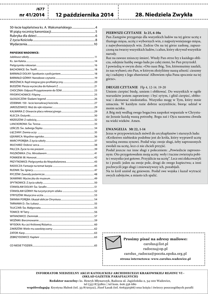 /677 nr 41/2014 12 października 2014 50-lecie kapłaństwa ks. A. Waksmańskiego................................4 W piątą rocznicę kanonizacji.............................................................5 Rubryka dla dzieci.................................................................................6 Z życia Kościoła ......................................................................................8 Wydarzenia............................................................................................10 PAPIESKIE WADOWICE: Jubileusz szkoły.................................................................................................................11 Ks. Jan Kaleta ......................................................................................................................14 Pielgrzymka rokowian ....................................................................................................16 BACHOWICE: Św. Teofil ...................................................................................................18 BARWAŁD DOLNY: Spotkanie z policjantem..........................................................18 BARWAŁD GÓRNY: Narodowe czytanie ...................................................................19 BRZEŹNICA: Rajd integracyjno profilaktyczny......................................................20 BUDZÓW: Piesza wycieczka do Kalwarii Z. .............................................................21 CHOCZNIA: Odpust/Przygotowanie do ŚDM ....................................................... 23 FRYDRYCHOWICE: Filipiny............................................................................................ 25 GŁOGOCZÓW: Śladami legend ...................................................................................26 IZDEBNIK: 150 - lecie konsekracji kościoła ..............................................................27 JAROSZOWICE: Weź do ręki różaniec........................................................................29 KALWARIA Z: Otwarcie placu rekreacyjnego.........................................................29 KLECZA: Dożynki...............................................................................................................30 KRZESZÓW: Z radością....................................................................................................32 LANCKORONA: Św. Teresa.............................................................................................33 LEŃCZE: Św. Jadwiga Śląska ........................................................................................ 34 ŁĄCZANY: Ziemia uczy ..................................................................................................35 ŁĘKAWICA: Wspólne ognisko.......................................................................................36 MARCYPORĘBA: Z życia szkoły....................................................................................37 MUCHARZ: Dobroć serca ...............................................................................................38 PALCZA: Życie to nie prezent .......................................................................................39 PASZKÓWKA: Z ks. Mirosławem..................................................................................41 PONIKIEW: Bł. Honorat....................................................................................................42 PRZYTKOWICE: Pielgrzymka do Niepokalanowa.................................................43 RADOCZA: Fantazje na temat karpia ........................................................................45 RUDNIK: Św. Ignacy..........................................................................................................47 RYCZÓW: Zawody pożarnicze..................................................................................... 48 SKAWINKI: Wycieczka do muzeum............................................................................49 SPYTKOWICE: Z życia szkoły.........................................................................................50 STANISŁAW DOLNY: Św. Serafin..................................................................................51 STANISŁAW GÓRNY: Na turystycznym szlaku .......................................................52 STRYSZÓW: Muzyczna uczta ........................................................................................53 ŚWINNA PORĘBA: Ukazał oblicze Chrystusa......................................................... 54 TARNAWA D.: Św. Łukasz................................................................................................55 TŁUCZAŃ: Św. Małgorzata.............................................................................................55 TOMICE: W Tatry ................................................................................................................56 WITANOWICE: Ziemniak.................................................................................................57 WOŹNIKI: Bierzmowanie................................................................................................59 WYSOKA: Ku czci Królowej Różańca......................................................................... 60 ZAKRZÓW: Wiele mu zawdzięczamy ........................................................................62 ZATOR: Karp ........................................................................................................................63 ZEBRZYDOWICE: Kapłani ..............................................................................................63 CO NIESIE TYDZIEŃ...........................................................................................................65 28. Niedziela Zwykła PIERWSZE CZYTANIE Iz 25, 6-10a Pan Zastępów przygotuje dla wszystkich ludów na tej górze ucztę z tłustego mięsa, ucztę z wybornych win, z najpożywniejszego mięsa, z najwyborn