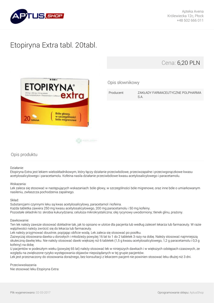 Apteka Avena Królewiecka 12c, Płock +48 502 666 011 Etopiryna Extra tabl. 20tabl. Cena: 6,20 PLN Opis słownikowy Producent ZAKŁADY FARMACEUTYCZNE POLPHARMA S.A. Opis produktu Działanie: Etopiryna Extra jest lekiem wieloskładnikowym, który łączy działanie przeciwbólowe, przeciwzapalne i przeciwgorączkowe kwasu acetylosalicylowego i paracetamolu. Kofeina nasila działanie przeciwbólowe kwasu acetylosalicylowego i paracetamolu. Wskazania: Lek zaleca się stosować w następujących wskazaniach: bóle głowy, w szczególności bóle migrenowe, oraz inne bóle o umiarkowanym nasileniu, zwłaszcza pochodzenia zapalnego. Skład: Substancjami czynnymi leku są kwas acetylosalicylowy, paracetamol i kofeina. Każda tabletka zawiera 250 mg kwasu acetylosalicylowego, 200 mg paracetamolu i 50 mg kofeiny. Pozostałe składniki to: skrobia kukurydziana; celuloza mikrokrystaliczna; olej rycynowy uwodorniony; tlenek glinu, prażony. Dawkowanie: Ten lek należy zawsze stosować dokładnie tak, jak to opisano w ulotce dla pacjenta lub według zaleceń lekarza lub farmaceuty. W razie wątpliwości należy zwrócić się do lekarza lub farmaceuty. Lek należy przyjmować doustnie, popijając obficie wodą. Lek zaleca się stosować po posiłku. Zazwyczaj stosowana dawka u dorosłych i młodzieży powyżej 16 lat to 1 do 2 tabletek 3 razy na dobę. Należy stosować najmniejszą skuteczną dawkę leku. Nie należy stosować dawki większej niż 6 tabletek (1,5 g kwasu acetylosalicylowego, 1,2 g paracetamolu i 0,3 g kofeiny) na dobę. U pacjentów w podeszłym wieku (powyżej 65 lat) należy stosować lek w niniejszych dawkach i w większych odstępach czasowych, ze względu na zwiększone ryzyko występowania objawów niepożądanych w tej grupie pacjentów. Lek jest przeznaczony do stosowania doraźnego, bez konsultacji z lekarzem pacjent nie powinien stosować leku dłużej niż 3 dni. Przeciwwskazania Nie stosować leku Etopiryna Extra: Plik wygenerowano: 02-03-2017 Oprogramowanie sklepu: AptusShop Apteka Avena Królewiecka 12c, Płock +48 502 666 011 Jeśli pacjent ma uczulenie na kwas acetylosalicylowy, paracetamol lub którykolwiek z pozostałych składników tego leku. Jeśli pacjent ma uczulenie (nadwrażliwość) na inne niesteroidowe leki przeciwzapalne, przebiegające z objawami takimi jak: skurcz oskrzeli, nieżyt nosa, pokrzywka, wstrząs. Jeśli pacjent ma astmę oskrzelową, przewlekłe schorzenia układu oddechowego, gorączkę sienną lub obrzęk błony śluzowej nosa, gdyż pacjenci z tymi schorzeniami mogą reagować na niesteroidowe leki przeciwzapalne napadami astmy, ograniczonym obrzękiem skóry i błony śluzowej (obrzęk naczynioruchowy) lub pokrzywką częściej niż inni pacjenci. Jeśli pacjent ma czynną chorobę wrzodową żołądka i (lub) dwunastnicy oraz stany zapalne lub krwawienia z przewodu pokarmowego (może dojść do wystąpienia krwawienia z przewodu pokarmowego lub uczynnienia choroby wrzodowej). Jeśli pacjent ma ciężką niewydolność wątroby, nerek lub serca. Jeśli pacjent ma zaburzenia rytmu serca. Jeśli pacjent cierpi na bezsenność. Jeśli pacjent ma zaburzenia krzepnięcia krwi (np. hemofilia, małopłytkowość) oraz gdy pacjent jest leczony jednocześnie środkami przeciwzakrzepowymi (np. pochodne kumaryny, heparyna). Jeśli pacjent ma niedobór dehydrogenazy glukozo-6-fosforanowej (rzadka choroba dziedziczna). Jeśli pacjent jednocześnie otrzymuje metotreksat w dawkach 15 mg tygodniowo lub większych, ze względu na szkodliwy wpływ na szpik kostny. Działania niepożądane Jak każdy lek, lek ten może powodować działania niepożądane, chociaż nie u każdego one wystąpią: Zaburzenia krwi i układu chłonnego małopłytkowość, niedokrwistość, krwawienia z przewodu pokarmowego, niedokrwistość hemolityczna u pacjentów z niedoborem dehydrogenazy, zwiększone ryzyko krwawień, wydłużenie czasu krwawienia, wydłużenie czasu protrombinowego. Zaburzenia układu immunologicznego Reakcje nadwrażliwości: świąd, wysypka, pokrzywka, rumień, zespół Stevensa-Johnsona, obrzęk naczynioruchowy, skurcz oskrzeli, wstrząs. Zaburzenia układu nerwowego Ból głowy, bezsenność. Zaburzenia oka Zaburzenia widzenia. Zaburzenia ucha i błędnika Szumy uszne, zaburzenia słuchu, zawroty głowy, odwracalna utrata słuchu. Zaburzenia układu oddechowego, klatki piersiowej i śródpiersia Obrzęk płuc pochodzenia pozasercowego (występuje głównie w przewlekłym lub ostrym zatruciu). Zaburzenia żołądka i jelit Niestrawność, zgaga, uczucie pełności lub pieczenia w nadbrzuszu, nudności, wymioty, biegunka, brak łaknienia, bóle brzucha, krwawienia z przewodu pokarmowego, uszkodzenie błony śluzowej żołądka, uczynnienie choroby wrzodowej, perforacje, zapalenie trzustki. Zaburzenia wątroby i dróg żółciowych Ogniskowa martwica komórek wątrobowych, tkliwość i powiększenie wątroby, szczególnie u pacjentów z młodzieńczym reumatoidalnym zapaleniem stawów, toczniem rumieniowatym układowym, gorączką reumatyczną lub chorobą wątroby w wywiadzie, przemijające zwiększenie aktywności aminotransferaz w surowicy, fosfatazy alkalicznej i stężenia bilirubiny. Zaburzenia skóry i tkanki podskórnej Wykwity skórne różnego rodzaju, świąd, rzadko pęcherze lub plamica. Zaburzenia nerek i dróg moczowych Białkomocz, obecność leukocytów i erytrocytów w moczu, nefropatia z martwicą brodawek nerkowych, śródmiąższowe zapalenie nerek. Zaburzenia ogólne i stany w miejscu podania Gorączka. Ostrzeżenia i środki ostrożności: Lek Etopiryna Extra zawiera olej rycynowy uwodorniony - może powodować ciężkie reakcje alergiczne. Lek należy przechowywać w miejscu niewidocznym i niedostępnym dla dzieci. Nie przechowywać w temperaturze powyżej 30°C. Stosowanie innych leków: Należy powiedzieć lekarzowi o wszystkich lekach, stosowanych przez pacjenta obecnie lub ostatnio, a także o lekach, które pacjent planuje 